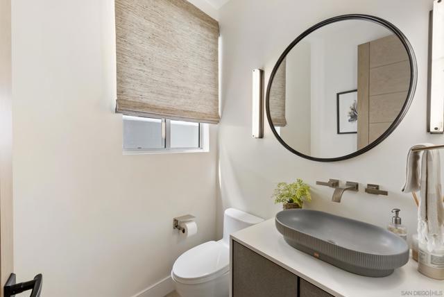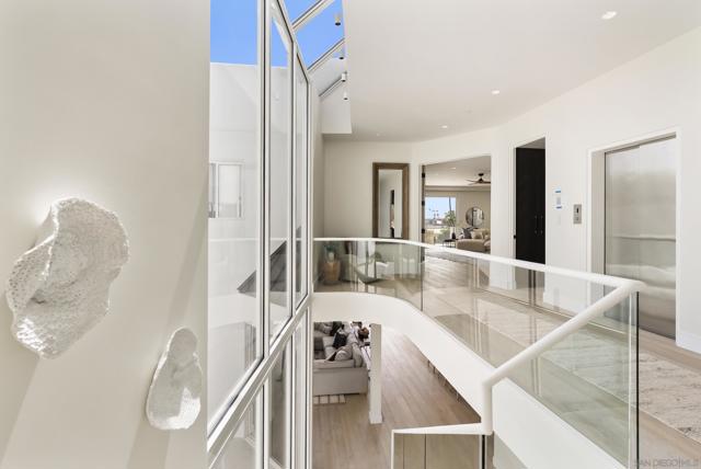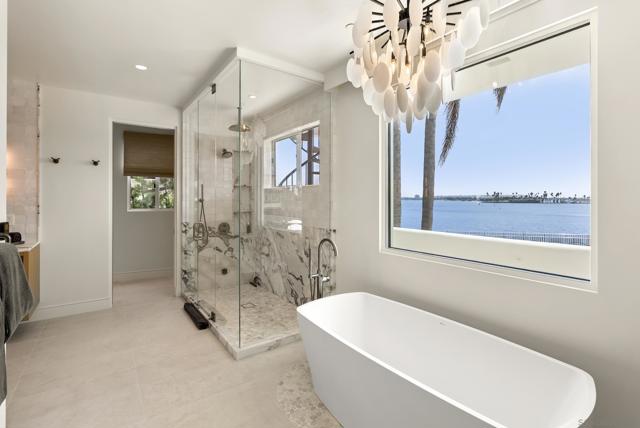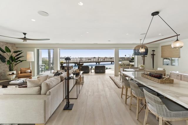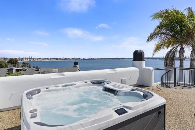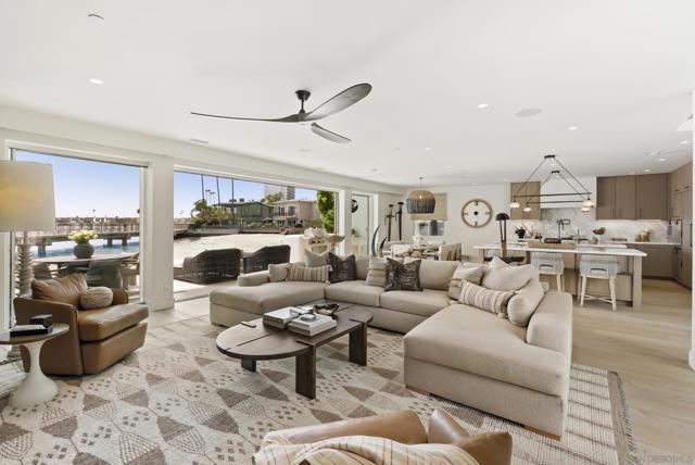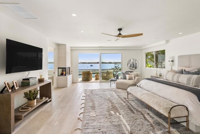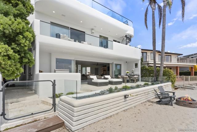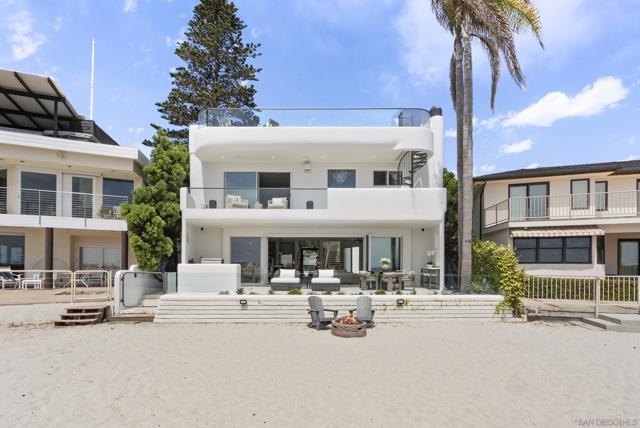 Set directly on the sand in a coveted Sail Bay enclave, this stunning soft contemporary residence has been extensively remodeled and thoughtfully reimagined to deliver refined coastal living with sweeping beach, bay, and city night-light views. Designed for effortless living and entertaining, the open-concept layout is framed by a dramatic two-story wall of glass and expansive sliding doors that open to a private inner courtyard with custom built-in fire feature and a spacious bayfront patio. Custom Aranelli Italian cabinetry is showcased throughout, paired with premium natural stone countertops imported from Italy and a top-tier Gaggenau appliance package. Wide-plank European White Oak flooring and carefully curated finishes create a warm, modern coastal aesthetic. The home offers four en suite bedrooms, five full baths, and three powder rooms, along with a dedicated office or optional fifth bedroom. Spa-inspired bathrooms feature handcrafted Zellige tile, luxury fixtures, and a steam shower in the primary suite. A whole-house water filtration system supports everyday comfort and peace of mind. The primary retreat provides water views, deck access, dual-sided fireplace, dual walk-in closets, and a luxurious bath. An elevator services all levels for effortless access throughout the home. The expansive rooftop deck includes a spa, built-in BBQ, and multiple seating areas with panoramic bay, beach, and city views, all within an intimate nine-home enclave with its own secluded beach cove. A rare blend of architectural sophistication, modern luxury, and true beachfront living.