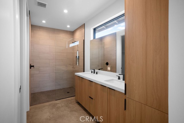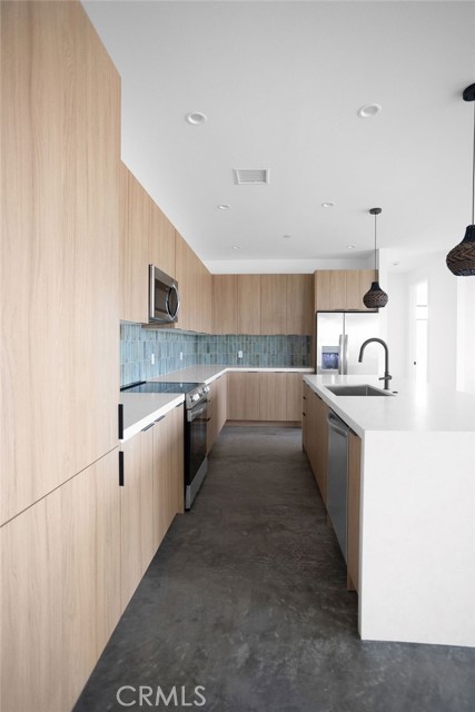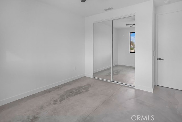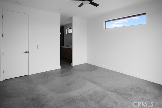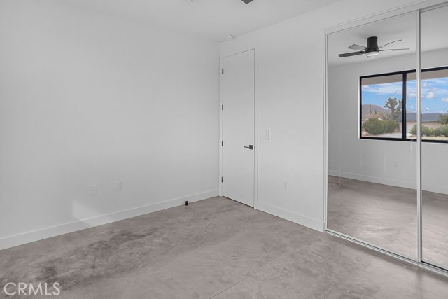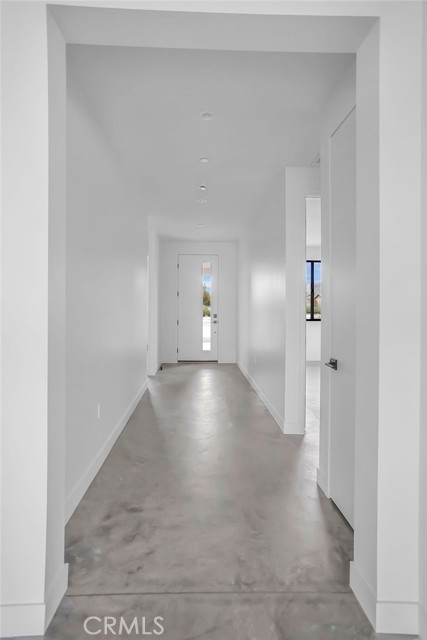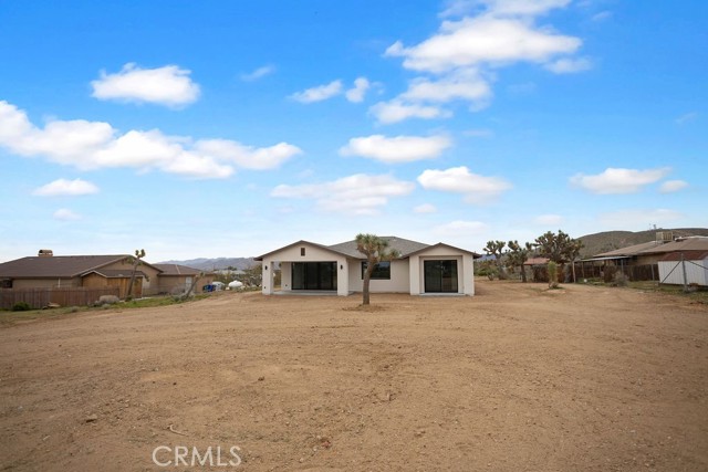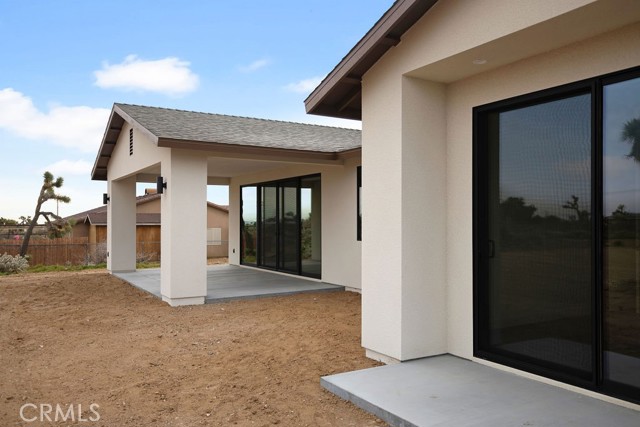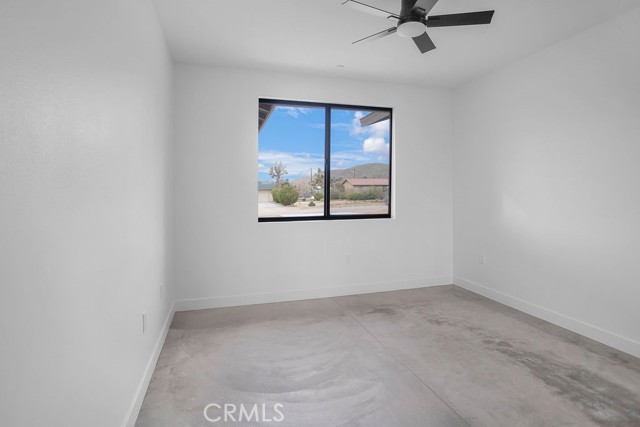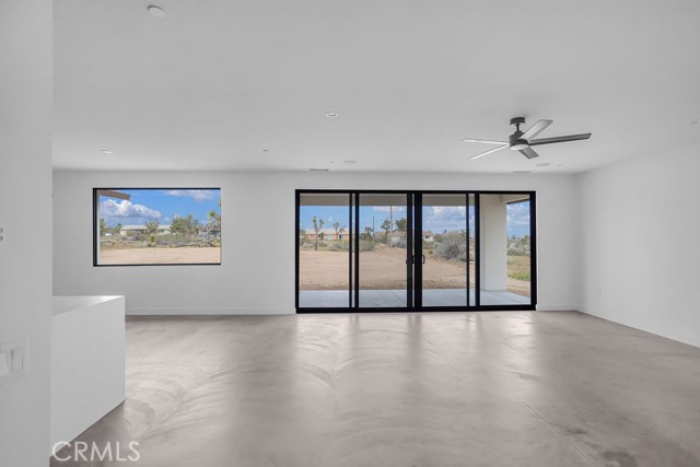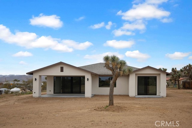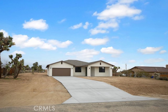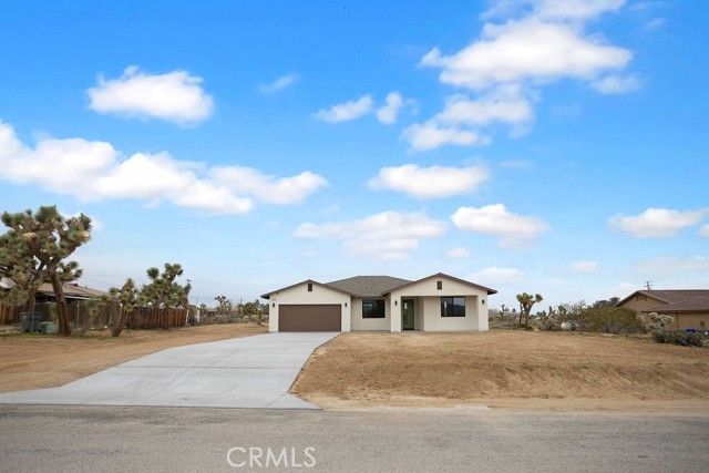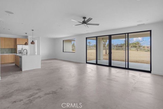 Modern desert architecture meets clean-lined minimalism in this newly built 2,047 square foot residence set on a 29,950 square foot parcel in Yucca Mesa. The design is intentional from the moment you enter. Polished concrete floors run throughout, creating a seamless visual foundation that pairs with warm natural wood cabinetry and matte black hardware. Expansive black-framed sliding glass doors open the living space to a covered patio, blending indoor and outdoor living against a backdrop of desert sky and mountain views. The kitchen anchors the home with a waterfall-edge island, quartz countertops, full-height artisan tile backsplash, stainless steel appliances, and integrated storage. Pendant lighting and recessed fixtures provide layered illumination while maintaining the home’s clean aesthetic. The primary suite offers a refined retreat with a custom-tiled walk-in shower, dual vanity, and modern finishes. Secondary bedrooms are thoughtfully positioned for privacy and flexibility. A dedicated laundry room with built-in cabinetry and utility sink enhances functionality. Owned solar contributes to energy efficiency and long-term savings. As new construction, the home benefits from updated systems, materials, and contemporary design throughout. Located in Yucca Mesa, known for its spacious parcels and open desert surroundings, just a short drive to dining, shops, and community events, and convenient access to Joshua Tree National Park. Buyer to verify all information including square footage, utilities, zoning, and solar specifications.