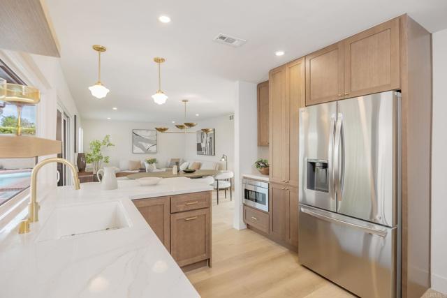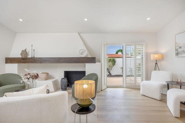 Impeccably remodeled, this Spanish-style retreat sits in the heart of Fountain Valley, offering timeless architectural charm paired with modern comfort. The home showcases wide-plank flooring, soft neutral tones, Spanish Revival detailing, and a bright, open layout anchored by a sweeping stucco fireplace that creates a warm and inviting living space. The designer kitchen features custom cabinetry, quartz countertops, stainless steel appliances, and elegant gold-accent fixtures, flowing seamlessly into the family and dining areas. Expansive sliding doors enhance the connection to the private courtyard and sparkling pool, creating a natural extension of the living space. The primary suite offers a serene, hotel-inspired ambiance with private atrium access. The spa-style en-suite bath includes dual vanities, an oversized glass-enclosed shower, and refined finishes. Additional bedrooms provide flexible space for guests, workspace, or fitness needs, complemented by a beautifully updated secondary bath featuring custom tilework. Outdoor spaces create a private oasis with a sparkling pool, brick patio decking, and a tranquil atrium lounge ideal for relaxing or entertaining. Conveniently located near parks, shopping, popular schools, dining, and commuter routes including the 405, this exceptional residence blends architectural character with the ease of coastal-close Southern California living.