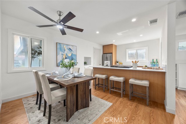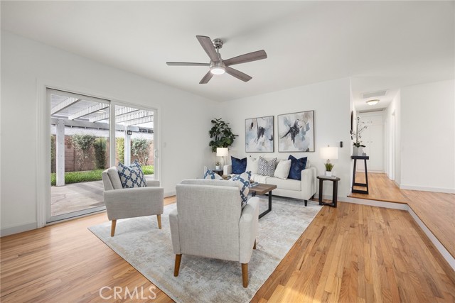 Recently renovated and move-in ready, this beautifully updated 3-bedroom, 2-bathroom single-level home offers 1,137 sqft of living space on a generous 6,200 sqft lot in desirable Huntington Beach—just a 15 minute drive to the beach! From the moment you arrive, you’ll appreciate the expansive front lawn and inviting curb appeal. Step inside to find beautifully refinished original hardwood flooring that flows throughout the entire home, including all bedrooms, creating warmth and continuity. The brand-new kitchen is a true highlight, featuring stunning quartz countertops, a convenient breakfast bar, recessed lighting, and new stainless steel appliances. New baseboards throughout the home add a crisp, modern touch. The dining area, living room and primary bedroom all feature ceiling fans for added comfort. Step down into the spacious living room where you’ll find built-in cabinetry and an inviting fireplace—perfect for relaxing evenings. A sliding glass door opens to the large backyard, complete with a patio cover and plenty of space with endless possibilities for outdoor entertaining, gardening, or future customization. The primary suite includes an ensuite bathroom with a walk-in shower and tile enclosure. Two additional bedrooms and a full bathroom complete the well-designed floor plan. Conveniently located near three elementary schools, Marina High School, Glen View Park, and a variety of local amenities including shopping and dining. With the beach just minutes away, this home offers the ideal blend of comfort, convenience, and coastal living. Don’t miss this opportunity—schedule your showing today!