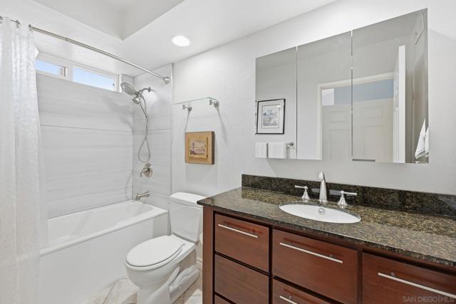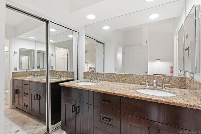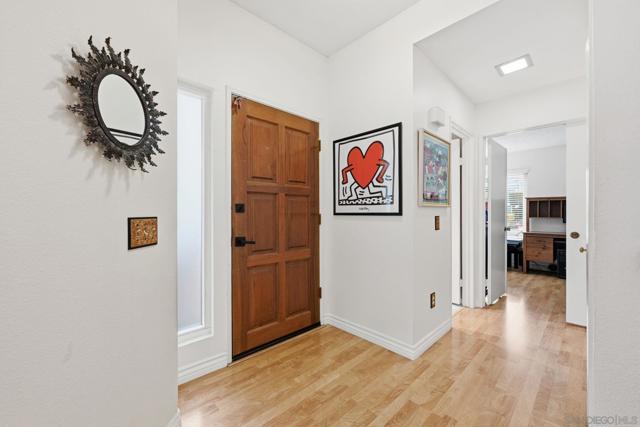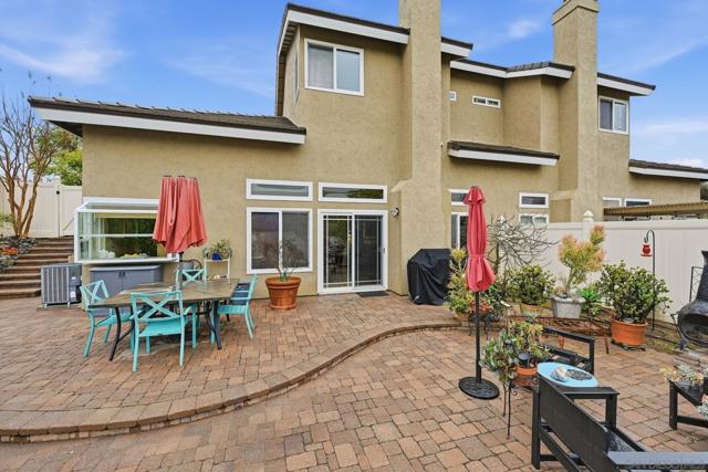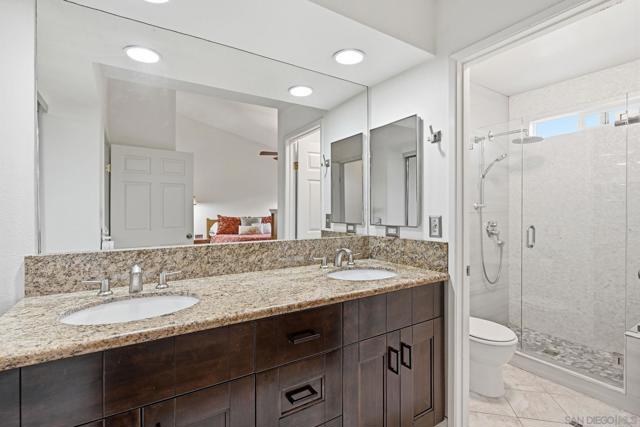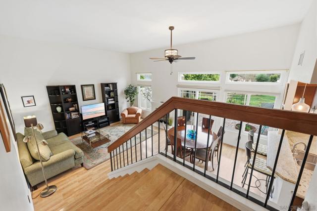 This immaculate two-story home is located in the highly desirable Westwood neighborhood of Rancho Bernardo. Low HOA and No Mello-Roos! Ideally situated with a neighborhood park right across the street, you’ll enjoy peaceful walking trails and beautiful mountain views just steps from your front door. Residents also have access to the Westwood Club, featuring a large pool and spa, gym, tennis courts, and expansive sports fields. Inside, tall ceilings in the living room and large windows fill the home with natural light. The open-concept living area is bright and welcoming, with a charming brick fireplace. The kitchen showcases granite countertops and backsplash, a convenient breakfast bar, and an impressive wall of built-in cabinetry complete with wine storage — perfect for entertaining and everyday functionality. A desirable entry-level bedroom and downstairs powder room provide flexibility for guests. Upstairs, both bedrooms feature vaulted ceilings and private ensuite bathrooms, creating spacious and comfortable retreats. The low-maintenance backyard is beautifully designed with gorgeous pavers and mature fruit trees, an inviting space to relax or host gatherings. Located within the award-winning Poway Unified School District and just minutes from easy freeway access, shopping, and dining, this home offers the ideal blend of comfort, convenience, and lifestyle.