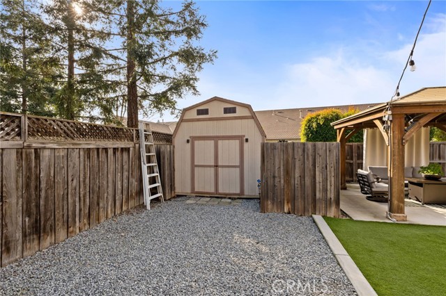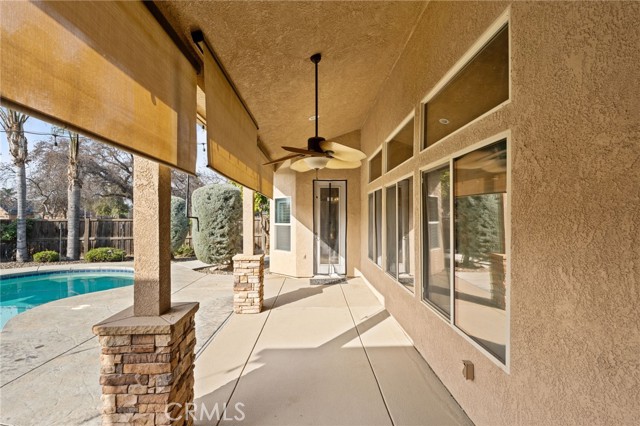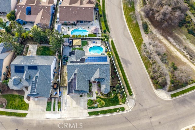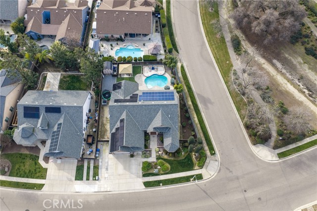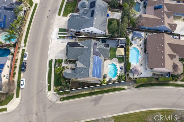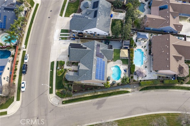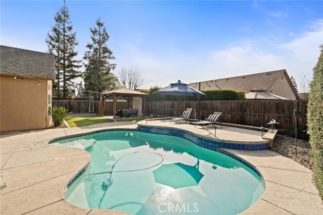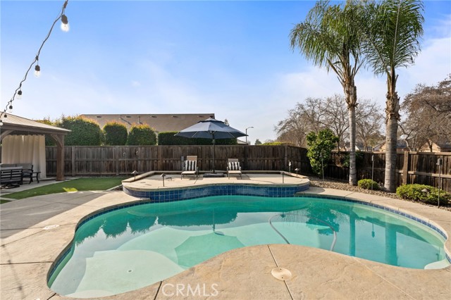 Situated on a desirable corner lot in the highly sought-after Hurley School District, this beautifully maintained 4-bedroom, 3-bath home offers nearly 3,000 square feet of thoughtfully designed living space. From the moment you arrive, the charming curb appeal and mature landscaping set the tone for a home that balances comfort, function, and style. Inside, the bright and open floor plan is ideal for both everyday living and entertaining. The spacious great room features a cozy fireplace and built-in cabinetry, while formal living and dining areas provide flexibility for gatherings or quiet retreats. The kitchen is a standout with granite countertops, custom cabinetry, a center island with secondary sink, updated appliances, and an inviting eat-in dining space that flows seamlessly into the main living area. The primary suite offers a true retreat with dual vanities, a soaking tub, oversized walk-in shower, and generous walk-in closet. Step outside to your private backyard oasis, complete with a sparkling pool, covered patio, storage shed and pergola - perfect for summer entertaining or relaxing evenings at home. Additional highlights include owned solar, a 3-car garage, an abundance of storage and gated RV parking with hookups. Conveniently located near shopping, parks, golf courses, and freeway access, this home checks all the boxes for comfortable Central Valley living.
