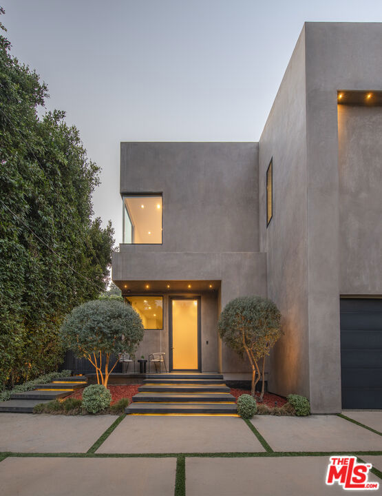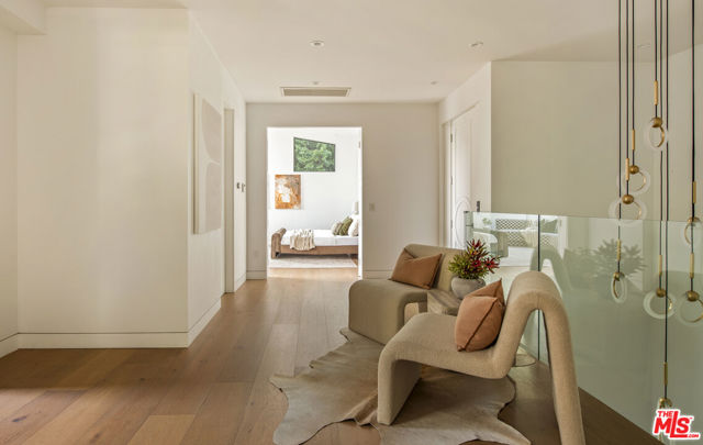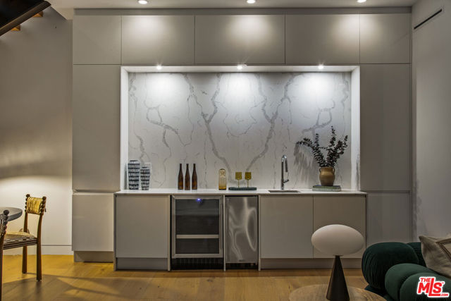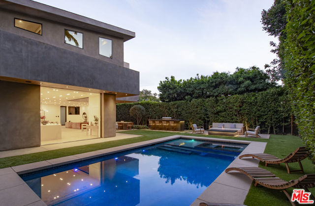 Perfectly positioned behind towering privacy hedges in Beverly Hills, this modern oasis sets a new standard of contemporary living, blending elevated design with the quintessential California lifestyle. A luminous open floor plan is framed by soaring ceilings and expansive gallery-style windows. Retractable Fleetwood walls-of-glass dissolve the boundary between inside and out. Wide-plank oak floors, a sleek fireplace, open dining area, and stylish powder room anchor the main living spaces. The European-inspired chef's kitchen is appointed with waterfall countertops, Miele appliances, wine storage, and refined custom finishes. The primary suite is scenic, with a spa-like bathroom and private balcony. Three additional ensuite bedrooms, along with multiple bonus/flex rooms are ideal for an office, den, gym, or maid's quarters. Designed for elevated entertaining, the lower level hosts a lounge with two bars, powder room, and a state-of-the-art screening room. Outdoors, an expansive patio overlooks a secluded, resort-style backyard complete with a sparkling pool and spa, outdoor kitchen, and fire pit. Crowning the residence is a stylish rooftop deck with fire pit, offering city and canyon views. Additional highlights include automated smart-home technology, surround sound, elevator, gated entry with circular driveway, and a two-car garage. Just minutes from the heart of Beverly Hills, this exceptional Modern estate presents a rare opportunity to own a feature-rich, design-forward home.