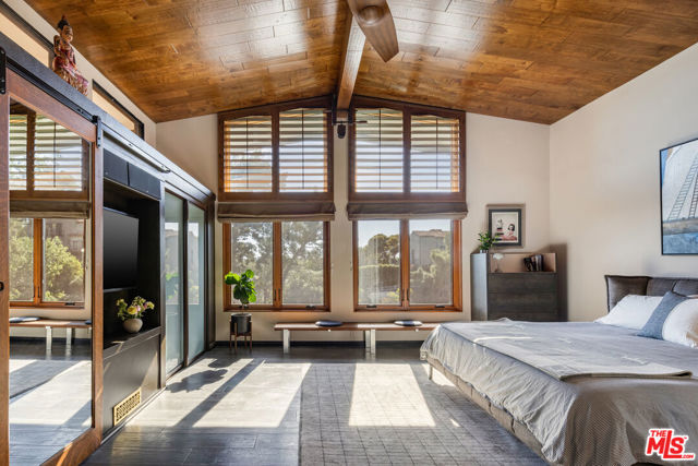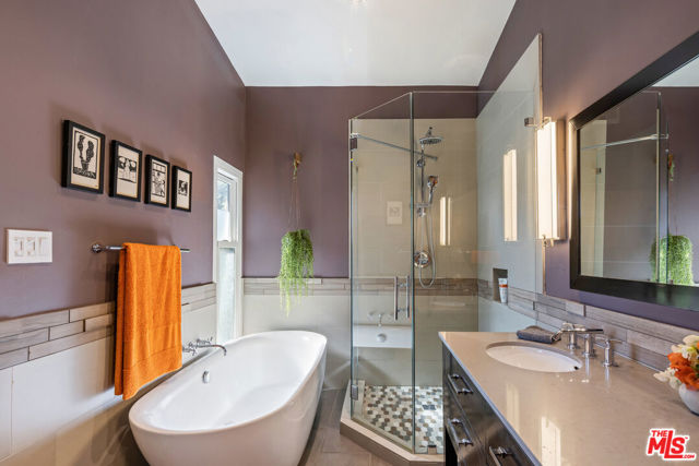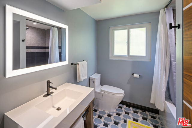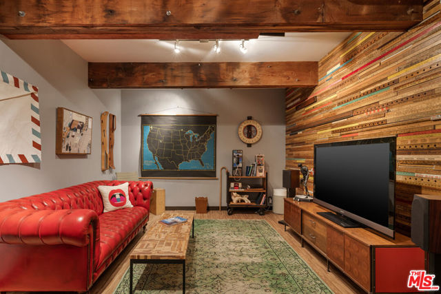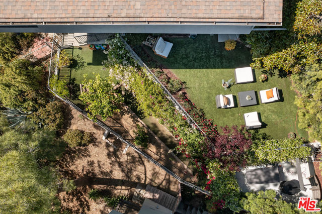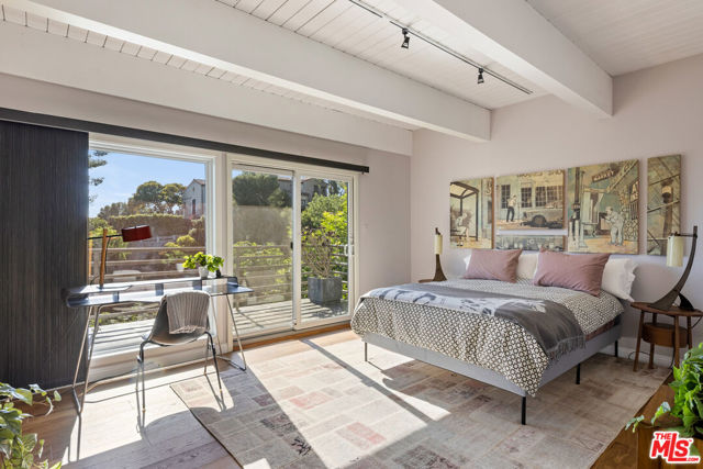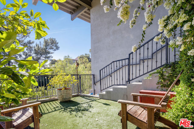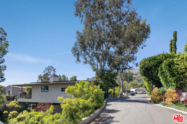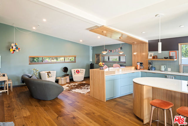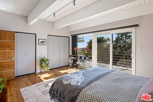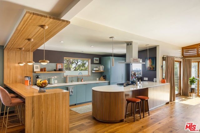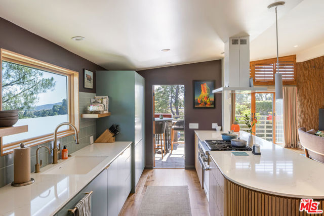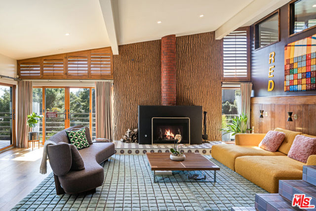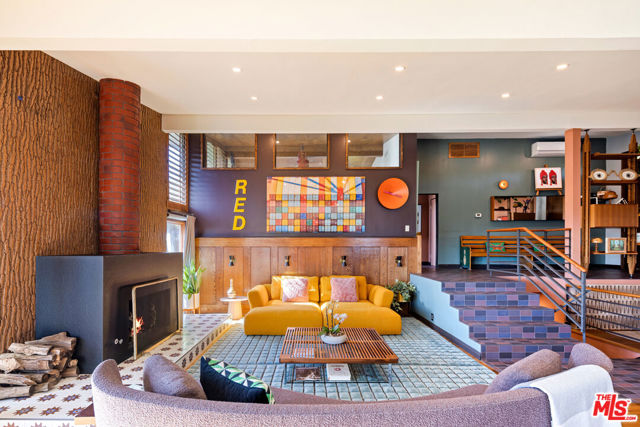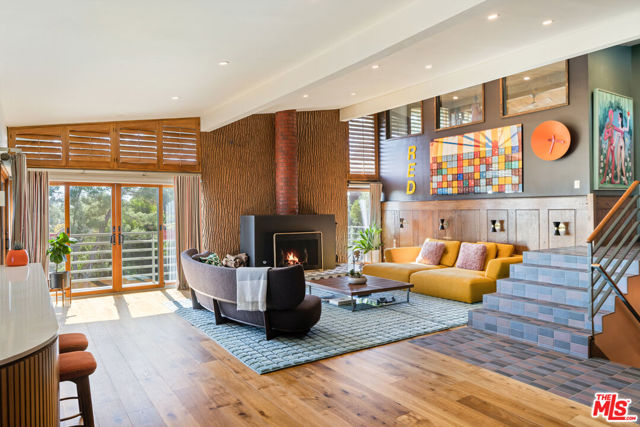 Mid-Century Modern Retreat with Iconic Views & Inspired Design. Tucked away on a quiet, coveted street just below the Hollywood Sign, this sophisticated Mid-Century Modern residence blends creative soul with elevated craftsmanship. Surrounded by historically significant and architecturally notable Hollywood Hills homes, the setting carries a sense of legacy and understated sophistication unique to this storied enclave. Designed with intention and owned by Hollywood creatives, the home balances artistic expression with livable luxury. Warm walnut floors, artisan wall coverings, and a striking, one-of-a-kind fireplace wrapped in a real tree trunk anchor the main living space. Walls of glass frame sweeping treetop, hillside, and neighborhood views, filling the home with natural light and showcasing the character of the surrounding architecture. Two balconies one off the kitchen and one off the guest suite offer tranquil vantage points for morning coffee or evening unwind, with layered views stretching from historic hillside homes to distant city skylines spanning Downtown Los Angeles and Century City. The chef's kitchen is a sculptural showpiece featuring soft blue cabinetry, fluted wood paneling, a wraparound breakfast bar, and designer Roll & Hill pendant lighting. High-end Thermador appliances, upgraded plumbing, and added insulation enhance everyday function. Nearly all windows and sliding doors have been replaced with high-efficiency Renewal by Andersen upgrades, maximizing comfort, energy efficiency, and panoramic views. Downstairs, a versatile bonus room provides flexibility as a media lounge, home gym, or creative studio, complemented by a stylish laundry area and thoughtful design details. Outdoors, the multi-level yard offers a private hillside retreat with mature avocado and citrus trees, lush landscaping, and multiple areas for outdoor enjoyment serene, intimate, and distinctly Hollywood Hills. Additional highlights include owned solar panels, an EV charger, a full seismic retrofit completed in 2019 by McGrath, a Post alarm system, California Closets throughout, and a one-car carport. A rare blend of character, calm, and creativity, this timeless architectural sanctuary captures the essence of refined Hollywood Hills living.