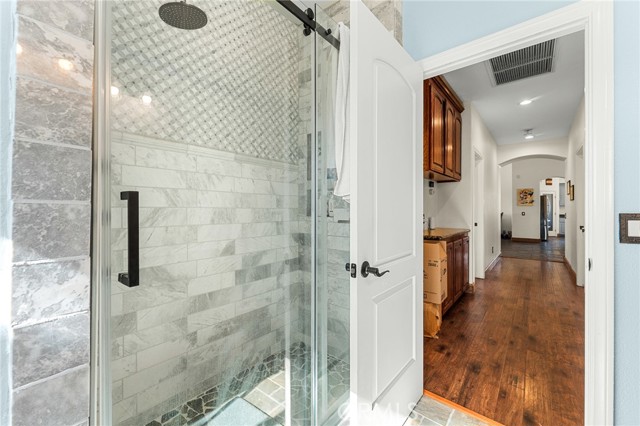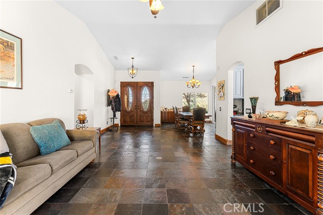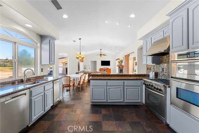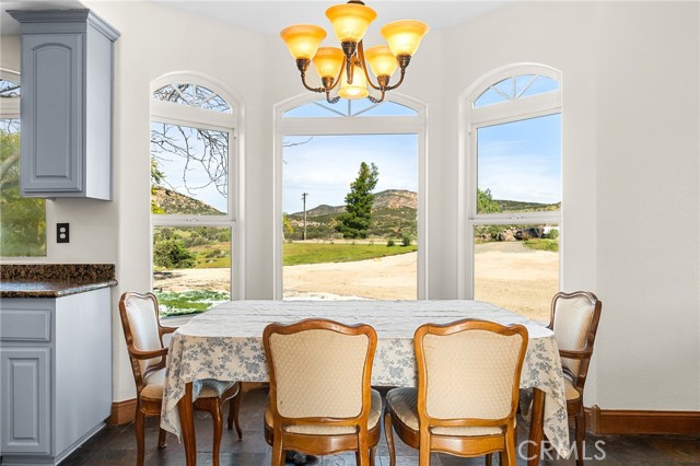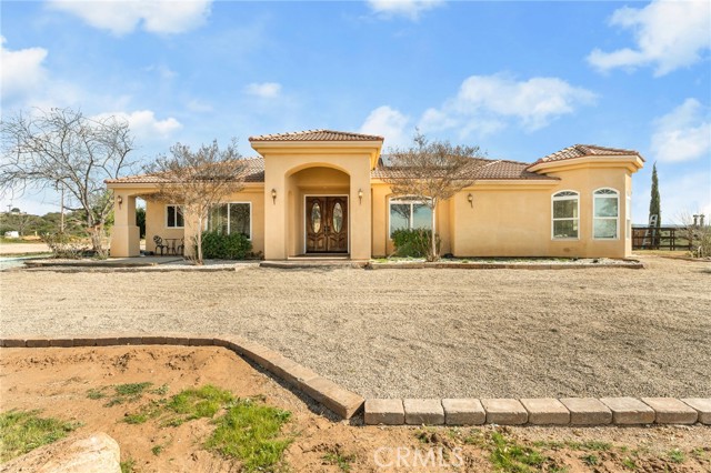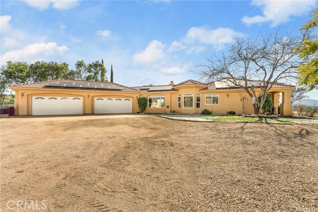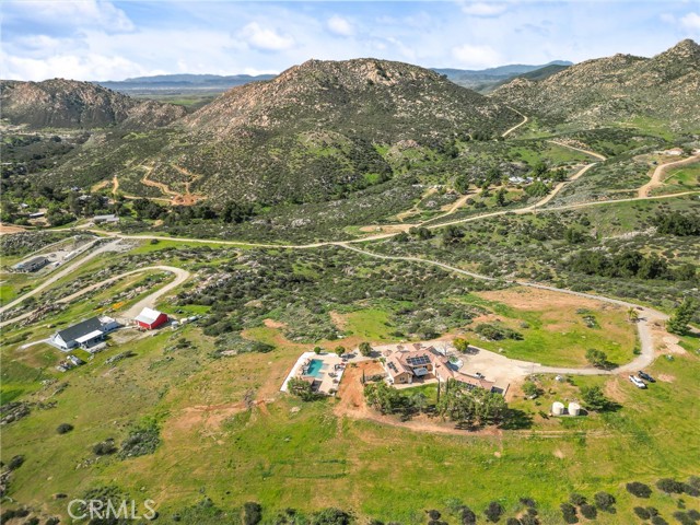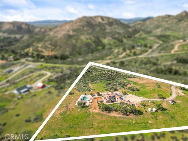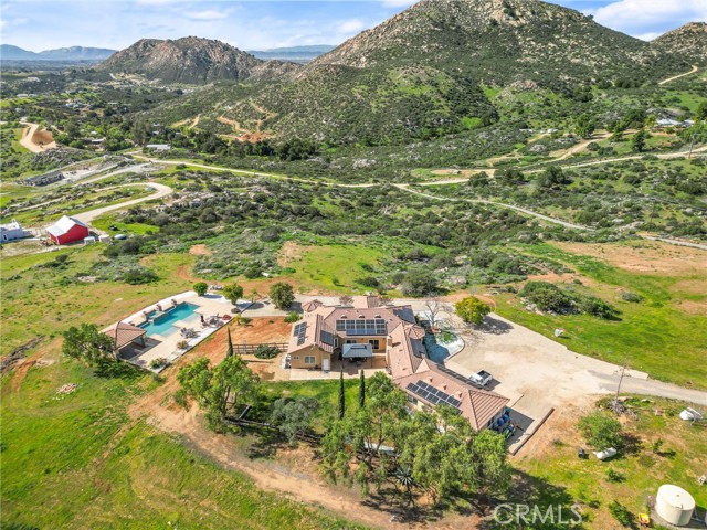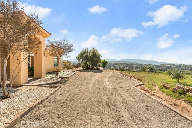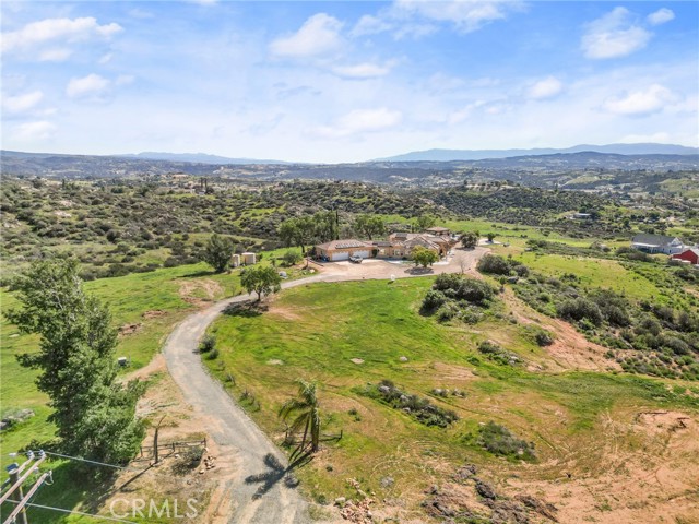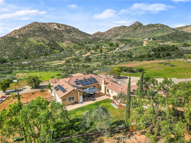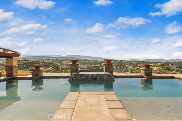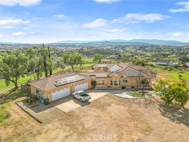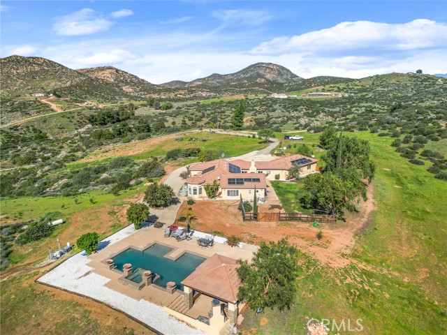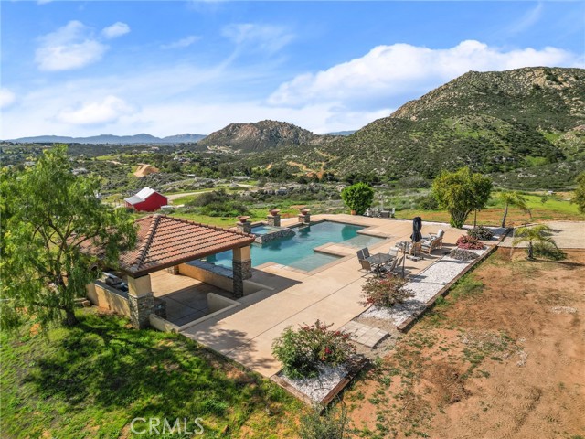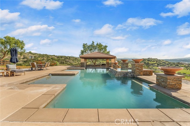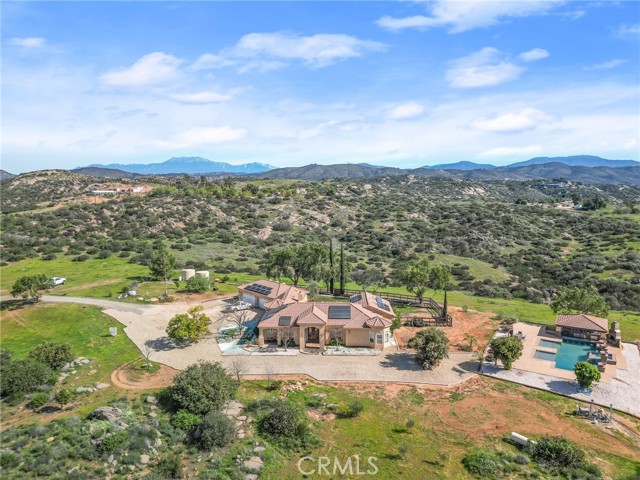 Experience serene country living in Temecula Wine Country at this stunning single-story ranch estate. Nestled within the Oakridge Ranches community, this custom-built home offers privacy, panoramic views, and refined indoor-outdoor living on nearly 10 acres of gently rolling hillside. Constructed to be view centric, each window and door is a portal to breathtaking valley and hillside views. Spanning 2,844 square feet, this thoughtfully designed residence features 4 spacious bedrooms and 2.5 bathrooms, with a functional single-level layout that unites the common areas and provides privacy for the bedroom wing. The kitchen is well appointed with stainless steel appliances, commercial range, double ovens, granite counter tops, and breakfast bar seating. Designed for unforgettable gatherings, the backyard is a true showpiece. The pool and attached pavilion are masterfully integrated into the natural hillside, creating an opulent resort-style experience while preserving the unobstructed panoramic views. At over 40’ long, the pool offers dual baja steps, expansive stained decking, and a raised spa with a cascading waterfall. A swim up bar is adjacent to the attached pavilion. Soaring ceilings with exposed roughhewn lumber shade the outdoor kitchen, fireplace, bar, and entertainment areas. This outstanding build out can accommodate nearly any gathering or simply serve as a restful retreat to enjoy the sunset from. A fire pit lounge and multiple outdoor seating areas complete this private retreat. Additional highlights include a 4-car attached garage with ample space for toys and storage, private well, solar power system, room for horses, and exceptional privacy. Blending natural terrain, a stately residence, staggering views, and an exceptional backyard pool build, this is one extraordinary offering.