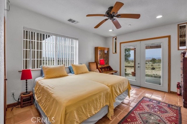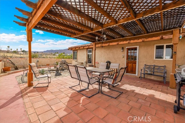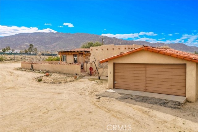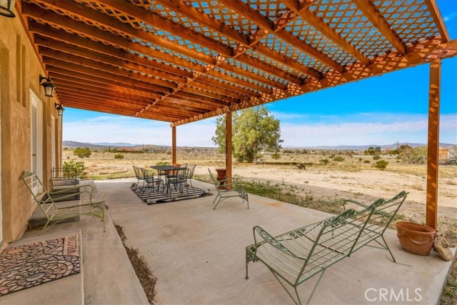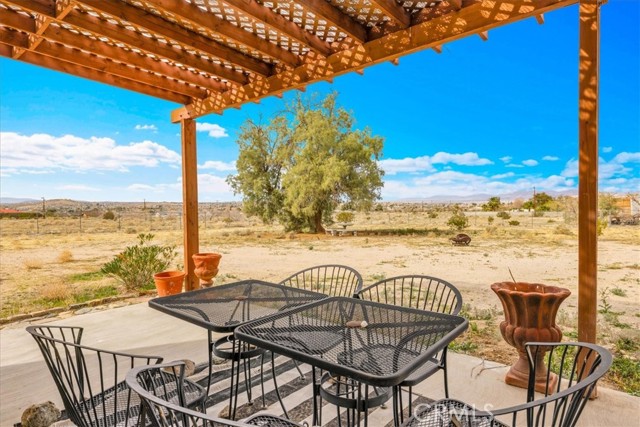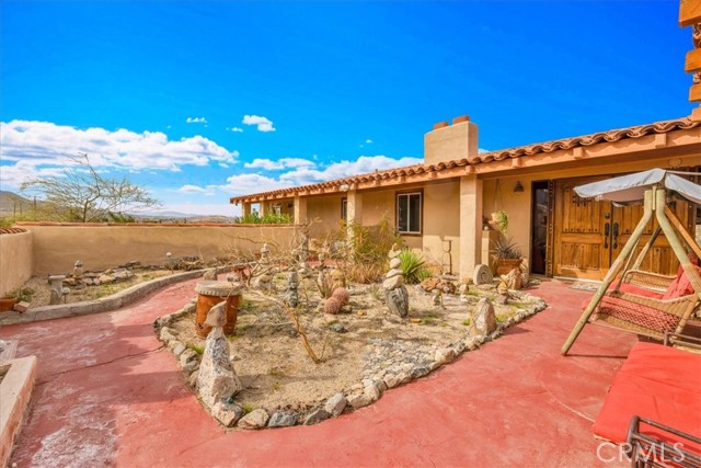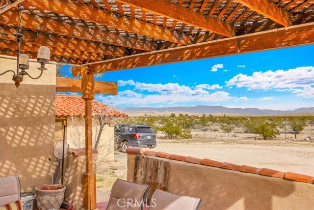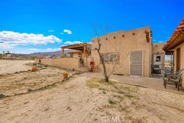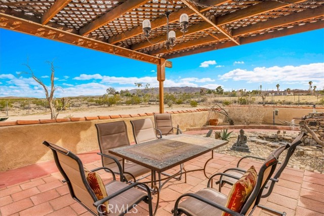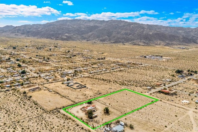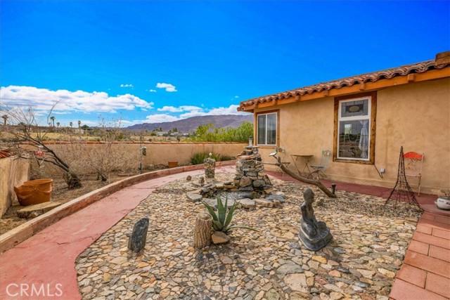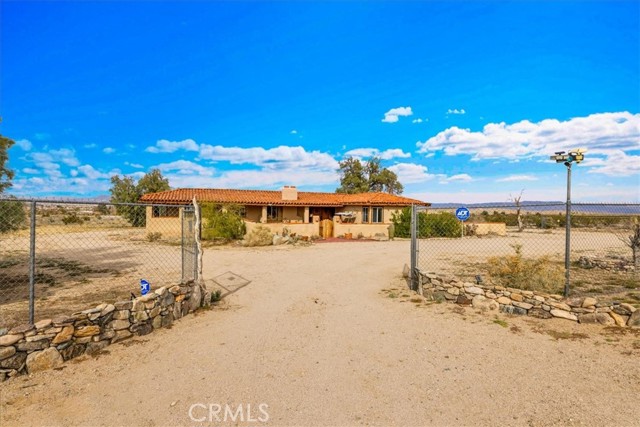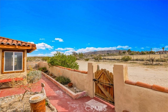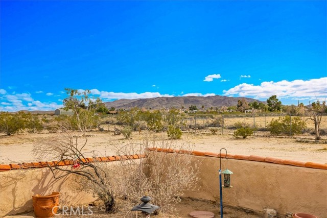 Located in the desirable Hanson Area on Foothill Drive, just minutes from the Joshua Tree National Park Visitor Center, this approximately 5-acre foothill property offers privacy, space, and sweeping desert views. The single-story residence spans approximately 2,421 square feet with three bedrooms and three bathrooms and an additional half bath. A gated courtyard entry leads into an open floor plan featuring Saltillo tile flooring, recessed lighting, and expansive gathering spaces designed for indoor-outdoor living. The kitchen includes granite countertops, a center island, range, oven, microwave, dishwasher, and generous cabinetry. The dining and living areas flow seamlessly to French doors that open to patios positioned to capture the surrounding mountain and valley views. Each bedroom includes its own bathroom, with private exterior access from multiple rooms, creating flexibility for guests or extended living arrangements. The property is served by septic and offers city water connection. Central heating and air conditioning are installed, along with evaporative cooling. Propane is used for central heating, with electric systems serving the remainder of the home. Additional features include a detached garage, security gate, rain gutters, fireplace, and a large shipping container that conveys with the property. Set near hiking trails, open land, and park access, this Foothill Drive location combines foothill elevation, proximity to town, and desert privacy. Buyer to verify all information including square footage, utilities, well production, zoning, and intended use.