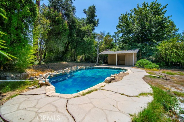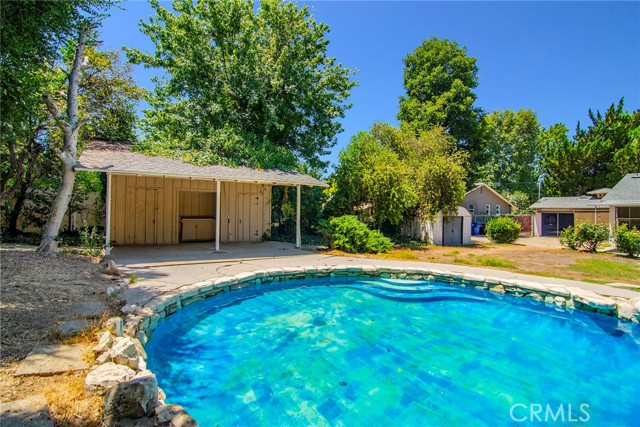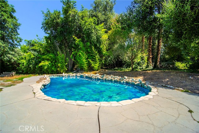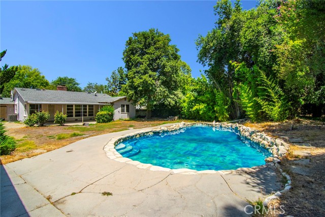 South of the Blvd RANCH HOME on over 1/2 acre lot!!!!! 4 Bedrooms + 2 Bathrooms with oversized covered patio, NEWLY REFINISHED POOL & tons of flat useable land. Original hardwood floors throughout, fresh paint, vaulted wood beam ceilings in the family room, charming brick gas fireplace, huge converted garage with slider out to the rear yard and endless potential awaits. Make your way up the circular driveway in this ultra desirable area of Woodland Hills and enjoy the splendors this charming cottage has to offer. Owners pay for gardener and pool maintenance. Don't forget....24k+ Sq. Ft. FLAT LOT!!!!!!