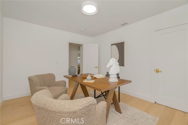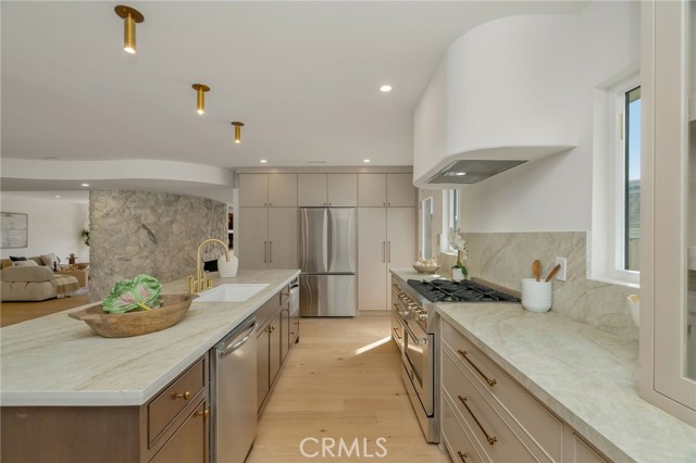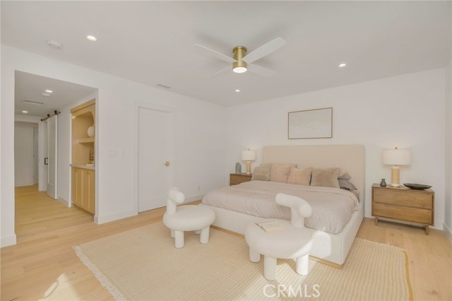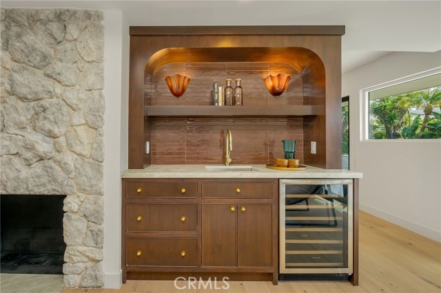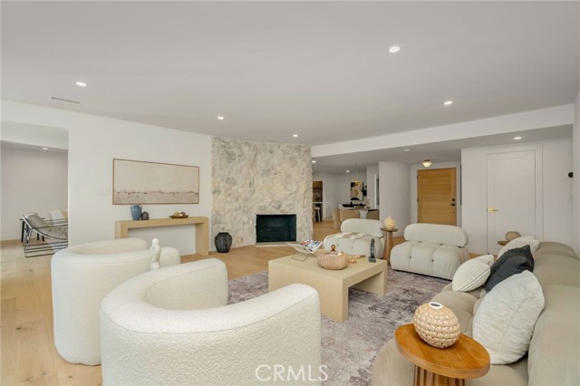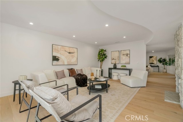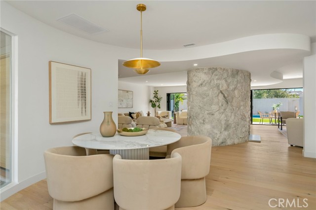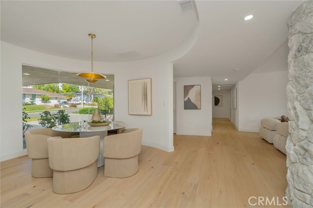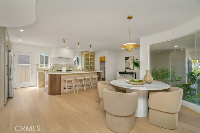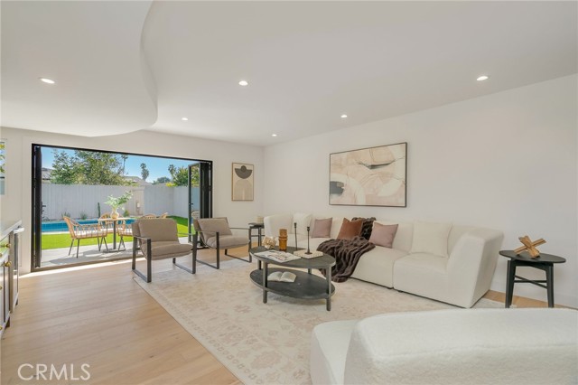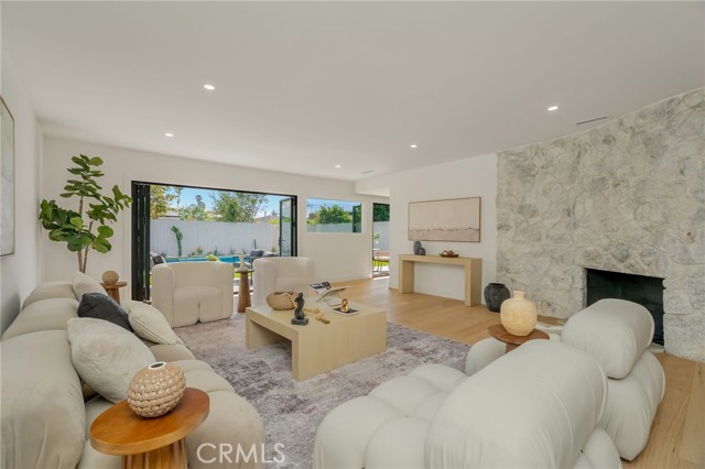 6150 Wooster Avenue is a beautifully remodeled single-level midcentury home in desirable Ladera Heights, blending timeless architectural design with modern upgrades. Light-filled interiors showcase dramatic curved ceilings, a curved floor-to-ceiling glass dining alcove, a sculptural dual stone fireplace serving both living and family rooms, and a stylish wet bar that enhances the home’s entertaining appeal. The remodeled kitchen features premium appliances, refined finishes, and a spacious center island that opens seamlessly to the main living areas. The primary suite offers a walk-in closet and spa-inspired bath with dual vanities, soaking tub, glass-enclosed shower, and custom tilework. Additional bedrooms offer flexibility for guests, a home office, or growing households. Expansive bi-fold doors open to a private backyard with pool and modern landscaping, creating seamless indoor–outdoor flow. An attached three-car garage offers direct access and ample parking.