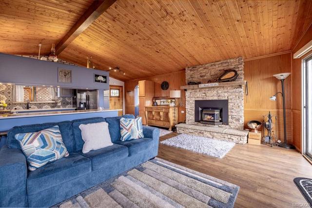 Endless views steal the show at this Fawnskin retreat, offering a cozy, treehouse-like feel with the spectacular lake and mountain scenery you've been dreaming of. Step out onto the expansive deck and take in sweeping panoramas of the surrounding National Forest, Big Bear Lake, the San Gorgonio mountain range, Snow Summit--and even front-row seats to the July 4th fireworks. Inside, the great room invites you to relax with a stunning ledger-stone fireplace, vaulted ceilings with warm tongue-and-groove wood finishes, and newer Pergo hardwood flooring. The beautifully recently remodeled kitchen opens seamlessly to the living area and features upgraded Frigidaire slate stainless appliances and elegant quartzite countertops. The primary bedroom offers direct access to a cozy sunroom--for enjoying the morning light and peaceful forest views. A versatile bonus room provides endless possibilities as a third bedroom, home office, or hobby space. Additional highlights include owned solar panels and a generator wired for battery backup, a carport with a Level 2 EV charger, an under-house workshop, and a fenced area for kids and pets. This one truly checks every box--an absolute must-see!