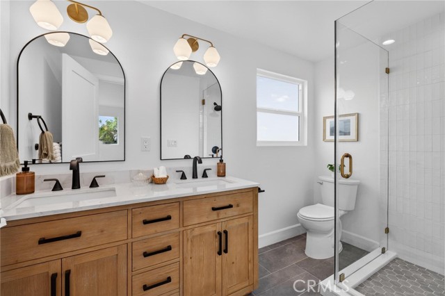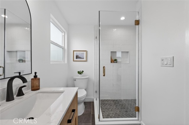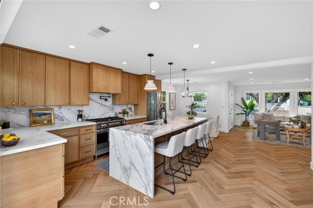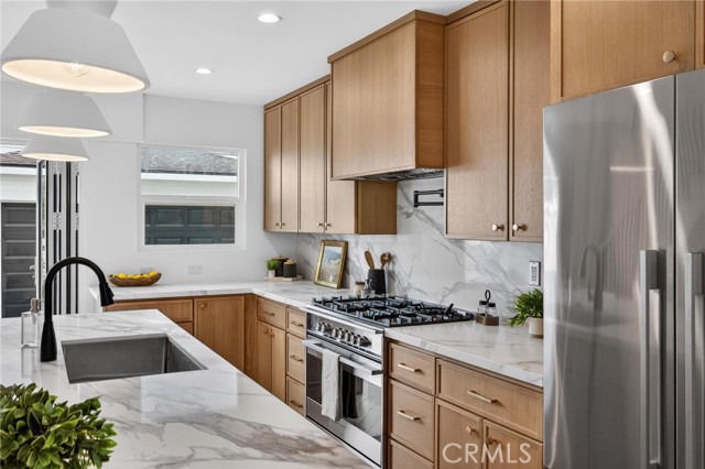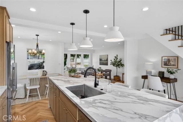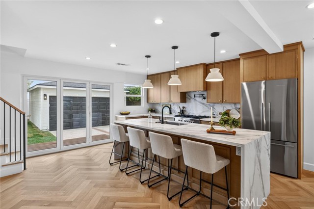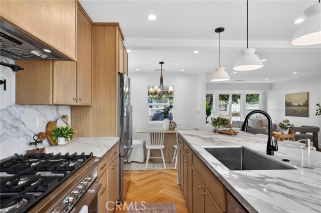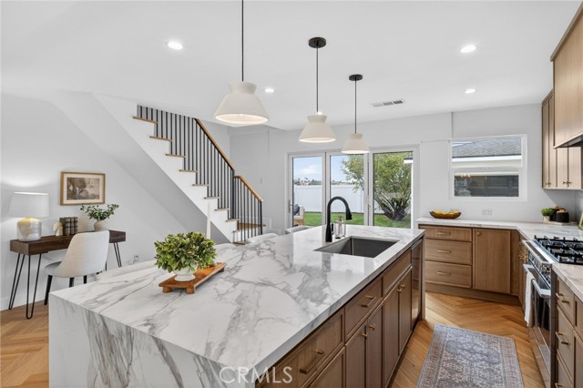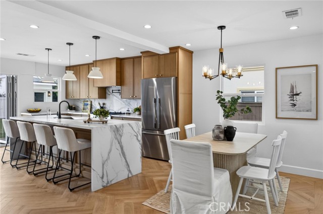 From its full-scale renovation to its light-filled layout and prime Manhattan Beach location, 1167 Magnolia Ave is a beautifully reimagined 4-bedroom, 3-bathroom home offering comfort, style, and a coveted Liberty Heights address. Inside, the open-concept living area flows seamlessly from the living room to the dining space and into a designer kitchen featuring a large quartz island with waterfall edges, matching quartz backsplash, Fisher & Paykel appliances, and a 6-burner range with pot filler. Accordion-style 8-foot bifold doors lead out to a newly built all-weather Trex deck and a spacious, flat backyard, perfect for effortless entertaining and play. Two downstairs bedrooms and a remodeled full bathroom offer flexibility for guests or a home office setup, while upstairs features another generous bedroom, an updated full bath, and a serene primary suite complete with a walk-in closet and a beautifully remodeled ensuite bath with dual vanities and an oversized shower. Throughout the home, engineered hardwood floors and energy-efficient windows bring warmth and light to every corner, while thoughtful tech touches like a Google Nest smart thermostat and doorbell offer modern convenience. The detached, front-facing garage is fully drywalled, EV-ready, and positioned at the back of the lot—opening up additional possibilities for creative use or future expansion. Additional improvements include a brand-new roof, upgraded 200-amp electrical panel with all-new wiring, new plumbing throughout, and a new high-efficiency heat pump HVAC system. Freshly landscaped front and back yards with automatic sprinklers complete this move-in-ready package. Located just 1.4 miles from the beach and Manhattan Beach Pier, and only blocks from Meadows Elementary, Manhattan Beach Middle, Polliwog Park, and local shops and dining, this home delivers the best of Manhattan Beach living with nothing left to do but move in and enjoy.
