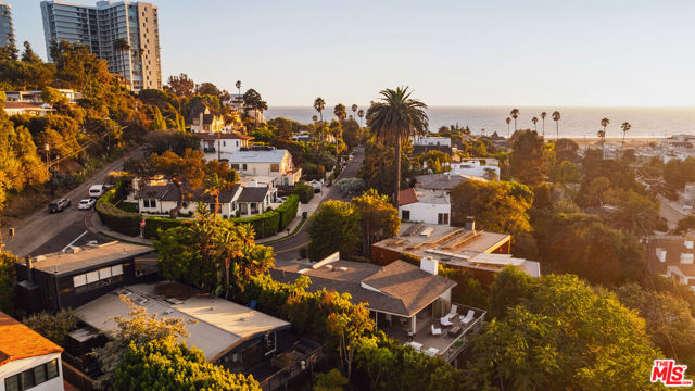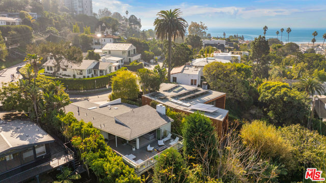 Located in the coveted Santa Monica Canyon, this reimagined coastal contemporary blends mid century character with sleek modern design in one of the Westside's most prestigious enclaves. Designed for seamless indoor outdoor living, it's a home that delivers both everyday comfort and year round entertaining in equal measure. The main level features a dramatic living room with soaring ceilings, a fireplace, custom built cabinetry, a statement fireplace, and walls of glass framing serene treetop and canyon views. Accordion glass doors fold open to create a fluid connection to the outdoors, where expansive decks invite relaxation in the coastal breeze. The open concept kitchen and dining area feature bespoke walnut cabinetry, skylights, built in bar shelving, and top tier stainless steel appliances, skylights, with direct access to an outdoor lounge deck. A full bedroom and bathroom, currently styled as a home office, complete this level. The lower level offers three spacious en suite bedrooms, including a serene primary suite with a private balcony overlooking the grassy yard. The spa inspired bath is appointed with a freestanding tub, walk in shower, and a brand new custom vanity. Two additional suites provide generous accommodations for family or guests. Features & Upgrades include a Whole House Filtration System for pure, clean water throughout, a Battery Backup Power Supply ensuring seamless comfort and security, an EV Charger for effortless electric vehicle convenience, and a two car garage with ample storage. Unmatched access to the best of coastal living: moments to the beach, Ocean Avenue bluffs, and Santa Monica Stairs. Stroll to Montana Avenue boutiques, artisan coffee shops, and award winning dining or head minutes north to Palisades Village and Malibu. The home sits within the highly acclaimed Canyon Charter Elementary School district, in a leafy enclave prized for its walkability, privacy, and sea salt air.