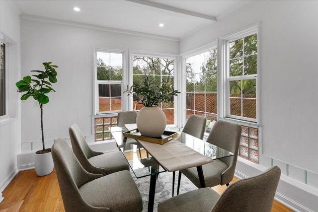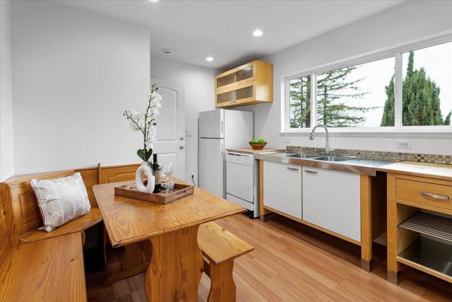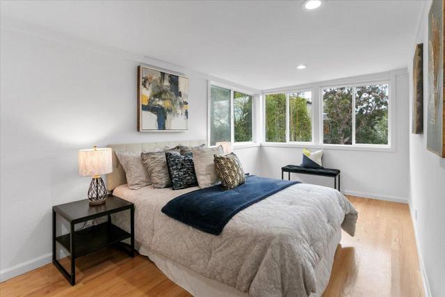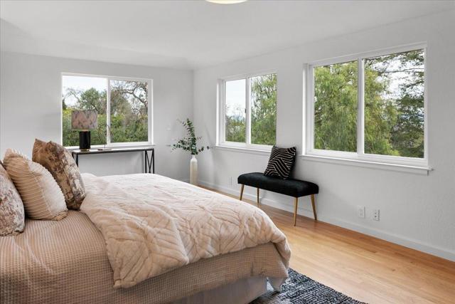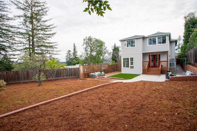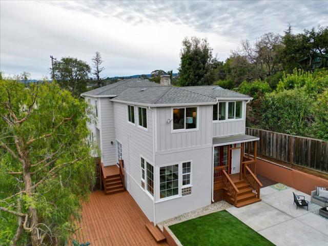 Serenity meets versatility in this beautifully remodeled two-story retreat in desirable Lower Emerald Hills. Set on a large, scenic lot with sweeping Peninsula views, this 2,455 sq. ft. home offers tranquility just minutes from downtown Redwood City and major commuter routes. A tiled foyer with generous storage welcomes you into a formal living room with a wood-burning fireplace and French doors to a sunlit deck. The bright dining room features large windows, stylish tile, and glass block accents. The remodeled kitchen shines with natural stone counters, white soft-close cabinetry, farmhouse sink, stainless steel appliances, and French doors to a spacious private backyard. A half bath and laundry room sit nearby. Upstairs are three spacious bedrooms and a full bath with double vanity. A private-entry artists studio with kitchenette and full bath adds exceptional flexibility.