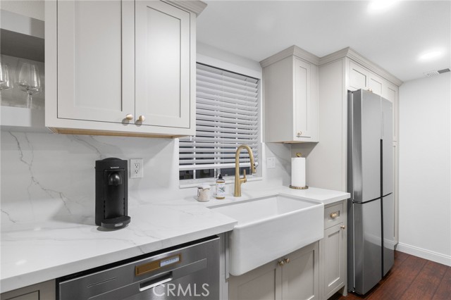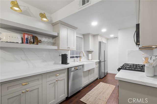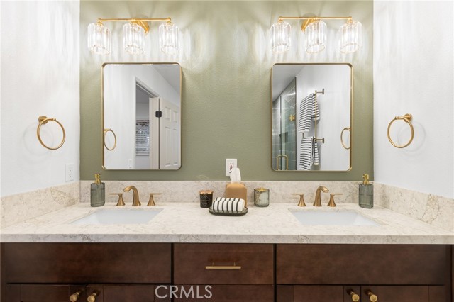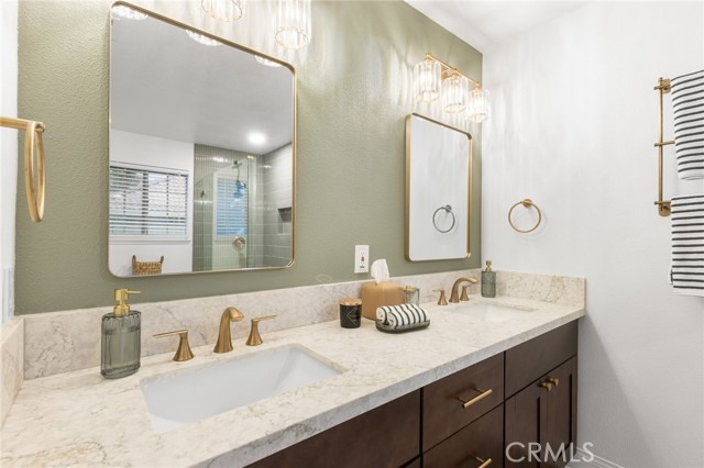 Remodeled three-bedroom, two-and-a-half-bath home featuring modern, cohesive finishes throughout in a convenient Covina location. The bright, open floor plan offers well-designed living spaces with all bedrooms upstairs and a half bath downstairs for guests, creating a functional layout suited for today’s lifestyle. The kitchen showcases quartz countertops, soft-close cabinetry, a farmhouse-style sink, and coordinating gold-tone faucets and fixtures. Quartz surfaces continue throughout all bathrooms, complemented by brand-new vanities, new tile flooring, and matching gold-tone hardware, retreat-style design. The secondary bathroom includes a bathtub, while the primary suite features a walk-in closet and a private ensuite with a walk-in shower. Additional features include in-garage laundry with storage, direct-access two-car garage, one additional assigned parking space, and a private front patio with a small garden area designed for low-maintenance care. Convenient access to the 210, 10, and 57 freeways, and located near Glendora Marketplace Shopping Center, Glendora Public Market, and nearby dining and retail amenities. A turnkey residence offering elevated design in the heart of Covina.