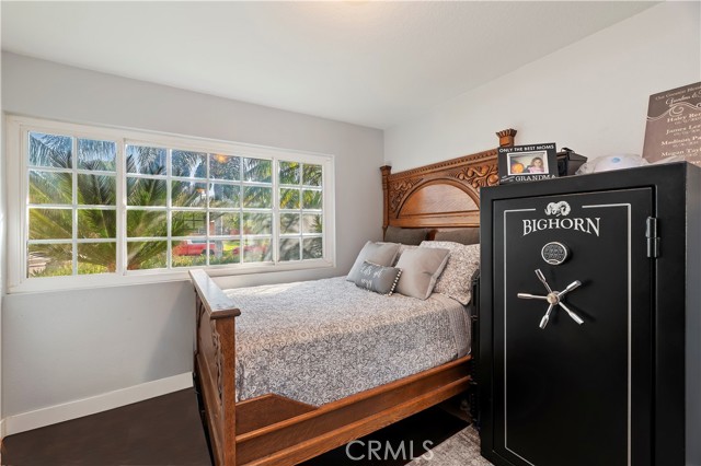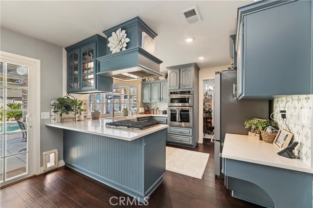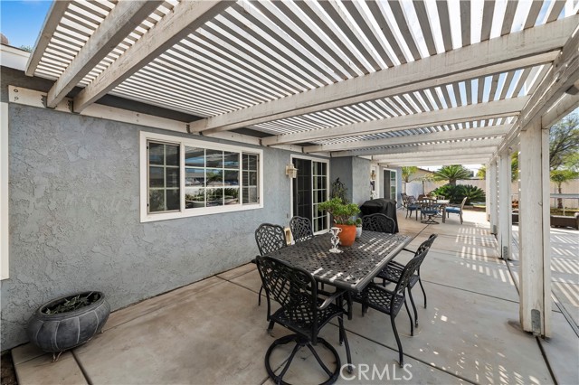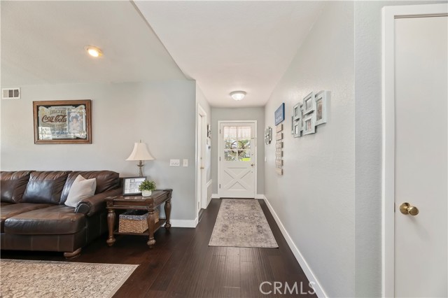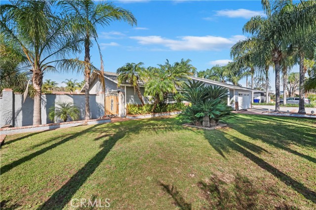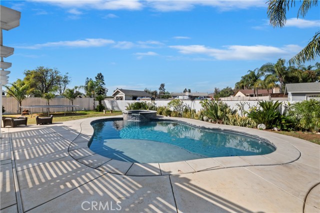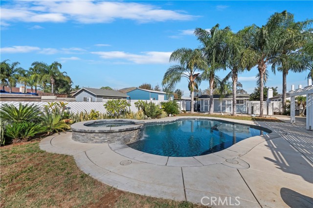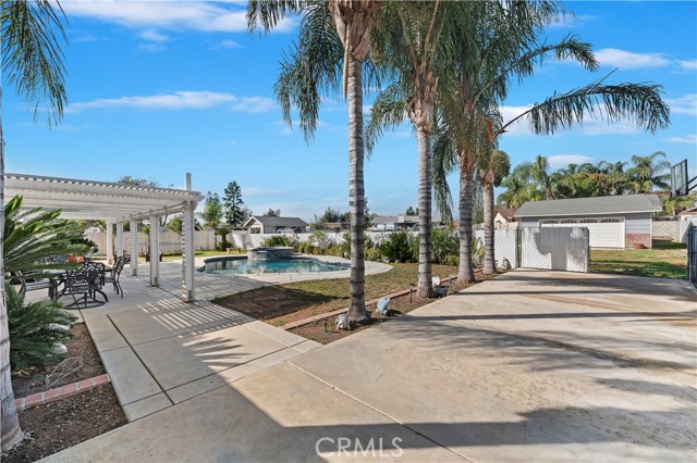 Nestled on a tranquil cul-de-sac, this stunning 1/2 acre single-story home welcomes you with a palm tree-lined walkway leading to a sunlit paradise. Step inside and be greeted by elegant hardwood floors that seamlessly flow from the living room to the dining room and throughout the rest of the house, creating a warm and inviting atmosphere. The heart of the home is the beautifully remodeled kitchen, boasting luxurious quartz countertops, sleek stainless steel KitchenAid appliances, and recessed lighting that illuminates the space with a gentle glow. Adjoining the kitchen is the cozy family room, complete with a charming brick fireplace, perfect for relaxing or entertaining guests. Venture down the hallway to discover the private bedrooms, including the exquisite primary bedroom featuring an attached bath that has been fully remodeled to perfection. Indulge in luxury with a custom vanity, Moen fixtures, and a custom tiled shower that exudes elegance and style. The guest bathroom has also been thoughtfully updated, ensuring both comfort and convenience for residents and visitors alike. Outside, the backyard oasis awaits, featuring a sparkling pool with a raised spa, creating a perfect setting for relaxation and entertaining. Additionally, the property includes a 24x24 workshop, multiple storage sheds, pipe corrals, and RV access into the backyard, providing endless possibilities for hobbies, storage, and outdoor activities.Don't miss the opportunity to make this dream home yours – where every detail has been meticulously designed for modern living and luxurious comfort.