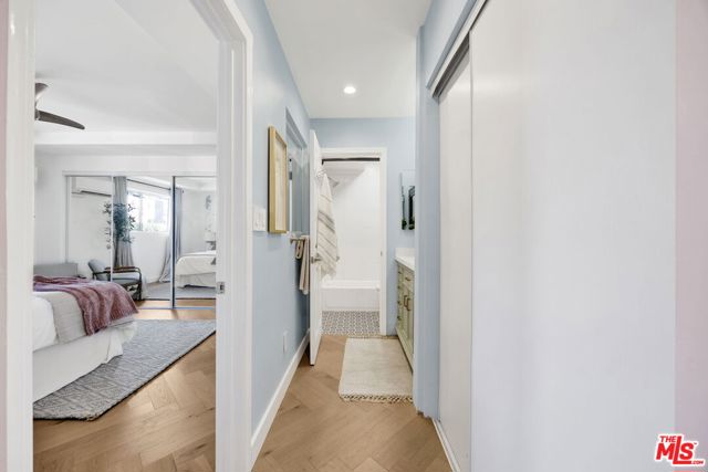 Welcome to this beautifully remodeled 1-bedroom, 1-bathroom condo offering a stylish blend of modern updates and functional design. The open layout is filled with natural light and features herringbone natural-hardwood floors, a convenient study nook, and recessed lighting. The updated kitchen is complete with newer cabinets, stainless steel appliances (refrigerator, dishwasher, microwave, and electric stove), and a reverse osmosis water filtration system. The bathroom showcases Neo-Moorish tile, a modern vanity, and a TOTO toilet with bidet attachments. Additional upgrades include in-unit laundry, new A/C split systems, a designer ceiling fan, and a coffered ceiling in the bedroom. A private balcony provides an outdoor extension of the living space. Located in the heart of Hollywood, with a partial view of the iconic Hollywood Sign landmark, this residence offers walkable proximity to dining, entertainment, and shopping.