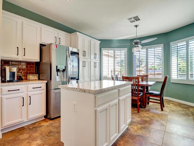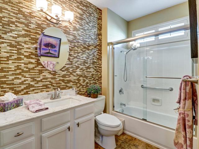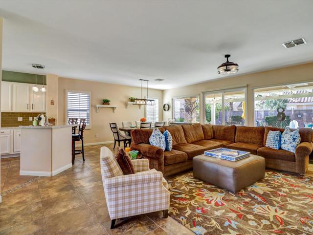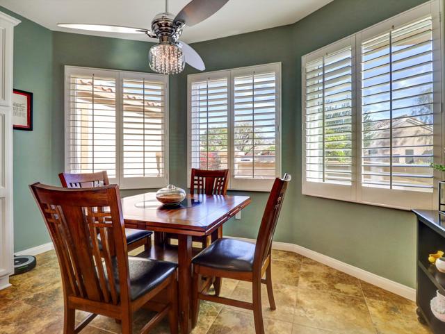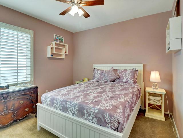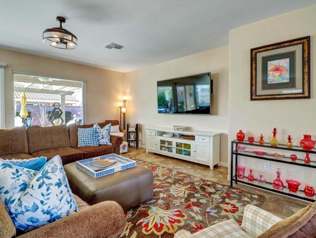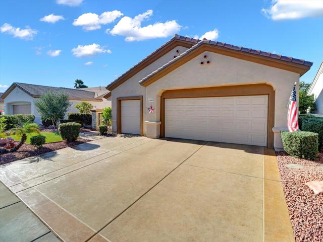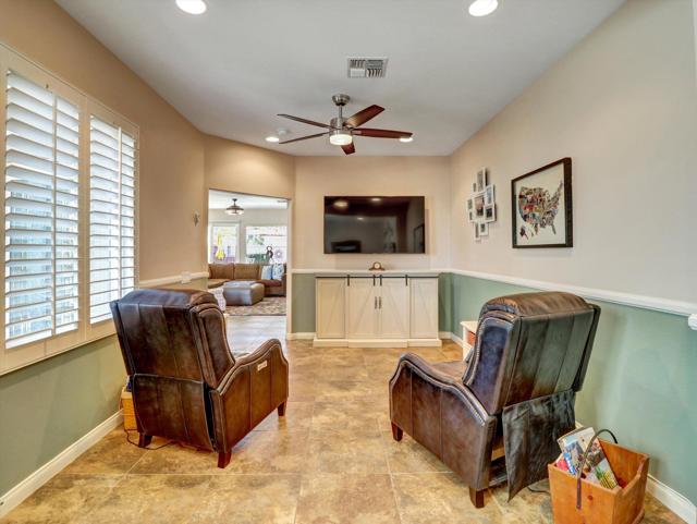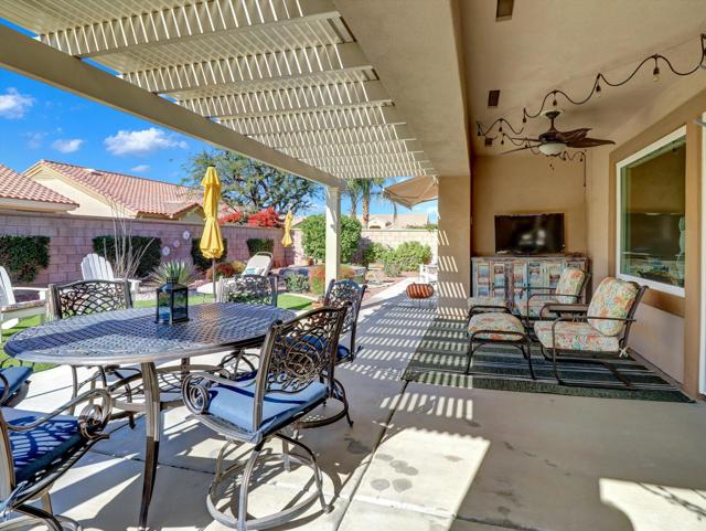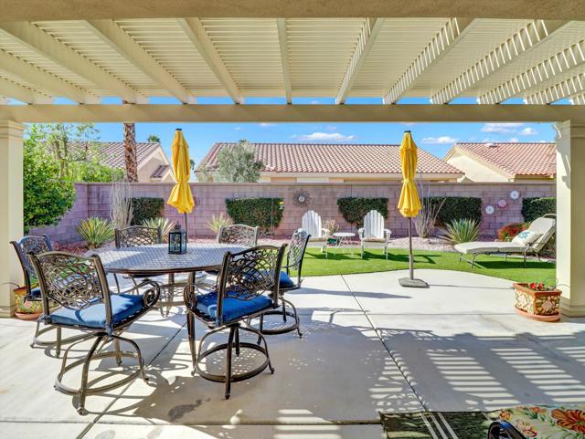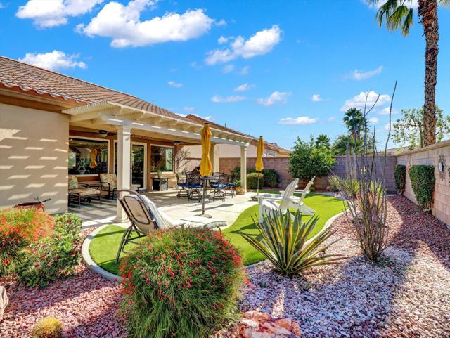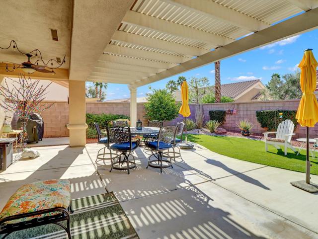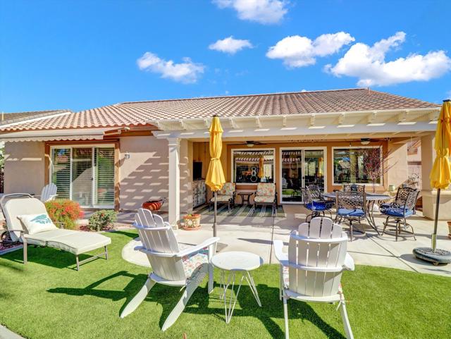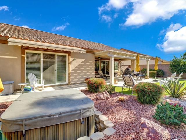 Extensively upgraded home located in Sun City Palm Desert, a premier 55+ active adult community recognized as one of the top 8 Senior Communities. Outstanding curb appeal with decorative rock front columns, redesigned front yard featuring artificial turf and trees, and custom drive and walkway with freshly restored colored overlay. Front door enhanced with glass insert and all windows throughout the home replaced in 2021 with energy efficient glass.Interior features plantation shutters throughout, tile in all traffic areas, premium carpet in bedrooms, and a bright, open layout ideal for everyday living and entertaining. Den/Office Hobby room with inside access. Remodeled kitchen offers white lacquered cabinetry, added pantry, quartz countertops, stainless steel appliances, unique farmhouse sink, updated ceiling fixtures, and recessed lighting. Oversized primary suite includes blackout shade for comfort and privacy with a private sitting area. Primary bathroom fully remodeled with new tile, granite countertops, upgraded cabinetry, fixtures, and remodeled shower. Guest bathroom updated with granite counters, new fixtures, lighting, and tub enclosure. Additional shelving in primary closet and supplemental storage in guest bedroom closet.Garage features an epoxy style painted floor, custom cabinetry, and extensive overhead storage racks and extra fridge. Central air conditioning replaced in 2017. Living room and Office/Den televisions included with hidden wiring. Exterior awning at primary bedroom recently serviced with all new fabric.Private backyard redesigned for low-maintenance living with expanded concrete patio. Alumawood patio cover, patio fans and lighting, flat screen TV, gas BBQ, jacuzzi tub, and low maintenance artificial turf.Sun City Palm Desert amenities include two Billy Casper championship golf courses, a natural grass 18-hole putting course, world class practice facilities, and 3 PGA professionals to help with your game. There are 8 lighted tennis courts, 12 lighted pickleball courts and a tennis pavilion. The 3 clubhouses contain 3 restaurants, a sports Bar, Martini Bar, and Coffee House. A 600+ seat auditorium and 200+ seat theatre for entertainment. There are 4 heated pools and spas (including one indoor), 2 fitness centers (one with an indoor track), 11 lakes, walking trails to keep you fit and 85+ clubs.Low HOA, Spectrum high-speed internet and TV with movie and sports channels included. More info at SCPDCA.com