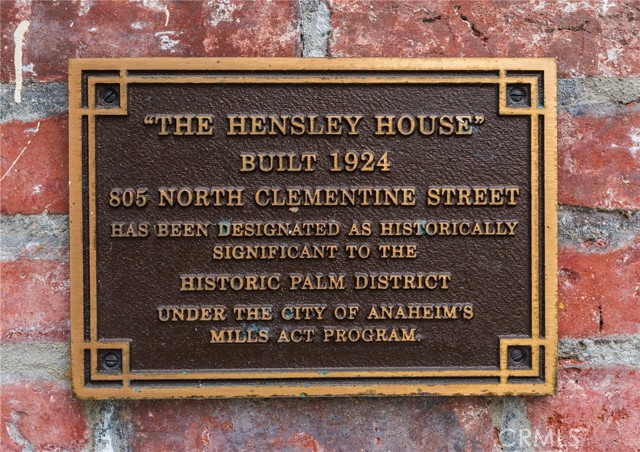 Historic "Hensley House" Craftsman with Detached ADU & Mills Act Savings Own a piece of Anaheim history! The Hensley House (1924) is a stunning example of Craftsman architecture in the coveted Palm District. The expansive front porch and custom front door lead into a grand living room featuring a rare, historic tiled fireplace flanked by original built-in bookcases. The formal dining room, complete with French door leading to the outside, flows into an oversized kitchen with a bright breakfast nook. There are plentiful cabinets in the kitchen and lots of natural light. Both bedrooms are perfectly sized with large closets. The full bath in the front house is spacious and has neutral colors. The front house is two bedrooms, one full bath and 1,216 square feet. The property includes a permitted ~288 sq ft ADU with its own electrical meter, kitchenette, full bath, and cathedral ceilings—ideal for multi-generational living or income potential. The main grounds feature a 1-car garage, large laundry room, and an additional bathroom and storage area which can be configured as home office, gym, craft room or whatever your heart desires! The landscaping is lush, your own secret garden! Complete with mature fruit trees and so private! Benefit from the existing Mills Act contract, providing substantial property tax relief in exchange for historic preservation. The property taxes on this home are only $3500 a year and with the Mills Act the new owner will inherit these monthly taxes with little to no change also no supplemental tax bill. This is a substantial savings! Perfectly situated blocks from Pearson Park, La Palma Park, and the vibrant Anaheim Packing District. Within a 15 minute stroll to over 40 restaurants, coffee shops, Farmer’s Markets and lively weekend events.