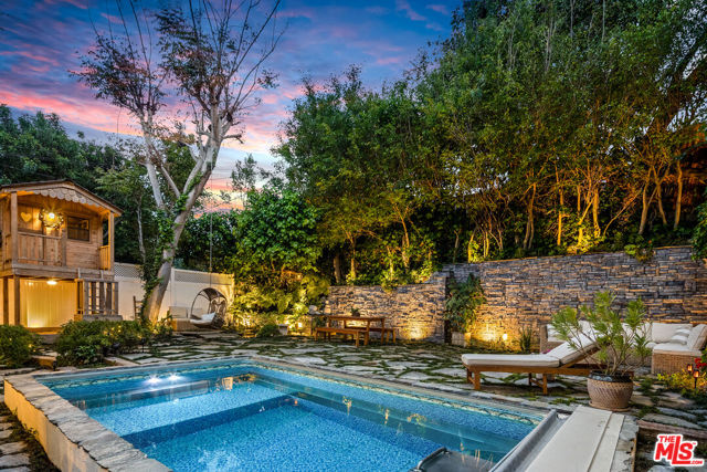 This enchanting traditional storybook home offers four bedrooms and four bathrooms, thoughtfully designed and completely move-in ready. Upon entry, you're welcomed by a warm and inviting formal den with a wood-burning fireplace, setting the tone for timeless charm and comfort. Rich hardwood floors guide you through the main level into the beautifully connected kitchen, dining, and family rooms, an ideal layout for effortless everyday living and entertaining.Two well-appointed bedrooms are conveniently located on the main level, each featuring its own updated ensuite bathroom. Upstairs, the entire level is dedicated to a luxurious primary retreat with a serene landing area. The spacious bedroom showcases soaring ceilings and a private balcony with built-in daybed seating. The spa-inspired ensuite is a true showpiece, featuring a steam shower, an elegant Roman bath, refined finishes, and a generous walk-in closet designed for optimal organization.The lower level offers exceptional versatility with its own separate entrance perfect for a home office, guest suite, fourth bedroom with full bath, gym, or potential income-producing space. Step outside to a private backyard oasis surrounded by lush, mature landscaping for ultimate seclusion. A river-style pool provides the perfect space for exercise or cooling off on warm days, while multiple seating and entertaining areas create an inviting atmosphere for gatherings. Adding to the charm is a delightful treehouse complete with electricity, ideal for creative space or play. Additional highlights include fully paid off solar panels, an EV charger, security cameras throughout, and distinctive design details that elevate the home's character and functionality. A rare blend of charm, thoughtful upgrades, and exceptional amenities, this home truly embodies quality, comfort, and value.