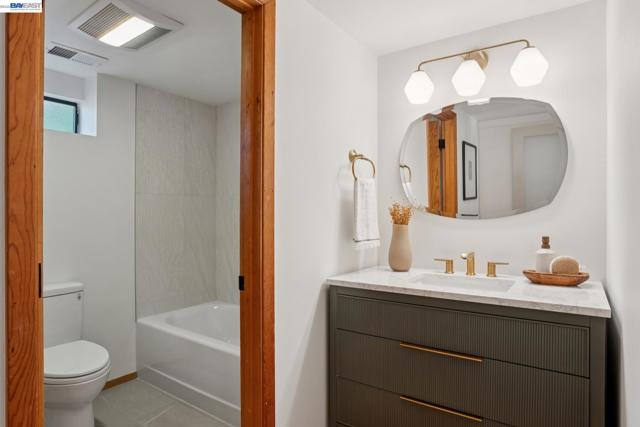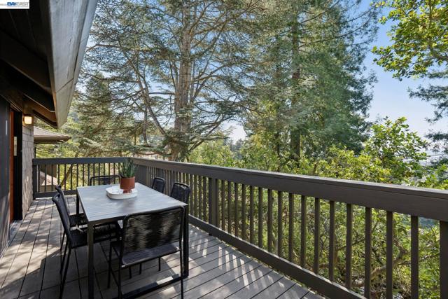 Tucked among the trees in the lower North Berkeley Hills, this striking contemporary home offers a rare sense of privacy and calm. Designed to connect seamlessly with its natural setting, the residence features soaring ceilings, multiple skylights, and decks on every level that bring the outdoors in. Recent updates add a fresh, modern feel while preserving the warmth of natural wood, tile, and stone throughout the home. The entry level includes two generously sized bedrooms, an updated split bathroom, and a shared deck overlooking lush greenery. Upstairs, the main living level showcases a dramatic living room that opens to a wide front deck—an inviting space for entertaining or relaxing among the treetops. At the center of the home, the thoughtfully planned kitchen is equipped with granite countertops, a Wolf cooktop, and new stainless steel appliances installed in 2025. The top floor is devoted to a spacious primary suite featuring its own private deck, along with a neighboring office where a large picture window frames sweeping views of the San Francisco Bay. Set in a tranquil neighborhood known for its network of hidden pathways and nearby parks, the home also offers convenient access to North Berkeley’s renowned dining scene, UC Berkeley, and BART. BESO Energy Score: 3