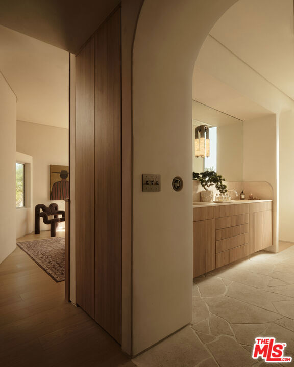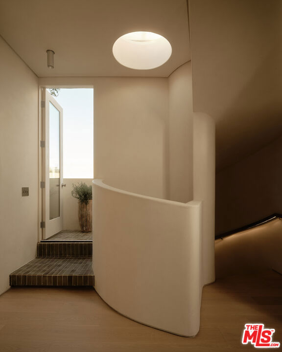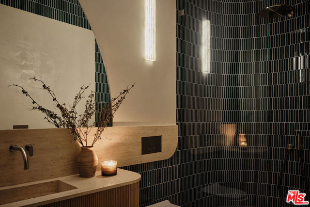 An architectural home defined by craftsmanship, materiality, and atmosphere in a highly coveted West Hollywood enclave. This 3 bedroom, 3.5 bath home balances flowing curves with luxurious interiors and a highly refined material palette. Travertine floors and surfaces, custom white oak cabinetry, and hand-applied plaster walls create depth and continuity throughout, while natural light moves seamlessly across the interiors, emphasizing texture, curvature, and proportion. Every element is intentional, prioritizing quality, restraint, and livability. The private rear yard is anchored by a 35-foot travertine-clad lap pool surrounded by greenery, offering a quiet retreat while also seamlessly integrating with the interior. Above, an expansive rooftop deck captures sweeping hills views; idyllic for entertaining and indoor/outdoor living. A rare architectural offering defined by atmosphere and enduring modernity.