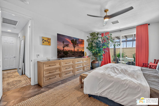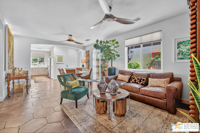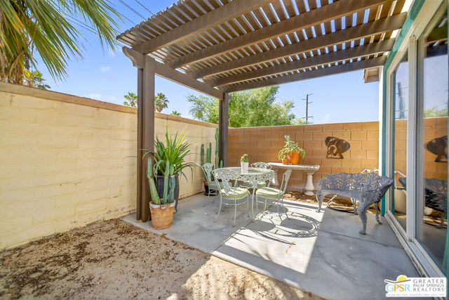 Welcome to Cimarron Cove, an idyllic gated community at the western edge of Cathedral City. This home is one of the most charming in the development with 3 bedrooms, 2 baths, updated kitchen and appliances, and anexceptional floor plan. OWNED SOLAR WITH BACK-UP BATTERY! A single story home, this is one of the smaller of the floor plans, but is extremely well appointed with many value add upgrades throughout. New HVAC, water heater, and AC.Beautiful new front landscaping welcomes you with a graceful path, to the quaint front door. Once inside, you will immediately be enticed by expansive stone tile flooring throughout, a completely redone and upgraded kitchen with artisan tilebacksplash to the ceiling. And, again, a fully paid for solar with back up battery. Graceful rooms open to a lovely back and side yard with newer built pergolas, just waiting for your landscape projects. (See the last of the photos, there is a plan forthe backyard- just waiting for you to dig in!) Must be seen to be believed. Ready to move right in and settle. This home is obviously loved and cared for. Perfectly positioned within Cimarron Cove across from the park, community pool and spa,BBQs, and more! Enjoy your morning coffee with the most spectacular mountain views, right from your kitchen window.