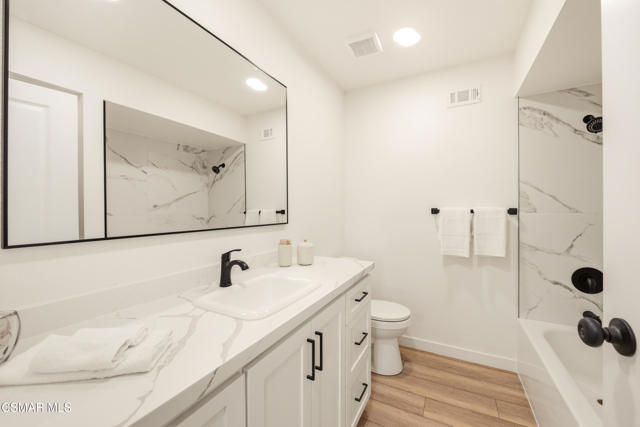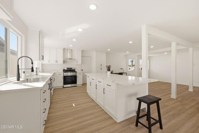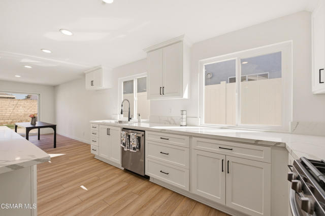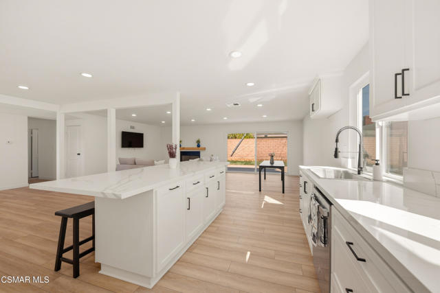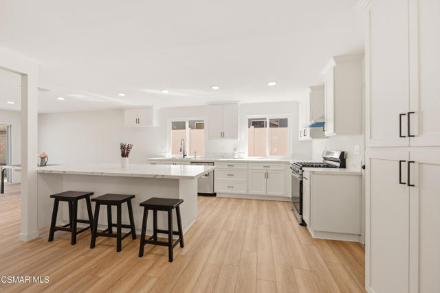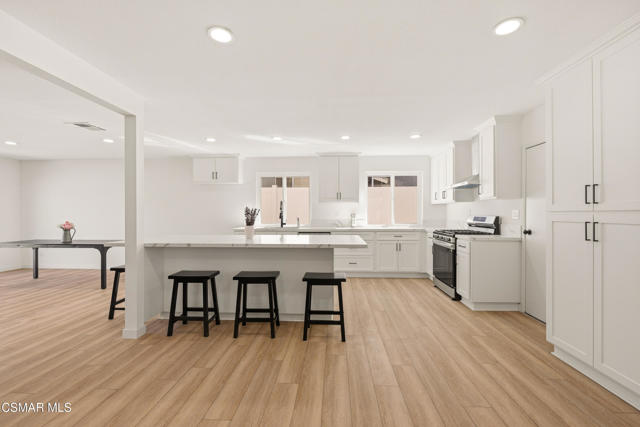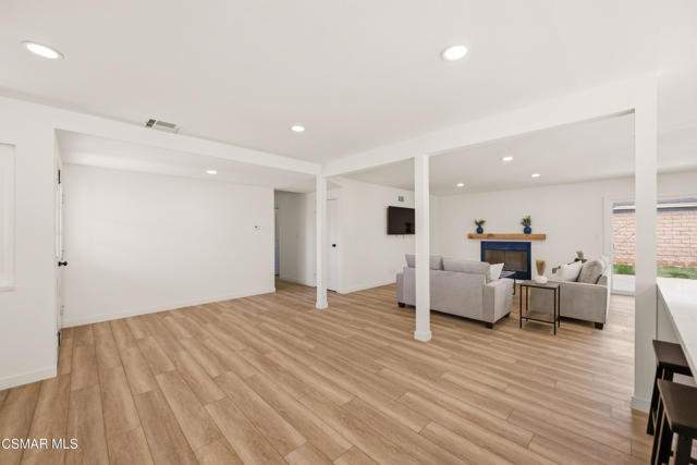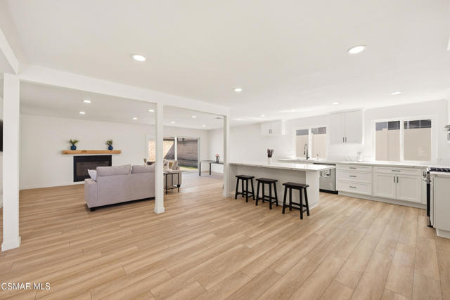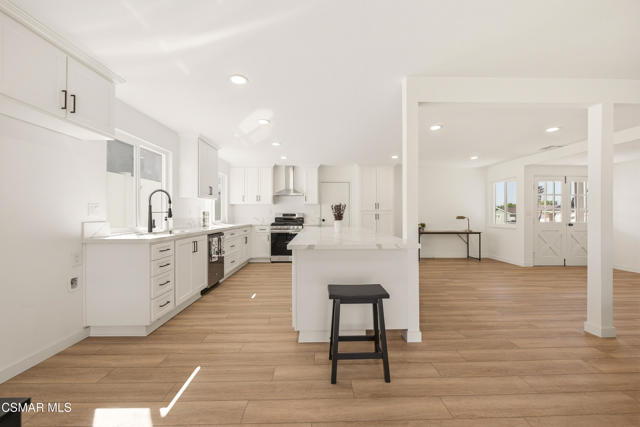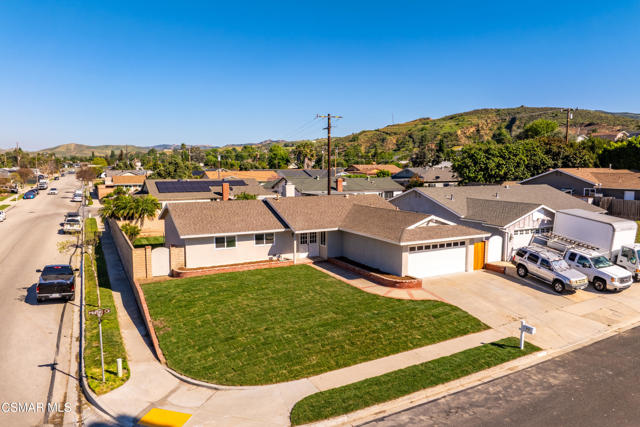Situated on a corner lot in a little hidden pocket of Simi Valley, this fully remodeled, move-in ready 4-bedroom home has been thoughtfully redesigned with today's Buyer in mind. Step inside and immediately notice the bright, open feel, enhanced by an open floor plan and an abundance of natural light throughout. The kitchen has been completely transformed into the centerpiece of the home, featuring a large island ideal for gathering and everyday living. It is complemented by quartz countertops, brand-new soft-closing cabinetry, stainless steel appliances, and recessed lighting. Both bathrooms have been upgraded with large-format tile showers and new vanities, creating a clean, modern look. Additional upgrades include wood-style flooring throughout, recessed lighting, a wood-burning fireplace, new dual-pane windows, and a new sliding glass door. Major system improvements include the addition of central air conditioning, a newly replaced furnace, and an upgraded 200-amp electrical panel. Fresh landscaping in both the front and backyard enhances the home's curb appeal while creating a great space for outdoor enjoyment and entertaining. With all the work already completed, this is a rare opportunity to own a fully updated home without the wait or hassle.