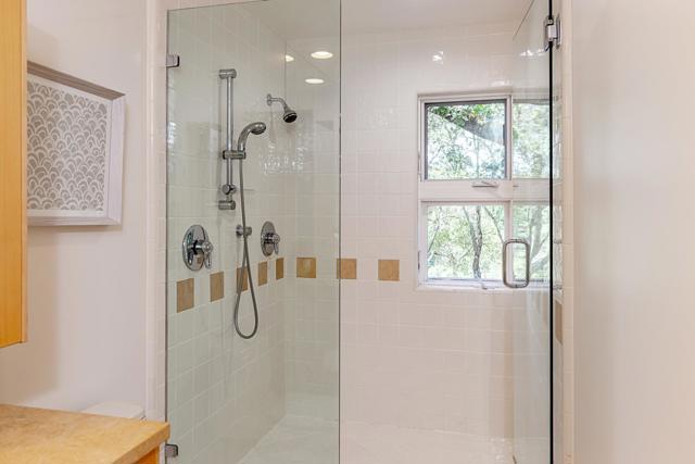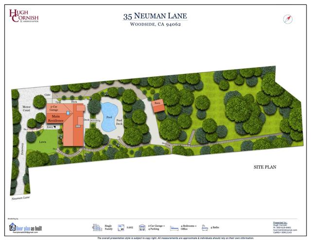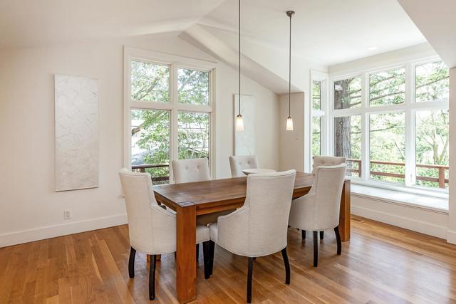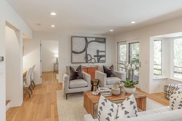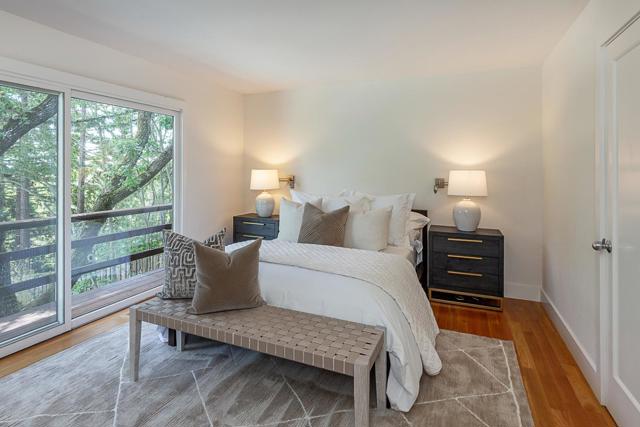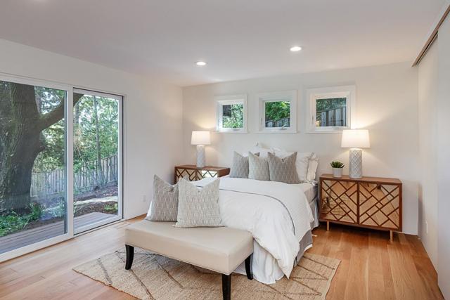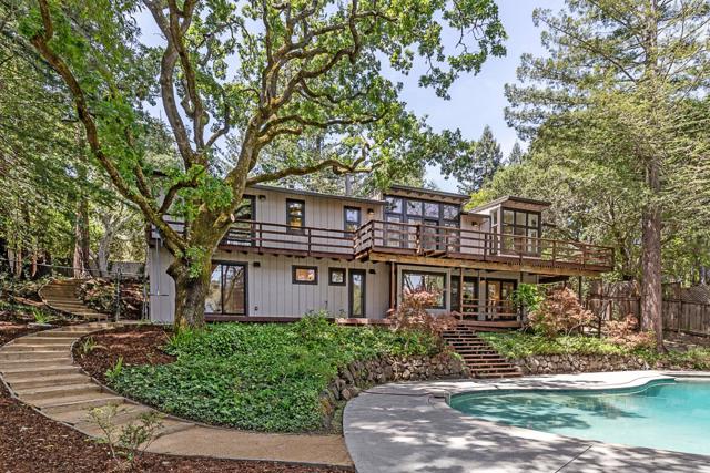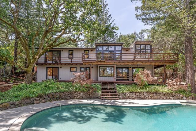 Set at the end of a private lane on more than one acre, this stylish contemporary retreat offers a rare sense of privacy just moments from downtown Woodside. Refreshed landscaping & a spacious, partially covered front deck introduce interiors defined by clean lines, hardwood floors, vaulted ceilings, & expansive walls of glass that fill the home with natural light. The flexible two-level floor plan features 4 bedrooms, an office, & 4 full baths, including a main-level primary suite. A dramatic living room with a fossilized limestone fireplace, formal dining room, & streamlined maple kitchen with honed black granite & butcher block surfaces create a modern yet inviting backdrop for everyday living & entertaining. Sliding glass doors open to a wraparound deck for seamless indoor-outdoor flow. The lower level expands the living space with a large recreation room with a built-in workstation for two, plus 2 additional bedrooms, one with an en suite bath. Terraced rear grounds include a free-form pool, barn with potential equestrian use, zip line, & refreshed landscaping, along with additional usable outdoor areas suited for recreation, play, or future possibilities. Just one-half mile from downtown Woodside & within the acclaimed Woodside School District.