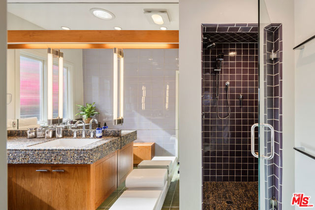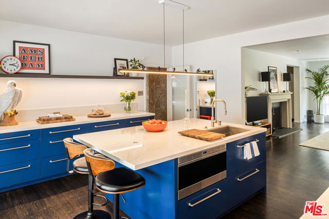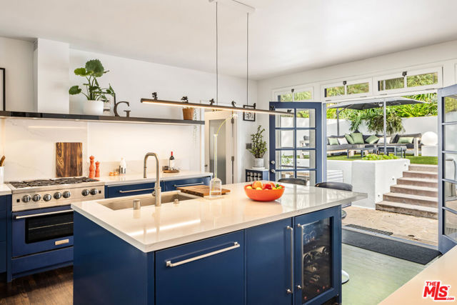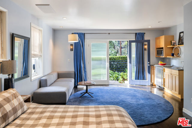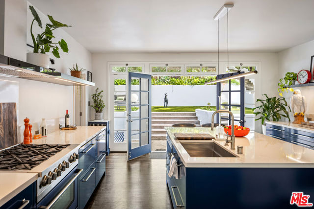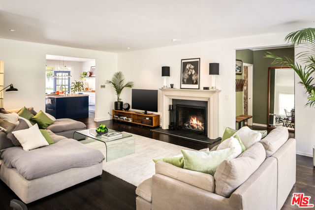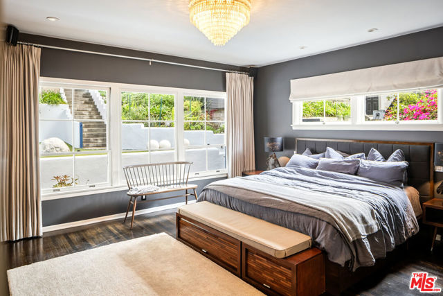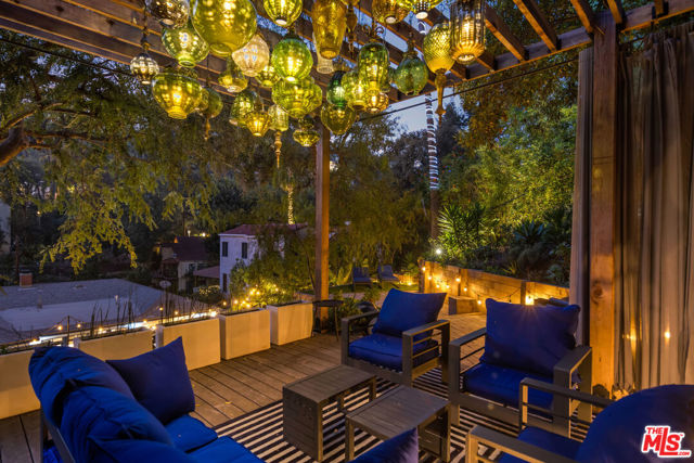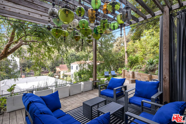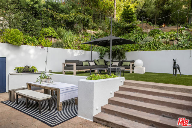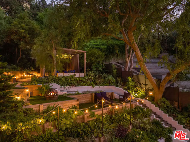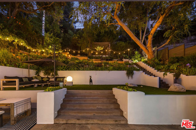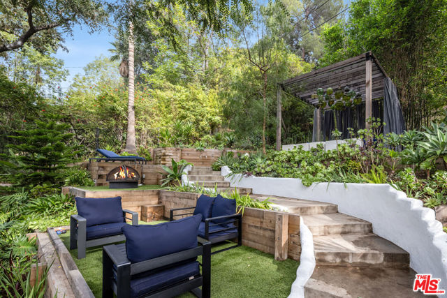 This gated home with mid-century modern influences and PRIVATE GUEST SUITE sit on a large, wooded lot in upper Beachwood Canyon. Formerly celebrity-owned and tucked back from the street, this home's expansive rear yard is an outdoor sanctuary bringing the tranquility of nature to everyday living. Green canyon views can be seen from the oversized windows creating an airiness throughout the living space, anchored by a renovated kitchen which seamlessly joins both interior living and the outdoors. The kitchen is outfitted with built-in, luxury appliances, a large island, and plentiful countertop prep space. Whether you prefer entertaining or quiet fireside moments, this home offers the space for your household to sprawl on the 4 bedroom, 3 bath main level inclusive of an oversized, primary suite with custom Walnut built-in's and dedicated laundry/utility room. Rear French doors open to your own secluded garden designed for entertaining. Winding paths of the curated grounds showcase its succulent gardens, professionally landscaped terraces, several lounging areas, banana and Meyer lemon trees, and private hilltop pergola illuminated by a masterfully designed light installation. Out of town guests can enjoy the privacy of a PRIVATE GUEST SUITE on the lower level with its own kitchenette, bathroom, bedroom/office and private garden. The two-car garage features built-in cabinets & utility sink. Close to hiking trails, Beachwood market, city night life, and major studios. Experience the magic of this private sanctuary in iconic Beachwood Canyon.