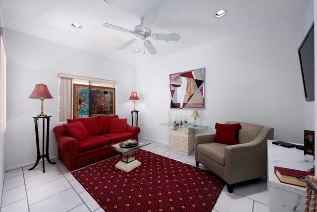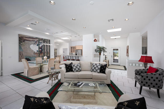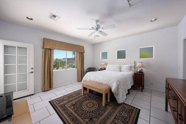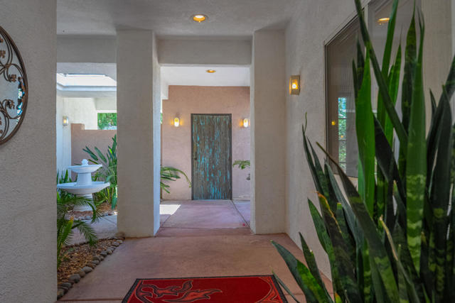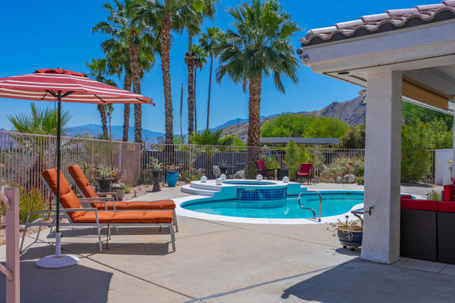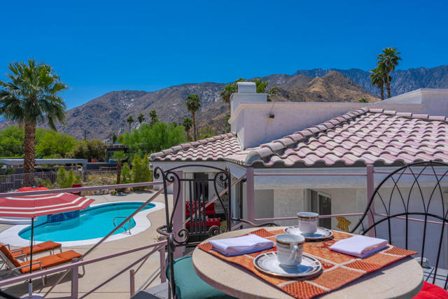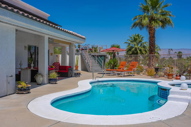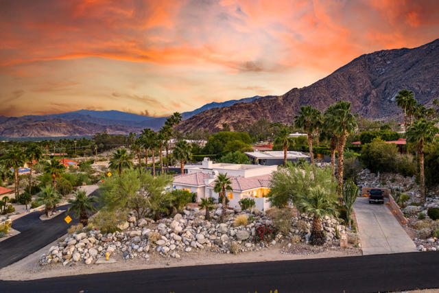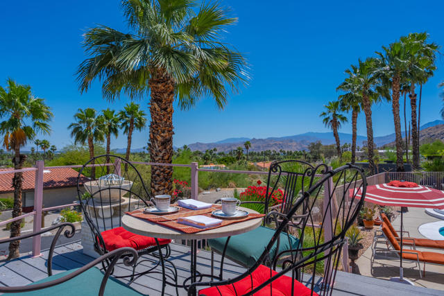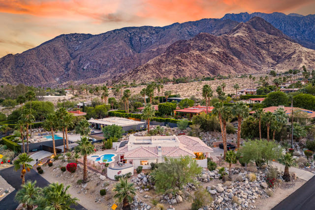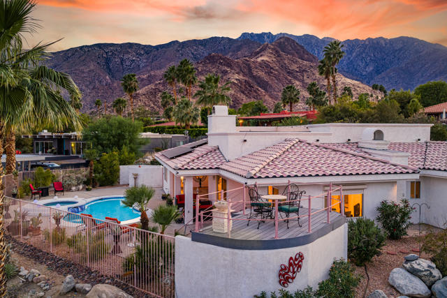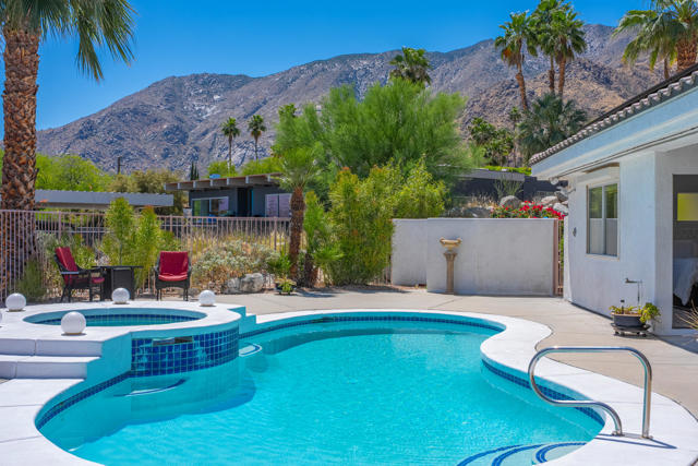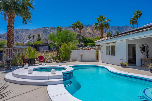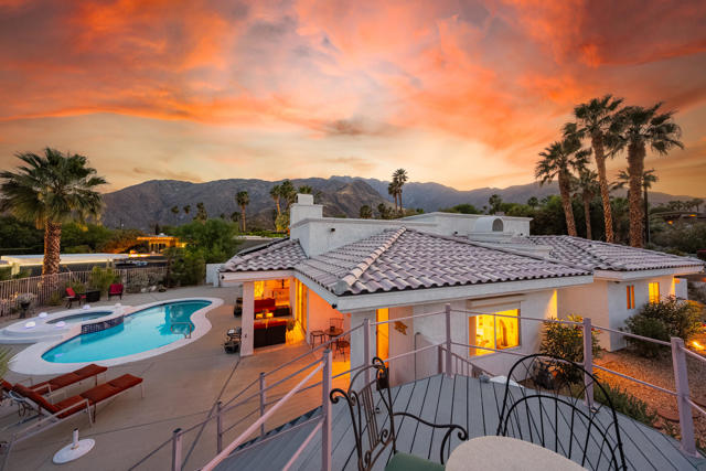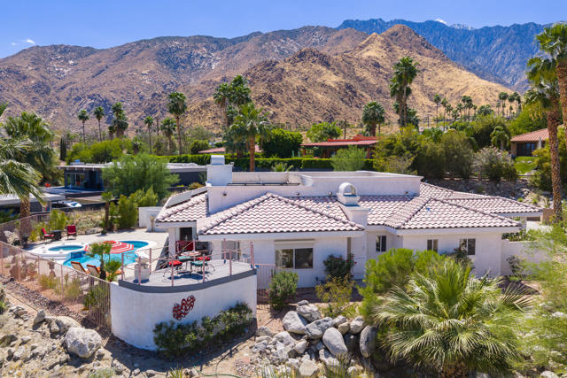 High above Palm Springs, this exceptional 3-bedroom, 3-bathroom estate-like residence on an 1/2 acre lot commands breathtaking 360-degree views of the entire valley floor and beyond. Take advantage of this rare opportunity to join a truly unique neighborhood with investment potential, where you find new and old custom built single family homes side by side.Owing to its custom build, the layout is thoughtful, with a grand entrance opening to the living room showcasing a custom fireplace. The kitchen delivers generous prep space, bar seating, a spacious walk-in pantry, and a cozy breakfast area for four, with an adjacent den that could easily serve as a 4th bedroom. Each bedroom has access to an outdoor patio space, with the primary leading directly to the pool area and on the front of the house, one of two guest bedrooms has its own entrance, kitchenette and en suite bath, ideally suited as a guest house.The outdoor experience includes a covered patio, sparkling tiled pool, spa, and a raised deck all with the phenomenal valley as your backdrop. Leased solar panels With undeniable renovation potential, property represents is a compelling investment. 30-Panels Solar system and Short Term Rental Permit availability. Furniture available outside of escrow per Seller inventory. Rare 3-Car Garage and expansive driveways for multiple cars. Fee simple (You Own the Land).