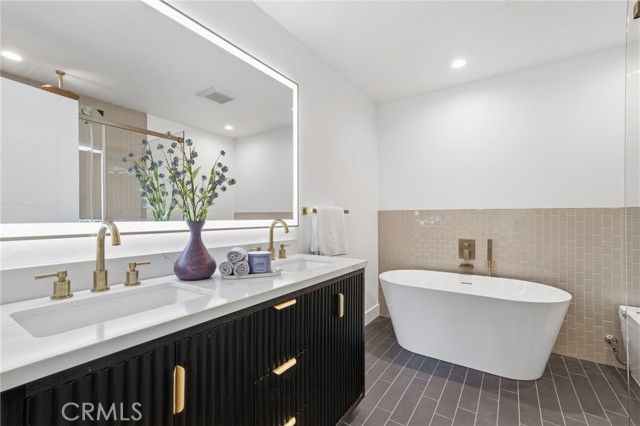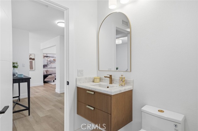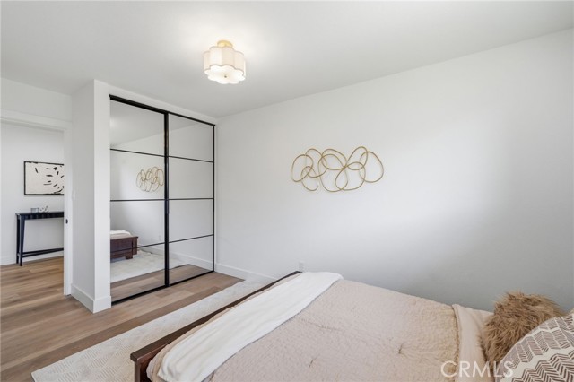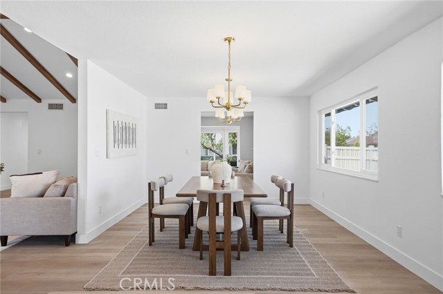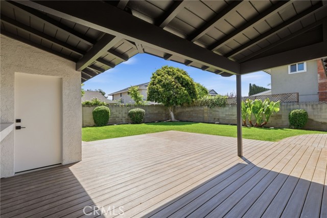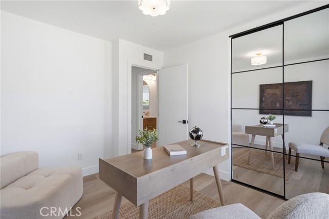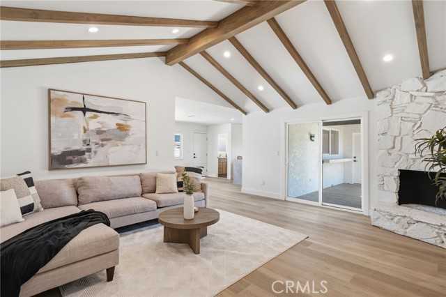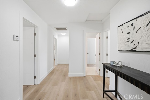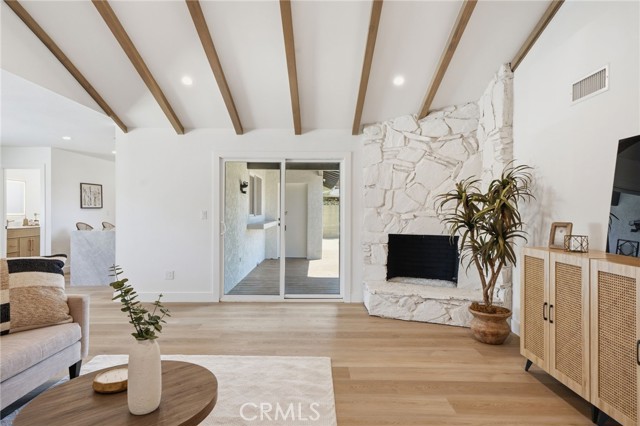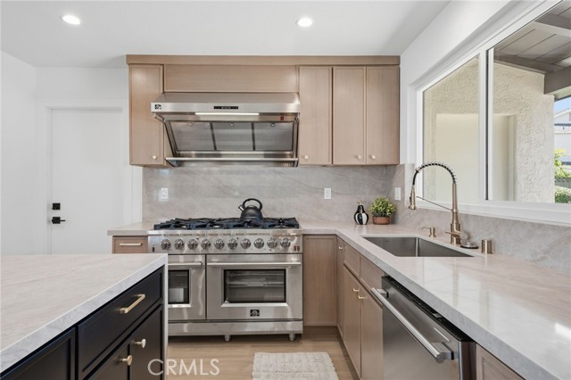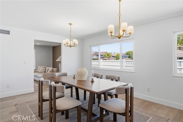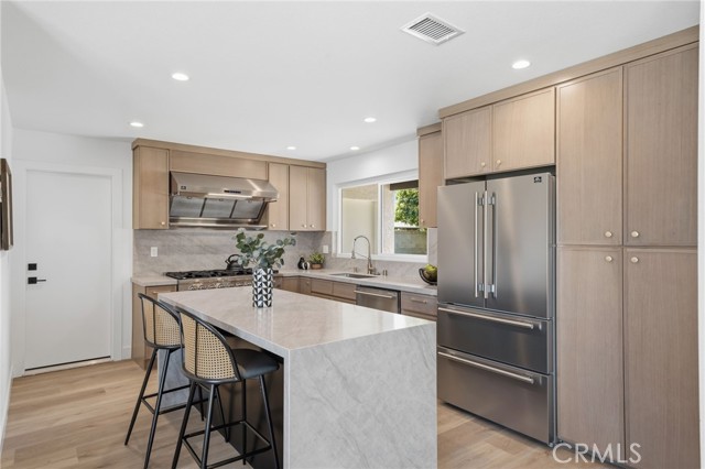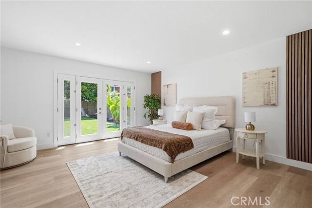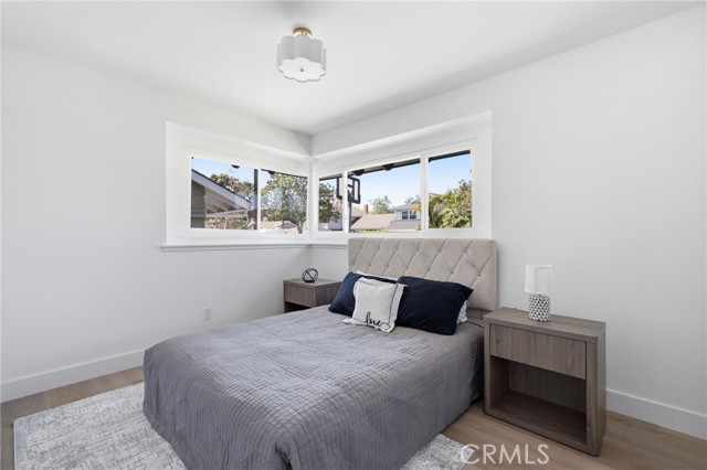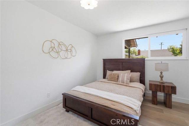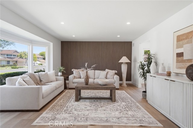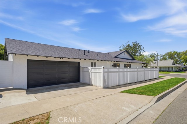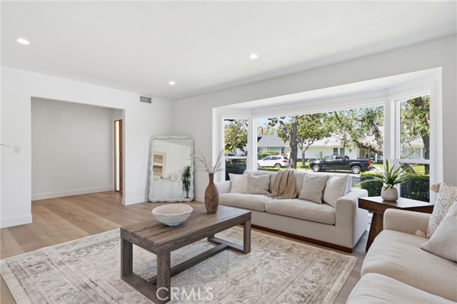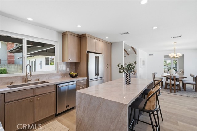 Meticulously remodeled and truly turnkey, this exceptional 4-bedroom, 2.5-bath single-level residence is gracefully positioned on a coveted corner cul-de-sac lot within Orange’s established Fairmont neighborhood. Thoughtfully reimagined with a refined, modern sensibility, the home blends timeless design with elevated comfort, offering a step-free interior, a custom soft contemporary entry door, and an airy open-concept floor plan tailored for both everyday living and effortless entertaining. The designer kitchen serves as the showpiece of the home, appointed with custom Slim Shaker oak cabinetry, striking Calacatta Bella quartz countertops, a generous center island with seating, farmhouse sink, and stainless steel appliances. Wide-plank luxury vinyl flooring flows throughout, complemented by porcelain tile baths, curated finishes, and sophisticated layered lighting that enhance the home’s polished aesthetic. Privately situated, the primary suite is a serene retreat filled with natural light and enhanced by a custom walk-in closet, architectural ceiling detail, and French doors that open to the backyard for a seamless indoor-outdoor connection. The spa-inspired primary bath evokes a boutique resort feel with dual vanities, designer fixtures, a freestanding soaking tub, and an expansive glass-enclosed shower finished with custom tile and multiple shower heads. Secondary bedrooms are generously proportioned and thoughtfully designed, offering flexibility for guests, office space, or creative use. One enjoys direct access to a beautifully remodeled hall bath, while another is currently styled as a sophisticated home office with views of the front yard and mature trees. Recent upgrades further elevate the home’s appeal, including a new HVAC system, composite roof, 200-amp electrical panel, fresh exterior paint, and new sod. The grounds are framed by mature landscaping, highlighted by a stately olive tree and expansive frontage along a quiet cul-de-sac. Ideally located near the charm of Old Towne Orange, premier dining and shopping, and convenient access to the 55 and 22 freeways, this remarkable residence offers a rare blend of design, comfort, and location.