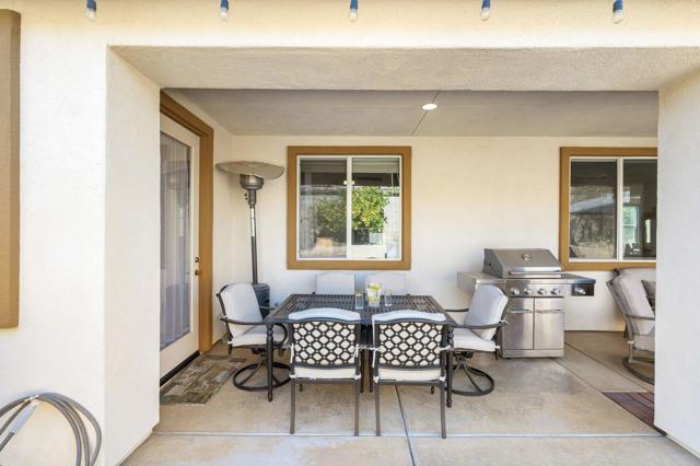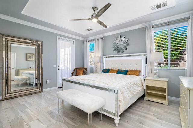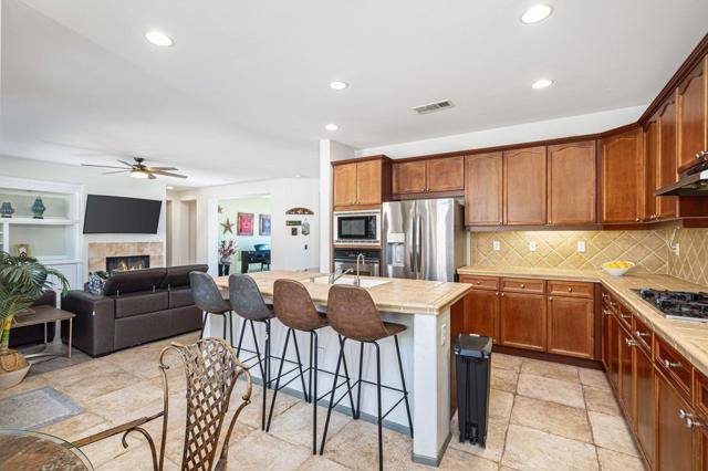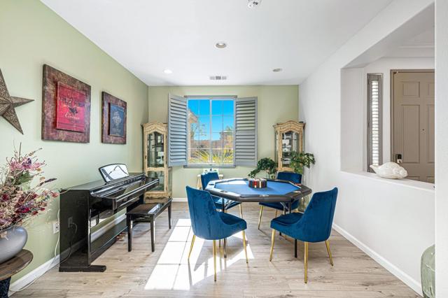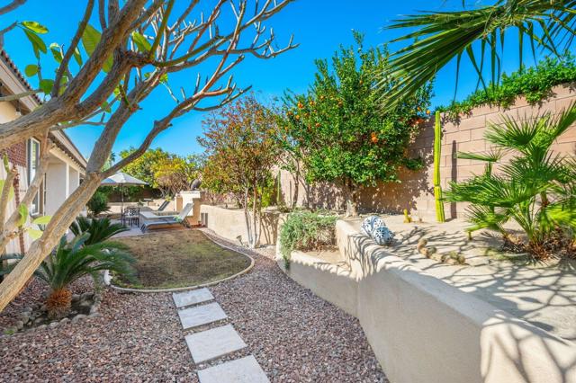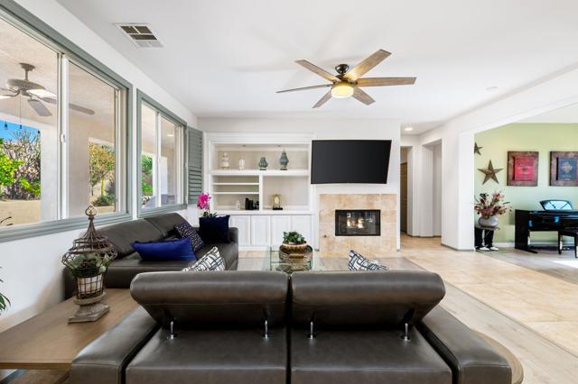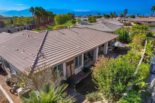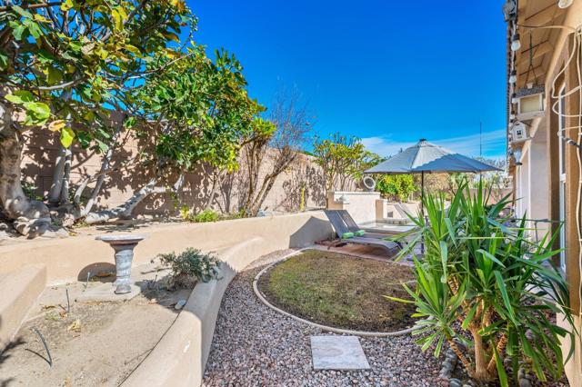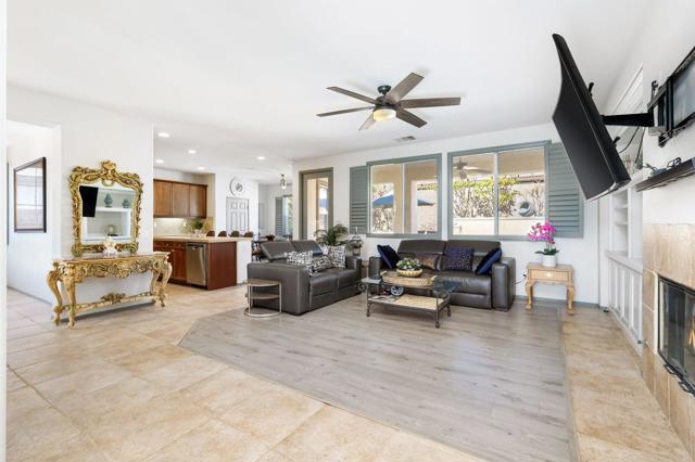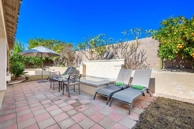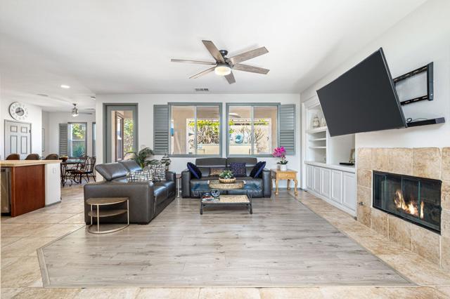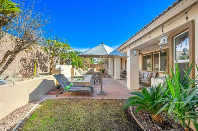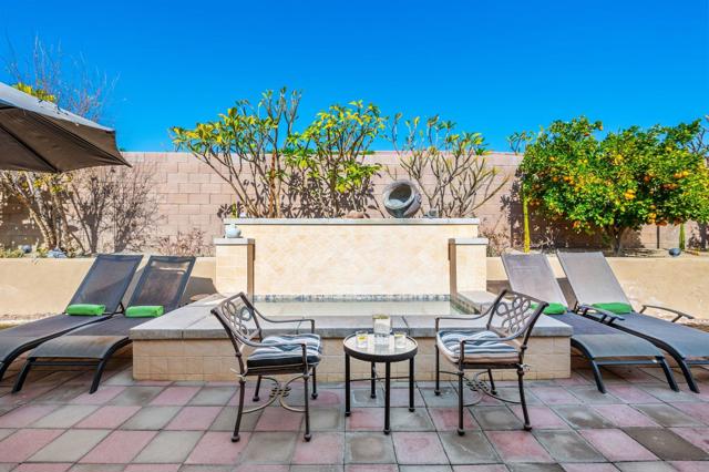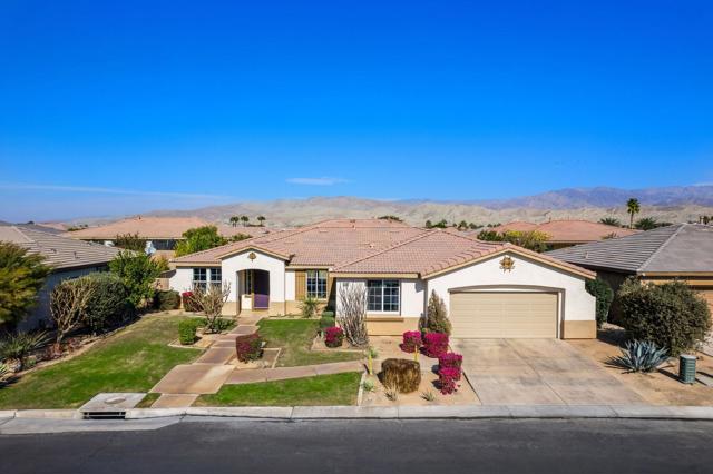 Welcome to Generations, a highly sought-after gated community in North Indio, where your dream home awaits. Located along a beautifully landscaped parkway, this former model home offers the perfect blend of elegance, comfort, & functionality. This light & bright home has enough space for all your family & friends. The open floor plan with a great room with a fireplace for cozy winter nights, a formal dining room, & office/den will easily meet all your needs. You will appreciate the custom kitchen with a large center island, full backsplash, stainless steel appliances, custom built-in cabinetry, pantry, oversized travertine-style tile, & flooring with chiseled edges. This beautiful home also boasts plantation shutters, updated tile in the bathroom & closet, a wireless A/C system, ceiling fans, updated speakers, & built-in shelving in the great room, den, & custom closet. The sizeable primary bedroom with a generous walk-in closet & bath with a separate shower, soaking tub, & double vanity sinks is sure to impress. The inviting backyard is landscaped, very private, & features a large, covered patio & a custom Spool (small Pebble-Tec pool with spa-like jets & waterfall feature). There are also a variety of fruit trees, including mango, mandarin orange, tangelo, pomegranate, guava, lemon, fig, & orange trees. Low HOA fees, no mello-roos, plus lower utility costs. Generations is perfectly located close to world-class golf, tennis, pickleball, shopping, & the Acrisure Arena.