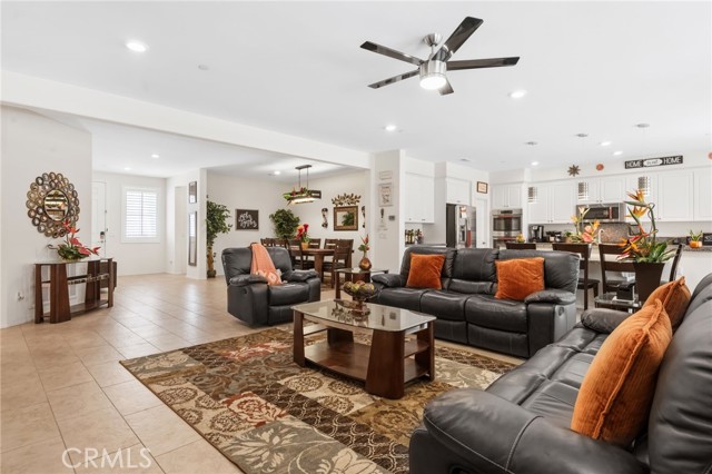 Rare opportunity to own an impeccably maintained home that shows like a model home and feels better than new. The sale can include all furniture and appliances, offering a true turnkey experience. Located on a quiet street in Jurupa Valley, this single-story home with a single door entry offers over 2,800 square feet of living space with 5 bedrooms and 3.5 bathrooms. Built in 2016, it combines modern design with a spacious, open layout ideal for both everyday living and entertaining. The large gourmet kitchen features granite countertops, stainless steel appliances, and a huge center island with seating for six. It opens directly to the dining and family areas and flows seamlessly to the backyard, complete with a large covered patio—perfect for gatherings or relaxing evenings outdoors. The inviting living room, highlighted by a cozy fireplace, connects to the dining area to create an expansive and open feel throughout the main living space. Each bedroom is generously sized, including a well-appointed primary suite with a walk-in closet and a spa-inspired bathroom. The flexible floor plan also allows for a home office, guest quarters, or multi-generational living. Additional highlights include a low-cost solar lease (seller reports minimal summer electric bills), recently painted exterior, a three-car garage, energy-efficient features, and low-maintenance landscaping. Conveniently located near shopping, dining, parks, and with easy freeway access, this home offers the perfect blend of comfort, style, and practicality. This is a must-see, truly move-in ready home.