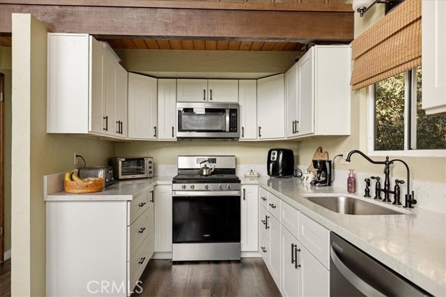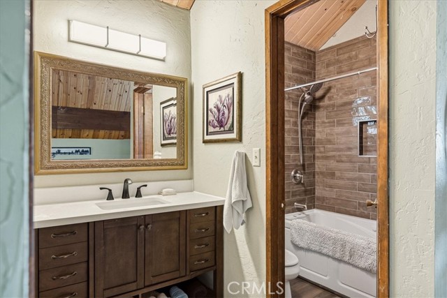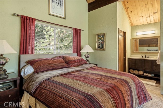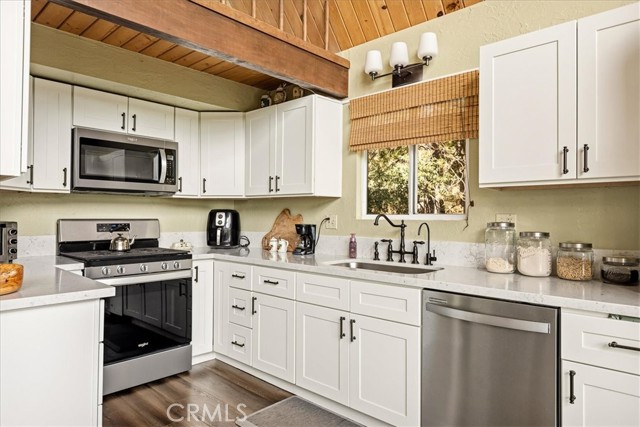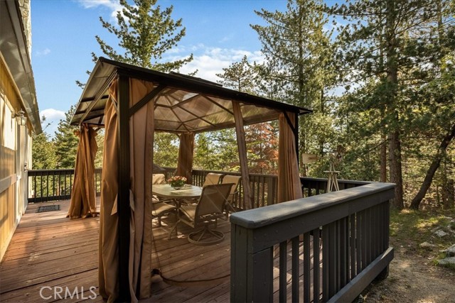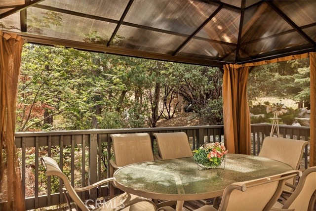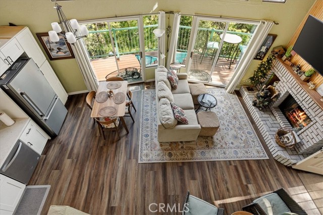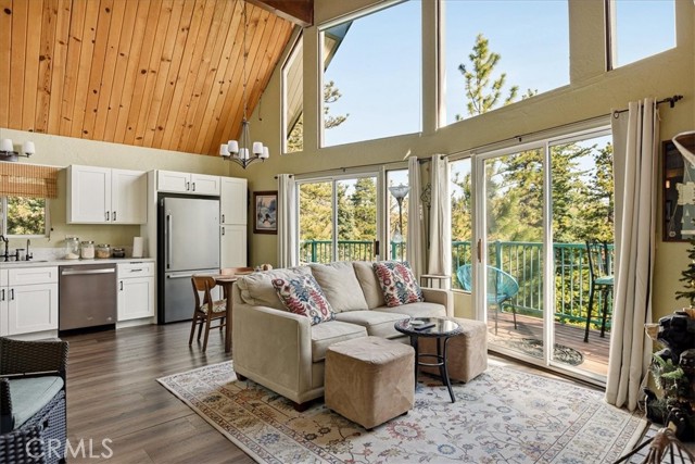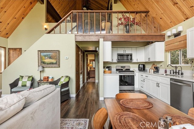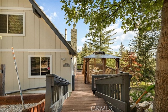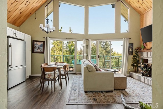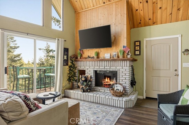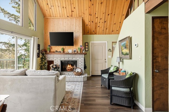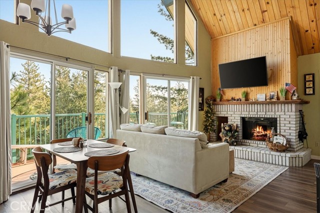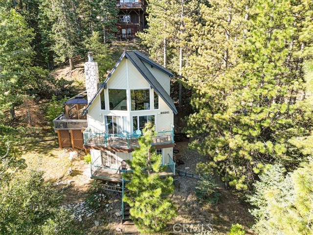 If you’re searching for the perfect mountain escape, this charming **true A-frame** delivers. Surrounded by towering trees and featuring a dramatic wall of glass, the home brings in natural light and showcases over $100,000 in recent upgrades. Just a few easy steps from the access road lead to the front door. The main level offers a beautifully remodeled kitchen with reverse osmosis filtration, a cozy living room with fireplace, two bedrooms, and a full bath. Upstairs, the private loft-style primary suite includes a remodeled bath with jetted tub, walk-in closet, and peaceful forest views. The lower level features a spacious family/game room with pool table, laundry, storage, and ground-level access to usable outdoor space. Enjoy three inviting decks, fresh exterior paint, and an energy-efficient hydro heating system with new water heater. Ideally located near hiking trails, just 20 minutes to local ski resorts, and a short drive to Lake Arrowhead Village and SkyPark at Santa's Village for shopping, dining, and year-round recreation.