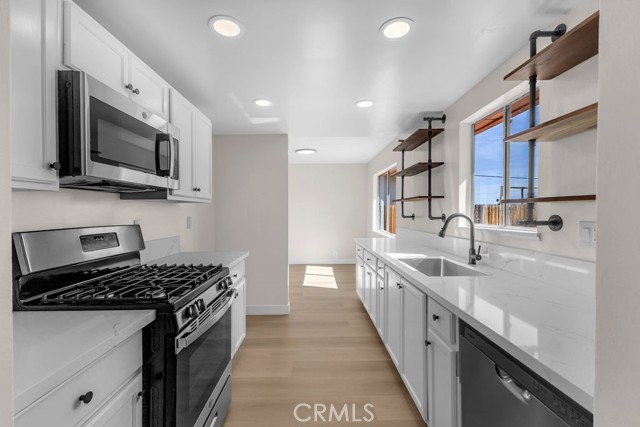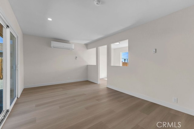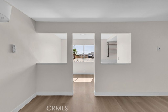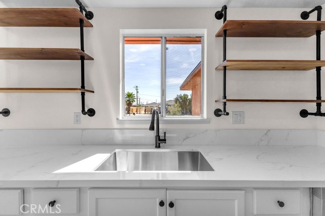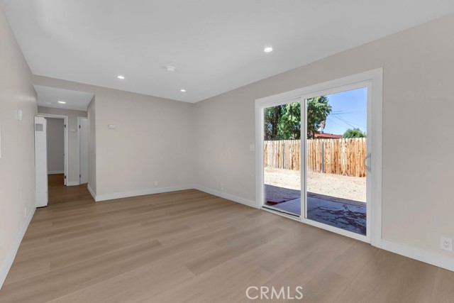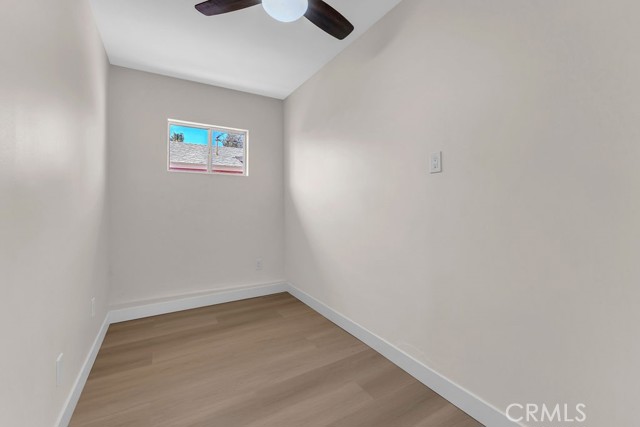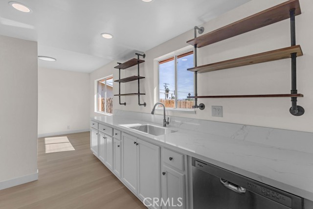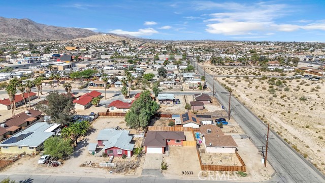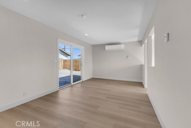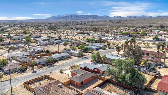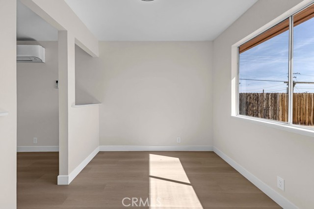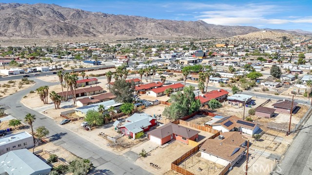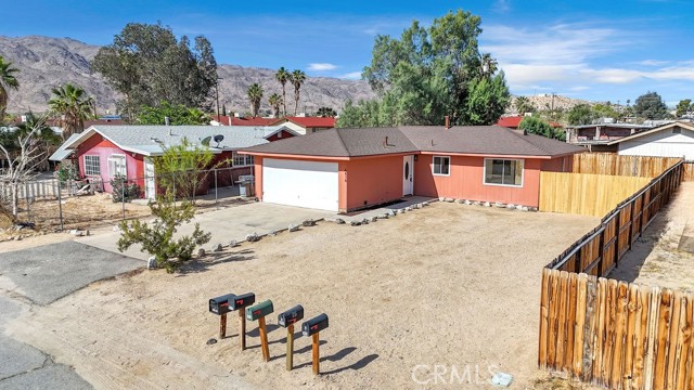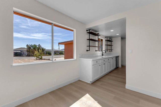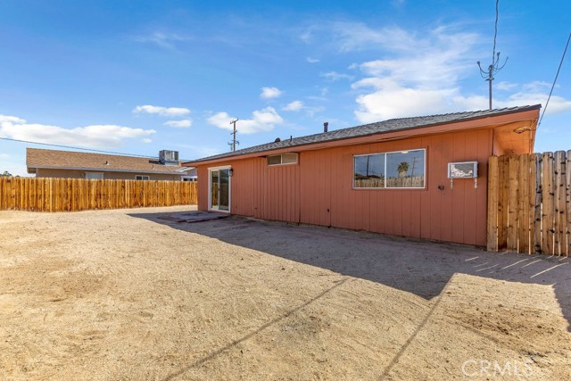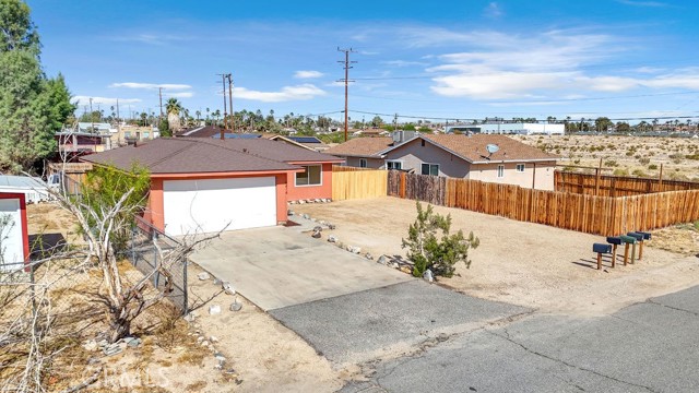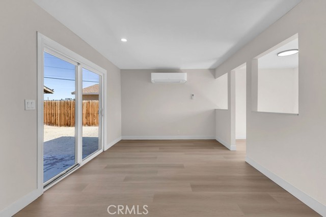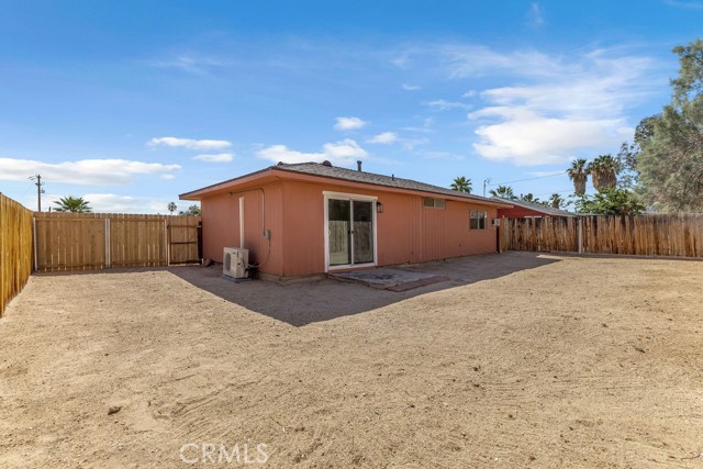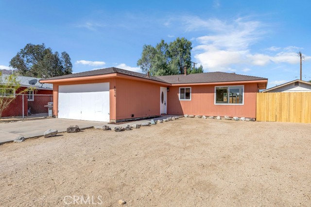 Welcome to 6414 East Court in Twentynine Palms. This well-updated home features refinished kitchen cabinetry, new countertops, and a full suite of stainless steel appliances including a gas oven, overhead microwave, and dishwasher. The interior has been freshly painted and enhanced with recessed lighting in the kitchen and custom shelving details. The property offers new flooring throughout and is equipped with a mini split HVAC system, along with additional wall A/C units in the bedrooms and a gas wall heater for added comfort. A separate dining area is located just off the kitchen. The bathroom has been tastefully updated with a pedestal sink, new fixtures, mirror, lighting, towel bars, a new toilet, and a refreshed shower. The spacious yard includes a concrete slab patio with sliding door access from the living room. Additional features include an updated water heater and washer and dryer hookups located in the garage. Conveniently located near public transportation and just minutes from the Marine Corps Base.