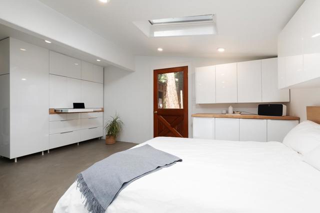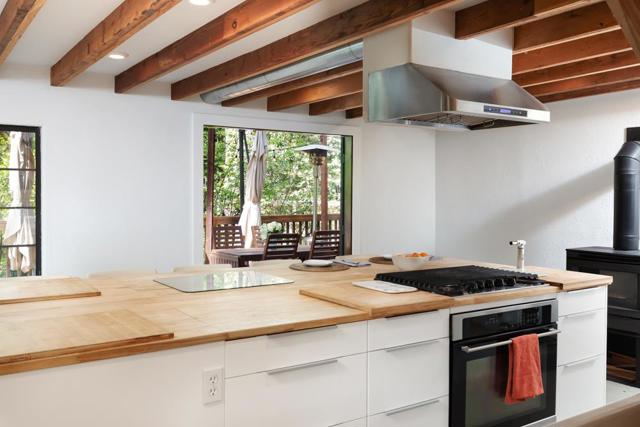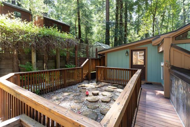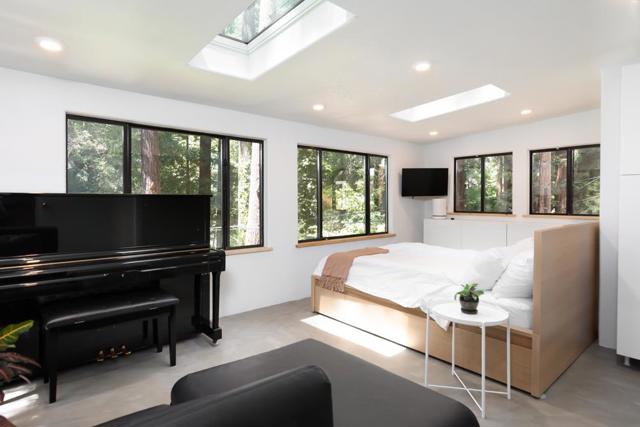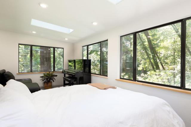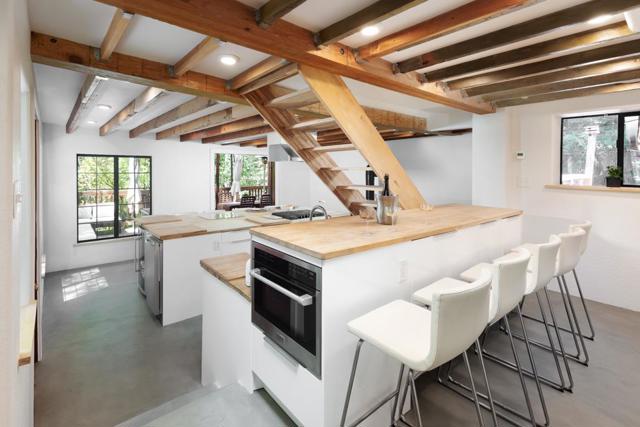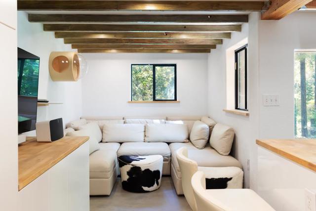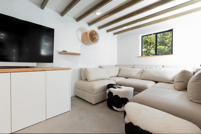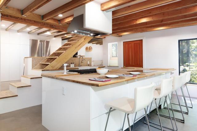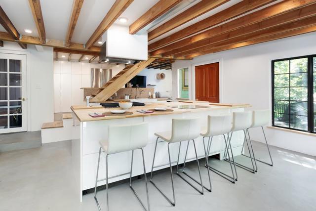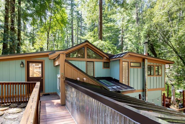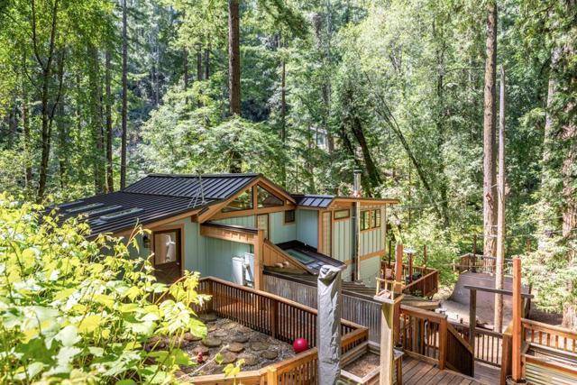 414 Hiawatha Road A Private Forest Sanctuary 414 Hiawatha Road is an enchanting retreat where natural beauty and thoughtful design create a sense of calm and quiet magic. Crossing the charming covered bridge, you're welcomed by the gentle sound of a babbling brook, an arrival that feels like stepping into a storybook. Inside, the home has been meticulously redesigned into a contemporary sanctuary with a warm Scandinavian aesthetic. Skylights invite soft forest light to pour in, creating a bright connection to the surrounding landscape. The kitchen blends style and function with a beamed ceiling, butcher block countertops, and custom built-ins, including a beverage fridge, nugget ice machine, and convection microwave. A cozy wood stove anchors the space, opening to a spacious deck with serene forest views and a hot tub for soaking under the trees. Upstairs are three bedrooms with sleek built-ins and beautifully designed baths, including a half bath with a shower and access to the dog run. Radiant-heated concrete floors, multiple view decks, a detached building, storage structures, an EV charger, and RV/boat parking complete the offering.