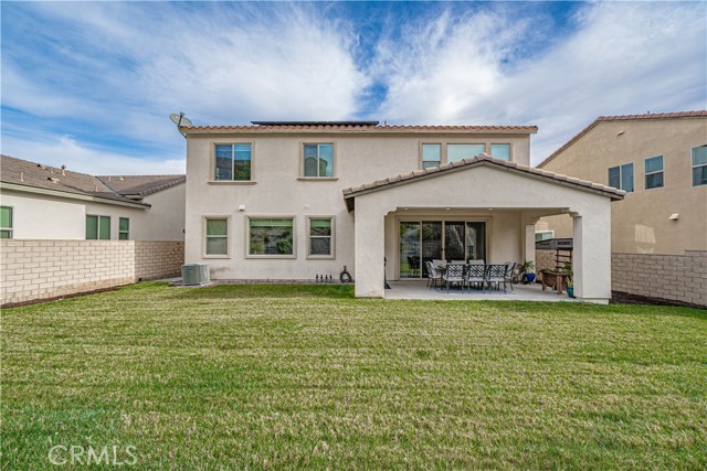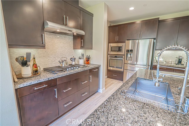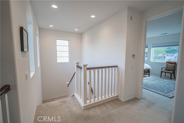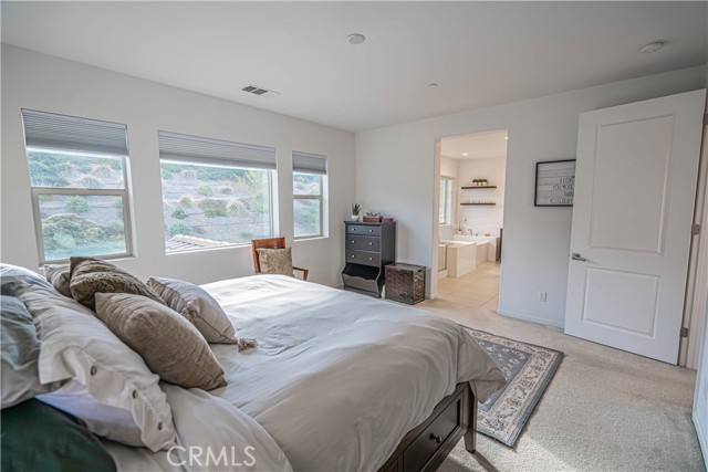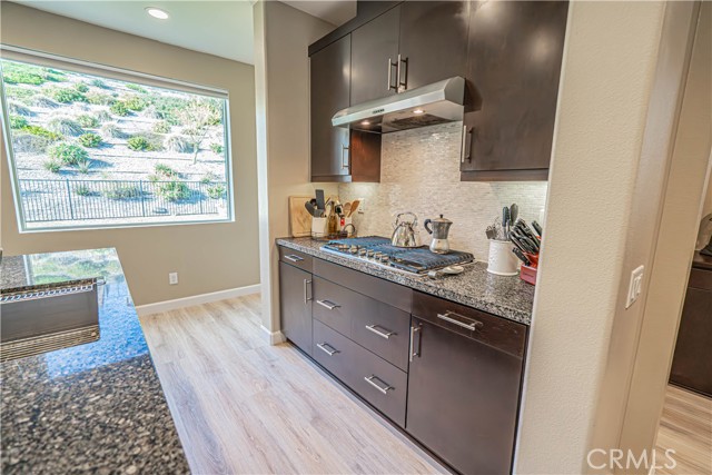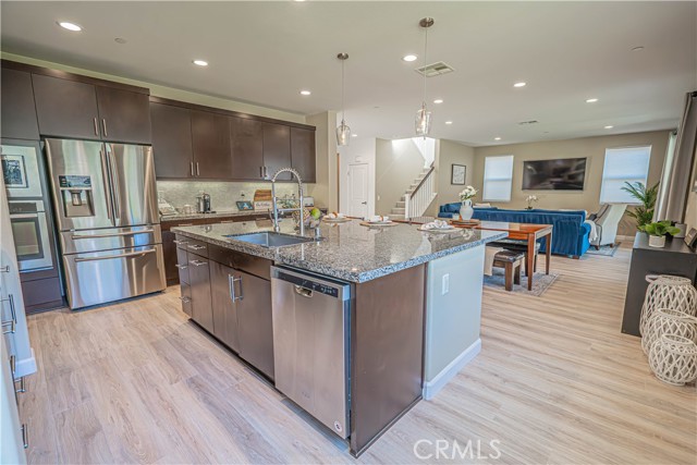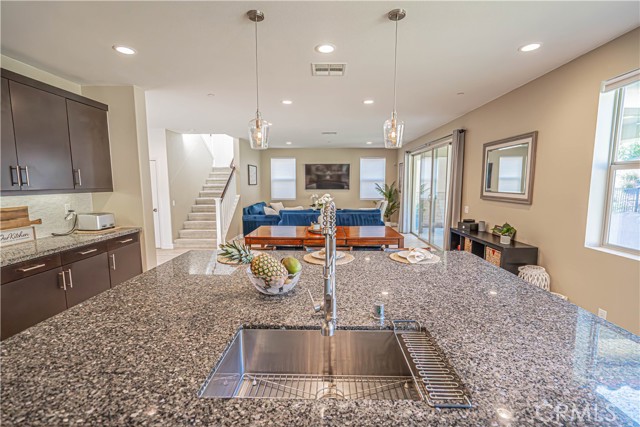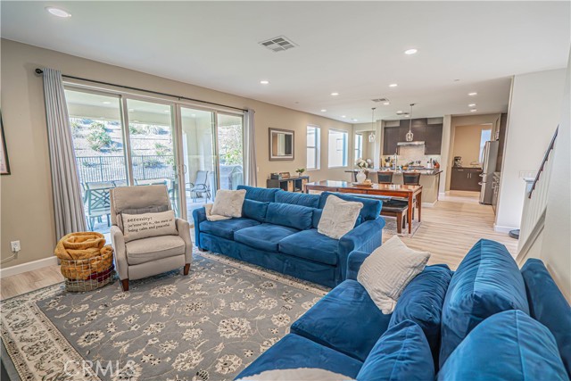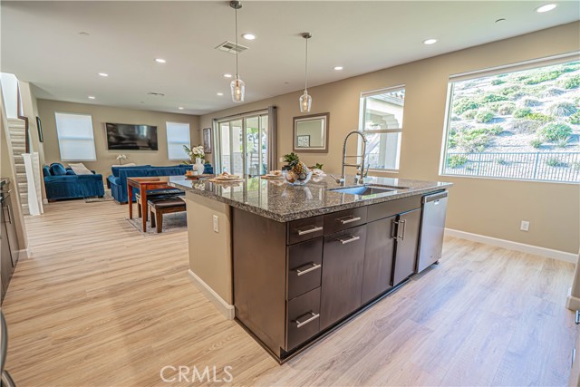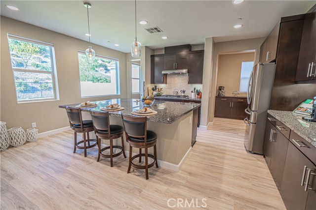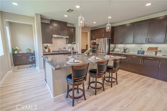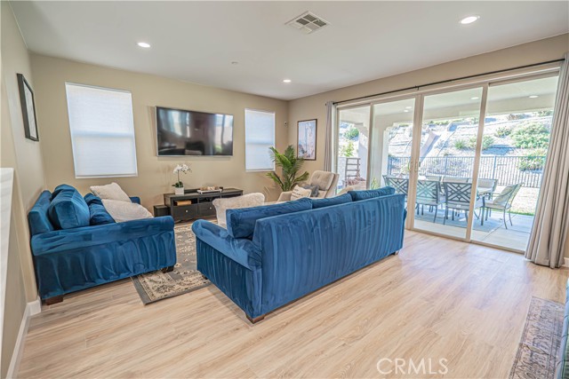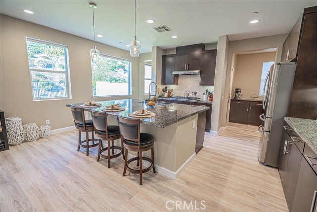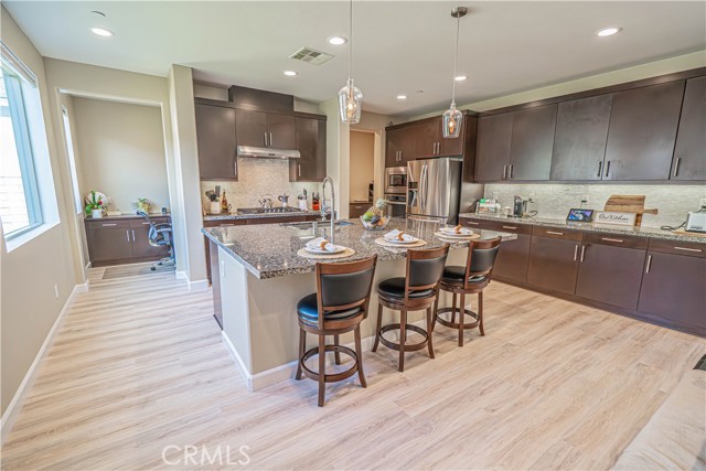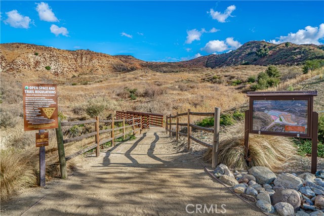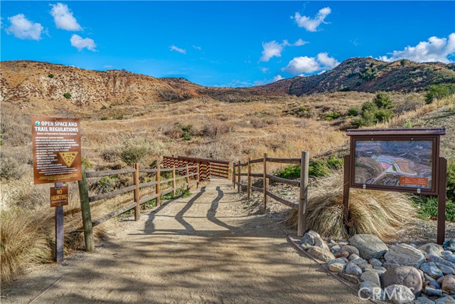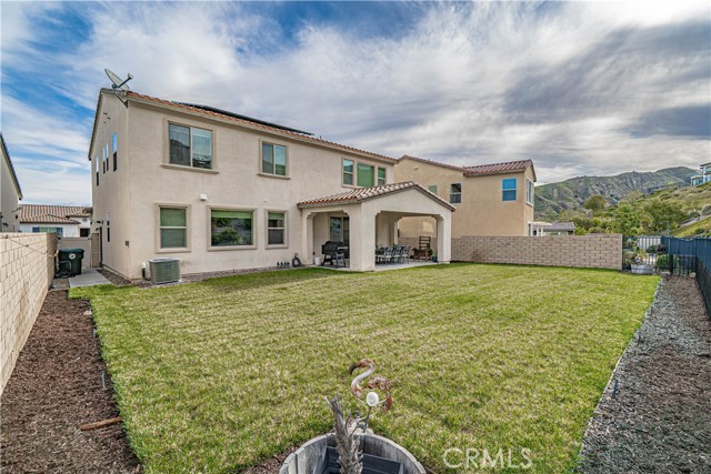 Stunning Mediterranean-Style Home in the Desirable Aliento Gated Community! Beautiful 4-bedroom, 3-bathroom home offers a perfect blend of modern amenities and traditional charm. ALL-NEW LVP FLOORING AND HIGH-PROFILE BASEBOARDS DOWNSTAIRS!! One bedroom and a full bathroom on the main floor, it’s ideal for guests or extended family. Step into the inviting foyer and be greeted by a spacious open floor plan, wood-look laminate flooring, and soaring ceilings. Living room features double sliding glass doors that open to a covered Arizona-style outdoor living space and a pool-sized rear yard—perfect for entertaining or relaxing outdoors. The gourmet kitchen is a true centerpiece, boasting a large center island with breakfast bar seating, granite countertops, stainless steel sink, pendant lighting, abundant cabinetry, high-end stainless steel appliances, a custom tile backsplash, and an extended counter area. Large pantry and a butler’s pantry provide plenty of storage and entertaining space. Just off the kitchen, an office nook with a built-in desk offers a convenient work-from-home solution. Upstairs, you’ll find a versatile loft area (could be a fifth bedroom), two additional bedrooms, and a spacious hallway bathroom with a double sink vanity. The luxurious primary suite is filled with natural light, features a large walk-in closet, and a spa-like bathroom with quartz countertops, dual vanity, soaking tub, and separate walk-in shower with seamless glass doors. Additional features include recessed lighting, dual-controlled central AC/heat, tankless water heater, upstairs laundry, and a two-car direct access garage. Solar panels enhance energy efficiency. Residents of the gated Aliento community enjoy an exceptional array of resort-like amenities. The Terrace, the community’s recreation area, has a clubhouse, lap and family swimming pools, children’s splash pad, poolside cabanas, fitness center, bocce ball courts, and outdoor recreation spaces.? Green spaces and lawns provide plenty of room for outdoor play, picnics, and community events, along w/ barbecue areas and fire pits.?Scenic walking and hiking trails wind throughout the community and connect to nearby public trailheads, offering miles of pathways to explore the foothills.? A dog park within Aliento provides a fun, social space for four-legged residents. All of these outstanding amenities are included for homeowners through one low HOA fee, making Aliento a true lifestyle destination in Santa Clarita.