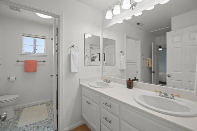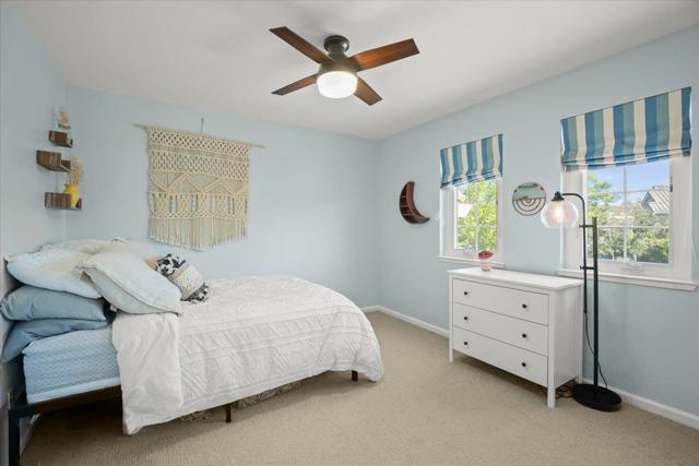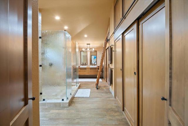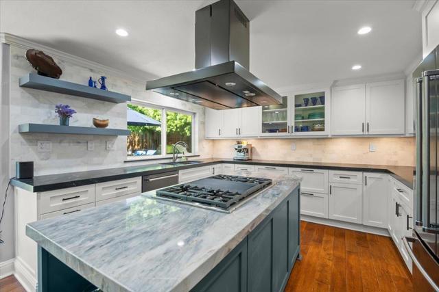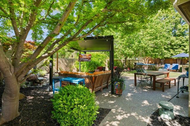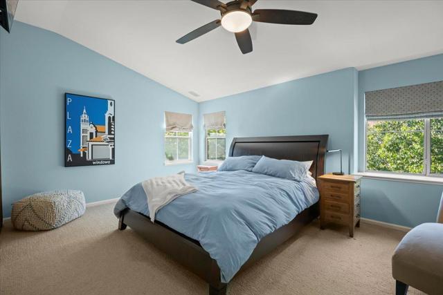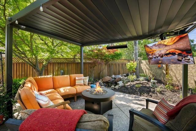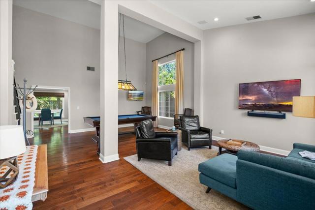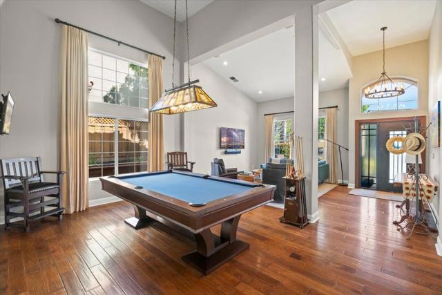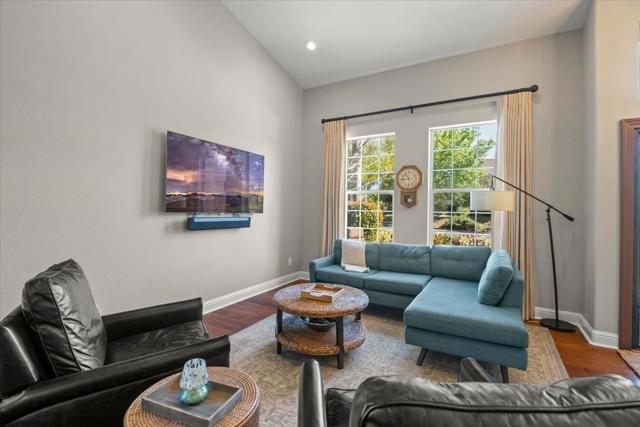 Nestled within the prestigious, gated SCVCC. A grand entry opens to light-filled living and dining areas with soaring ceilings. The updated kitchen is a chefs dream, featuring custom cabinetry, slab granite countertops, and a stunning slab quartzite island. The adjacent family room offers built-in bespoke cabinetry, a bar area, and a wine refrigerator. A versatile main-level bedroom or office includes custom built-ins, a Murphy bed, and a fully remodeled bath, providing flexibility for guests or remote work. Upstairs, the spacious primary suite with a spa-inspired bathroom, showcasing a custom walk-in shower, dual vanities with vessel sinks, and designer finishes. Custom closets offer exceptional organization. Two additional bedrooms share a Jack-and-Jill bathroom. Step outside to a private resort-style backyard. A custom river rock fountain sets a tranquil tone, while the covered loungeappointed for television and heating. Entertain with ease at the built-in BBQ, unwind in the spa, or practice your short game on the putting green. A discreetly placed gated dog run enhances everyday convenience. Additional features include engineered hardwood flooring, owned solar panels, some newer windows, and a three-car garage with epoxy flooring and extensive built-in storage.