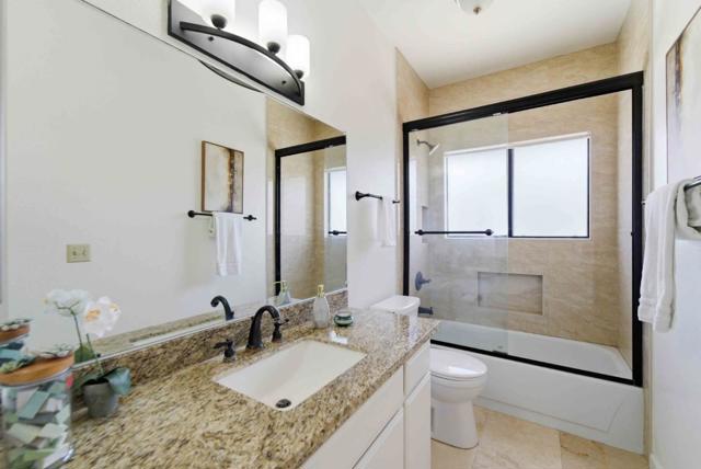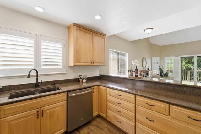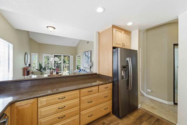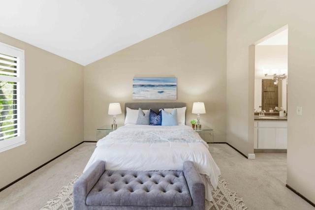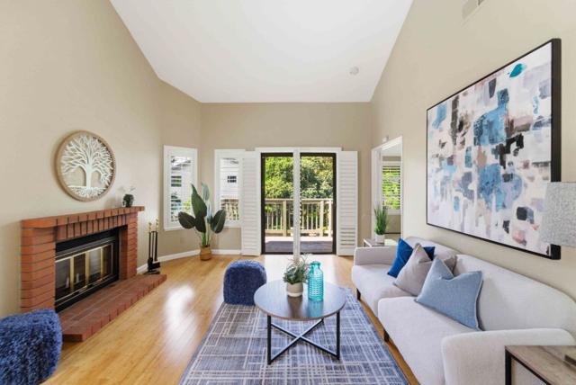 Welcome to a bright home, with vaulted ceilings, lots of windows, and an abundance of natural light. Living room features beautiful plantation shudders, a charming brick-faced, wood-burning fireplace and is an open, connected space to the kitchen, ideal for both everyday living and entertaining. Kitchen is designed for both function and style with lots of countertops, bar seating, GE stainless steel appliances, including an electric five-burner stove, plenty of cabinet storage with pull-out drawers for an efficient kitchen. Bedrooms are on opposite sides, offering maximum privacy. Primary suite features vaulted ceilings, plantation shutters, and French doors. Primary bath has large dual sink vanity with great storage, walk-in shower and a generous walk-in closet. Second bedroom has plenty of natural light and is perfect for guests, a home office, or additional living space. Home also has A/C, closet space and an in-unit washer and dryer. Home is located in the Miramar Terrace Gated community with pool, fitness center, clubhouse, and 2 secure parking spaces. HOA covers water, garbage, heating, exterior maintenance, and more. Great location allows easy access to Tech companies, shopping, dining, and access to commuter roads. Perfect blend of comfort, style, and location!