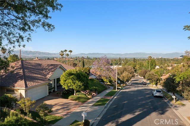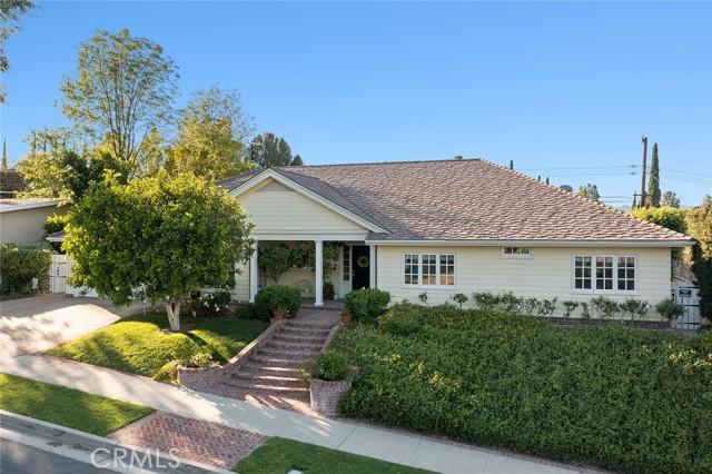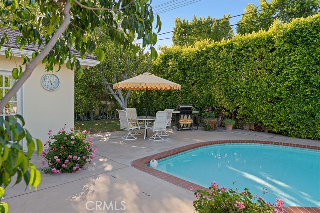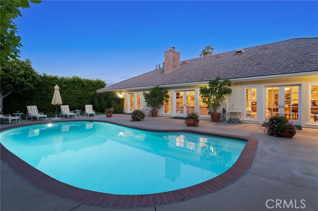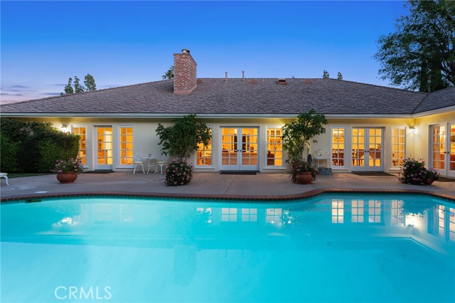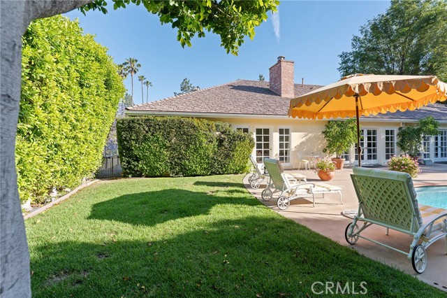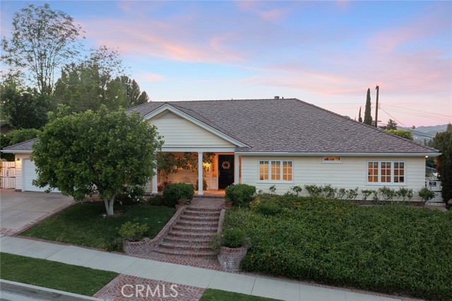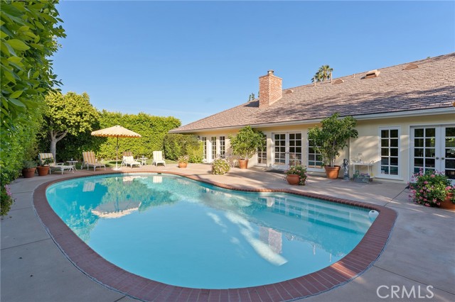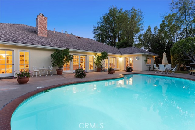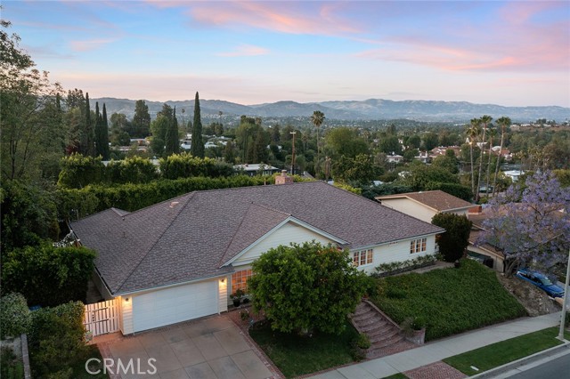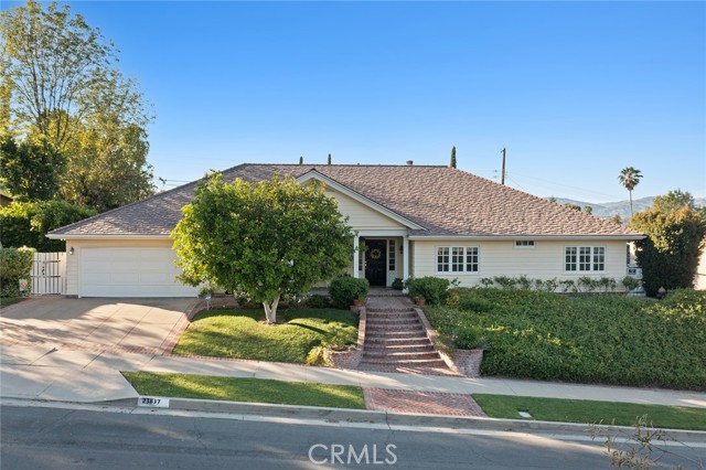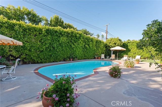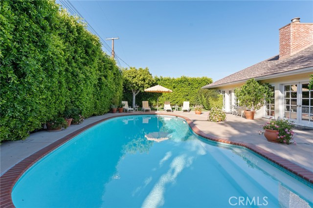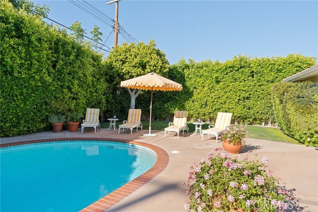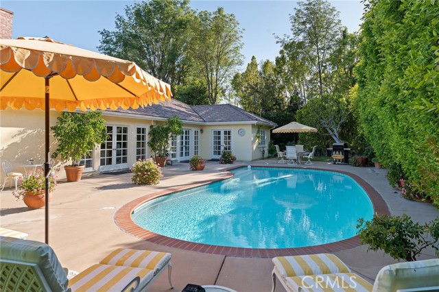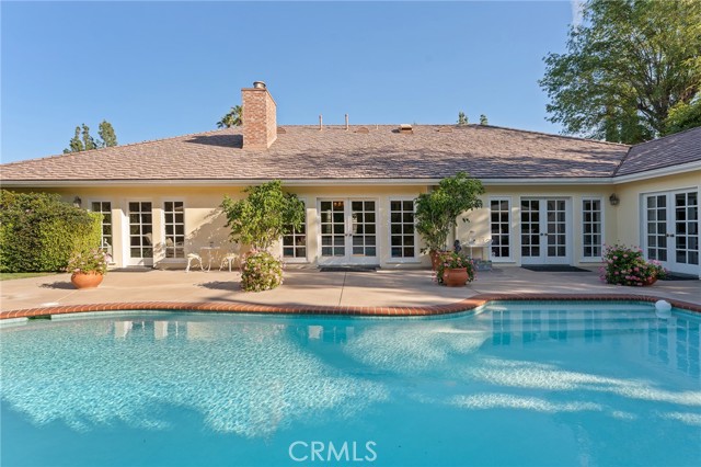 Picture perfect and extremely private single story pool home boasting incredible layout with 4 rare en-suite bedrooms! This Charles Du Bois meticulously upgraded property sits elevated above street level with 100 feet of impressive frontage and impeccable curb appeal including lush landscaping, driveway that leads to the 2-car attached garage, and brick front porch. Step inside to find a grand entry foyer that opens directly to the spacious living room flooded with natural light featuring high vaulted ceiling, French doors that open to the backyard, wood mantled tiled fireplace flanked by custom display cabinetry, and real wood flooring found throughout. A separate formal dining room can accommodate large dinner parties and has high vaulted ceiling and another set of French doors that open to the yard. The oversized kitchen has center island with second prep sink, stainless appliances including double ovens and 6-burner stove + griddle, custom pine wood cabinetry with pantry space, and separate breakfast nook. There are four well appointed bedrooms, each with their own private bathrooms and custom closets. One bedroom wing houses three of the bedroom suites with incredible extra wide hallway with several fantastic linen closets with built-ins. The luxurious primary suite has high vaulted ceiling, French door that opens to the yard, large walk-in closet with built-ins, and en-suite bathroom with dual vanities + makeup counter, bath tub, walk-in shower, and separate toilet room with bidet. The other two secondary bedrooms on the main wing each have full bathrooms with bath tubs and showers. The fourth bedroom is located on its own separate wing ideal for guests/office/flex space with an en-suite bathroom that can also be used as a pool bath, exterior access to a beautifully landscaped side yard, and French doors that open to the pool. The expansive laundry room has utility sink and custom storage cabinetry. There is also direct access to the finished 2-car garage with incredible attic storage space. The sprawling extremely private backyard features sparkling swimming pool, patio for outdoor dining, two grass lawns, large side yard adorned with beautiful landscaping and overhead string lights, and wraparound towering hedging that creates a truly private ambiance. Adjacent to Westfield Mall/Village, Calabasas Commons, Warner Center with the new Rams Village in development, local parks/hiking trails, & zoned for award-winning El Camino & Hale charter schools.