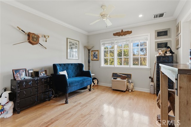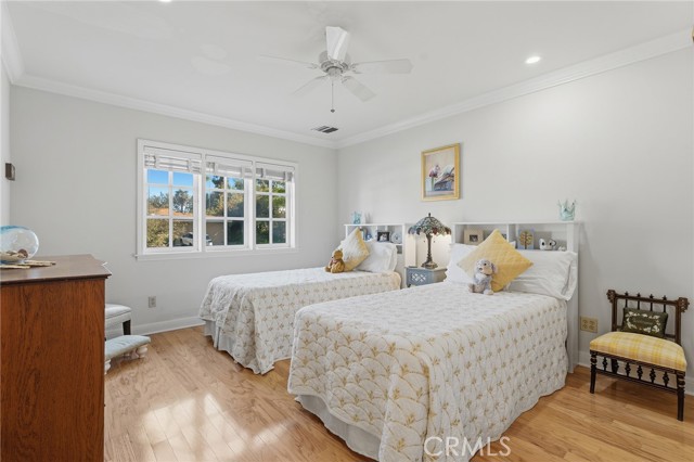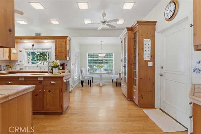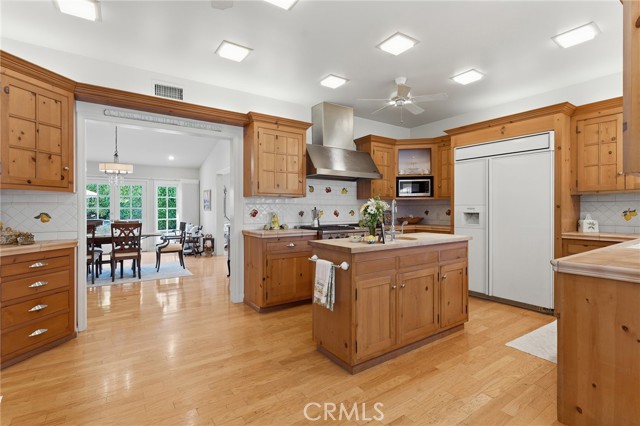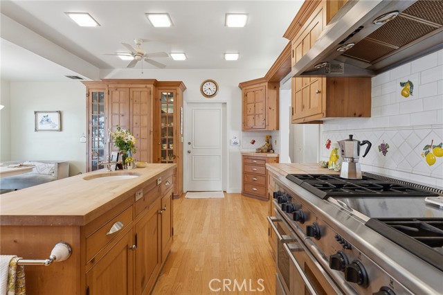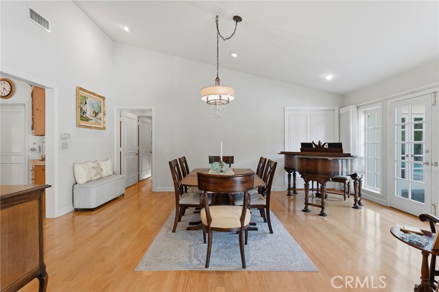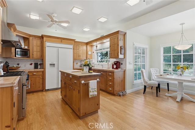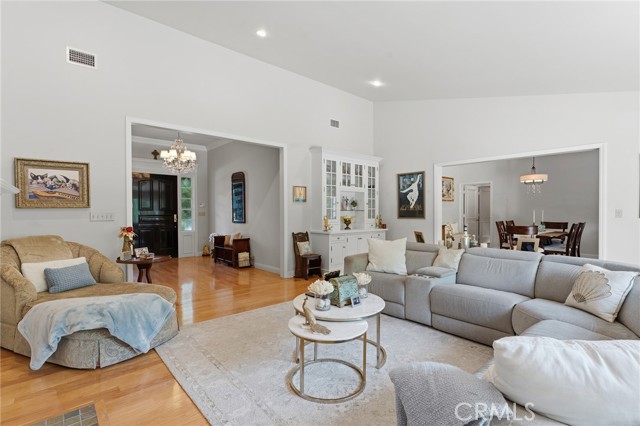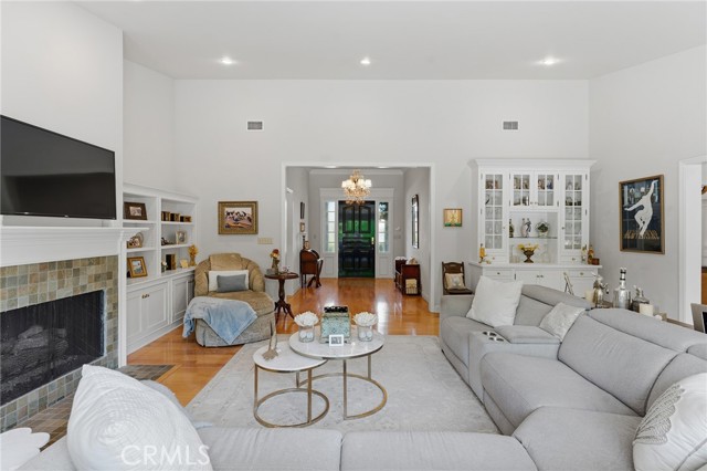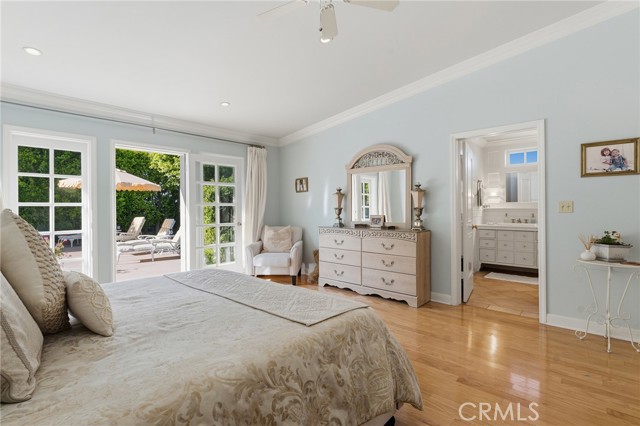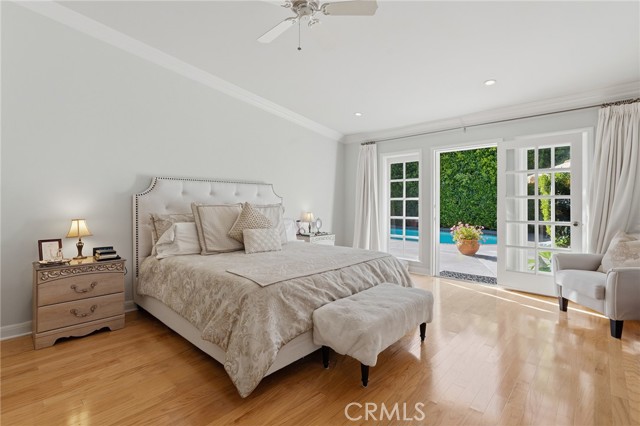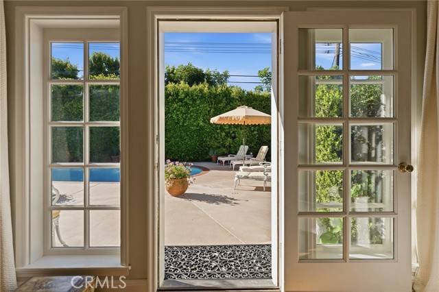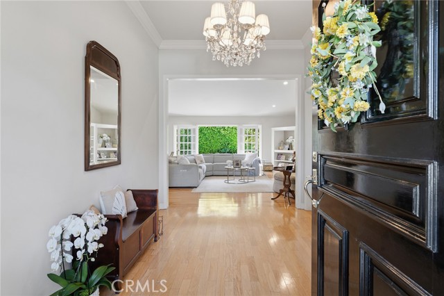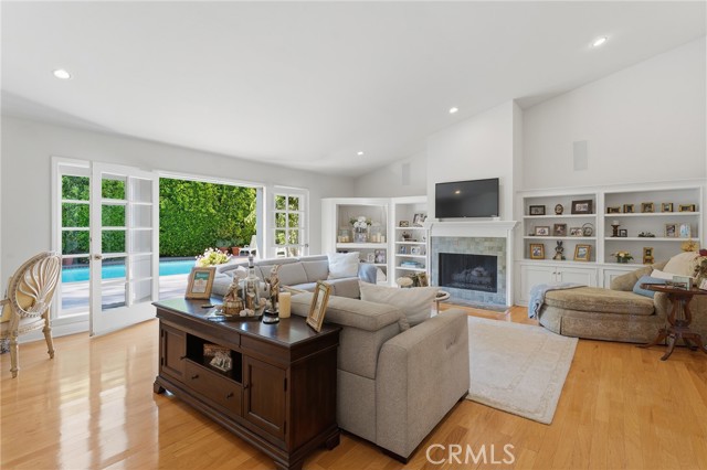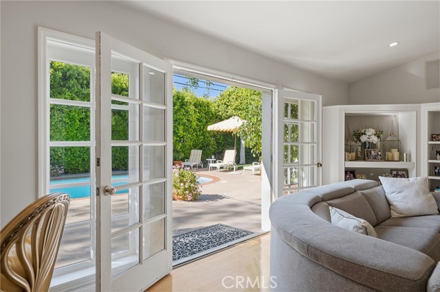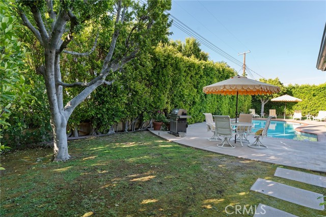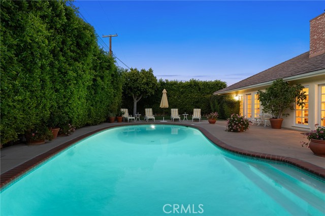Picture perfect and extremely private single story pool home boasting incredible layout with 4 rare en-suite bedrooms! This Charles Du Bois meticulously upgraded property sits elevated above street level with 100 feet of impressive frontage and impeccable curb appeal including lush landscaping, driveway that leads to the 2-car attached garage, and brick front porch. Step inside to find a grand entry foyer that opens directly to the spacious living room flooded with natural light featuring high vaulted ceiling, French doors that open to the backyard, wood mantled tiled fireplace flanked by custom display cabinetry, and real wood flooring found throughout. A separate formal dining room can accommodate large dinner parties and has high vaulted ceiling and another set of French doors that open to the yard. The oversized kitchen has center island with second prep sink, stainless appliances including double ovens and 6-burner stove + griddle, custom pine wood cabinetry with pantry space, and separate breakfast nook. There are four well appointed bedrooms, each with their own private bathrooms and custom closets. One bedroom wing houses three of the bedroom suites with incredible extra wide hallway with several fantastic linen closets with built-ins. The luxurious primary suite has high vaulted ceiling, French door that opens to the yard, large walk-in closet with built-ins, and en-suite bathroom with dual vanities + makeup counter, bath tub, walk-in shower, and separate toilet room with bidet. The other two secondary bedrooms on the main wing each have full bathrooms with bath tubs and showers. The fourth bedroom is located on its own separate wing ideal for guests/office/flex space with an en-suite bathroom that can also be used as a pool bath, exterior access to a beautifully landscaped side yard, and French doors that open to the pool. The expansive laundry room has utility sink and custom storage cabinetry. There is also direct access to the finished 2-car garage with incredible attic storage space. The sprawling extremely private backyard features sparkling swimming pool, patio for outdoor dining, two grass lawns, large side yard adorned with beautiful landscaping and overhead string lights, and wraparound towering hedging that creates a truly private ambiance. Adjacent to Westfield Mall/Village, Calabasas Commons, Warner Center with the new Rams Village in development, local parks/hiking trails, & zoned for award-winning El Camino & Hale charter schools.