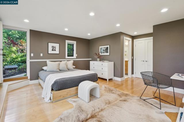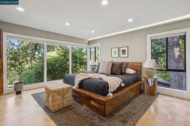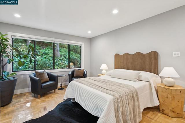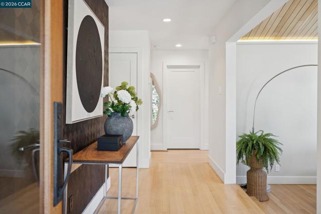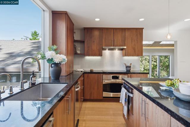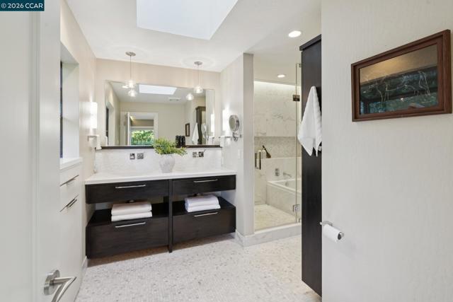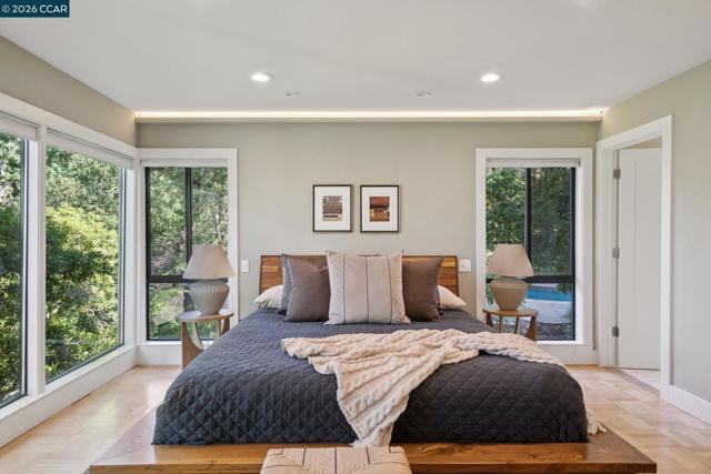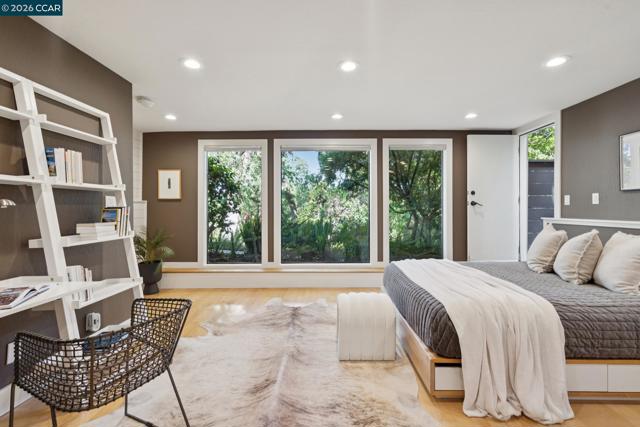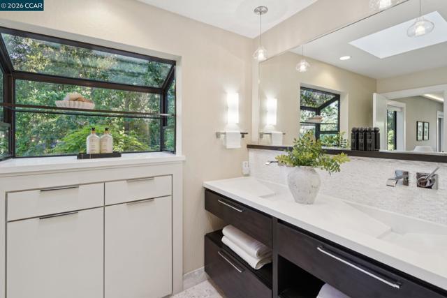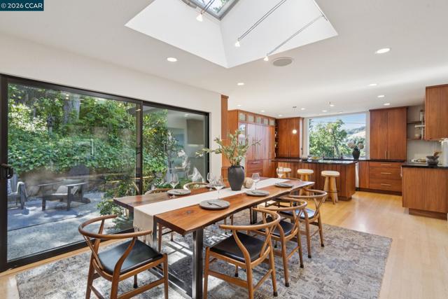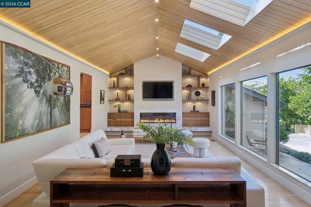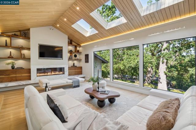 OPEN SAT 4/25 & SUN 4/26 @ 1-4 PM. Shaded beneath a canopy of mature oaks in the coveted Trail neighborhood, this masterfully crafted home offers refined interiors, resort-like grounds, and a peaceful setting just minutes from top-rated schools and downtown. Every detail reflects an impeccable level of workmanship seldom found today — from the custom wood ceiling and cabinetry to the designer bathrooms with bespoke tilework. An artistry that truly must be seen to be appreciated. Nowhere is this more evident than the main living space, which stuns with a soaring vaulted ceiling clad in warm wood, three skylights flooding the room with natural light, a sleek linear gas fireplace, custom built-in shelving, and intentional accent lighting. Floor-to-ceiling glass walls dissolve the boundary between inside and out, connecting effortlessly to the surrounding natural setting. Rich custom wood cabinetry, stone countertops, hill views from the kitchen window, and an oversized island anchor a kitchen designed for real cooking and easy gathering. The open dining area flows directly to the backyard through wide glass doors, indoor-outdoor living at its effortless best. The flexible two-level layout offers three bedrooms and three full baths, including a spa-like primary suite with a soaking tub and skylight, and a lower-level suite with private entrance. Outside, the property feels like a world apart. A lagoon-style pool sits amid ferns, flowering shrubs, and fruit trees, creating your own botanical garden retreat. A vegetable garden, multiple outdoor living areas, boat/RV parking, and generous storage round out a yard designed for both beauty and function. Set on an expansive 0.55 acres, this is Lafayette living at its finest.