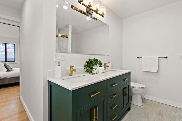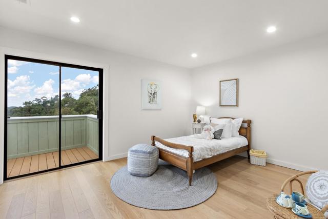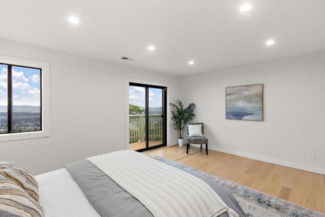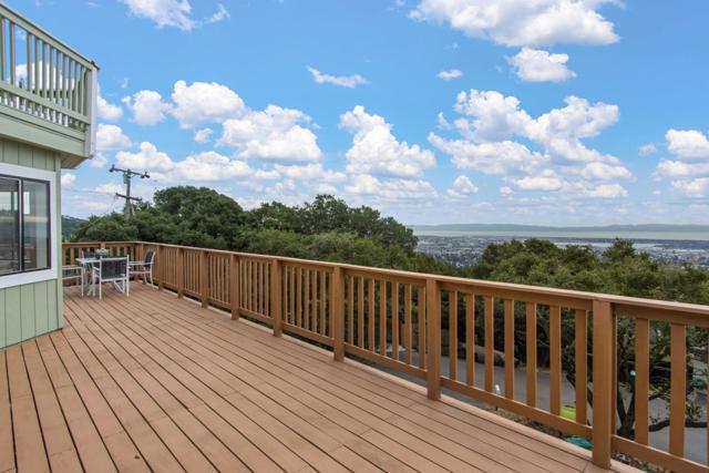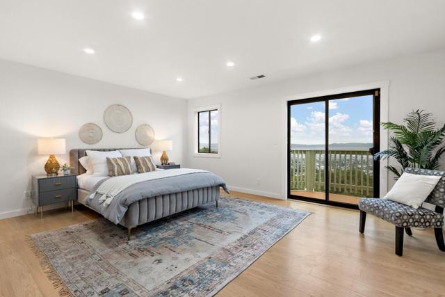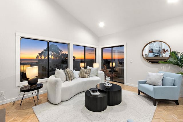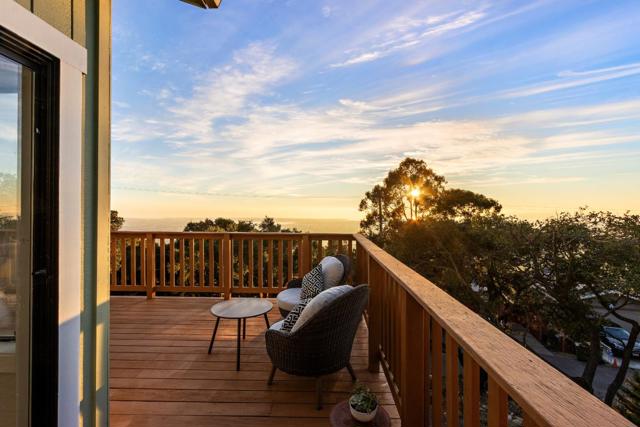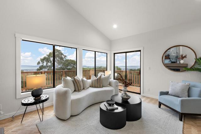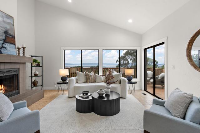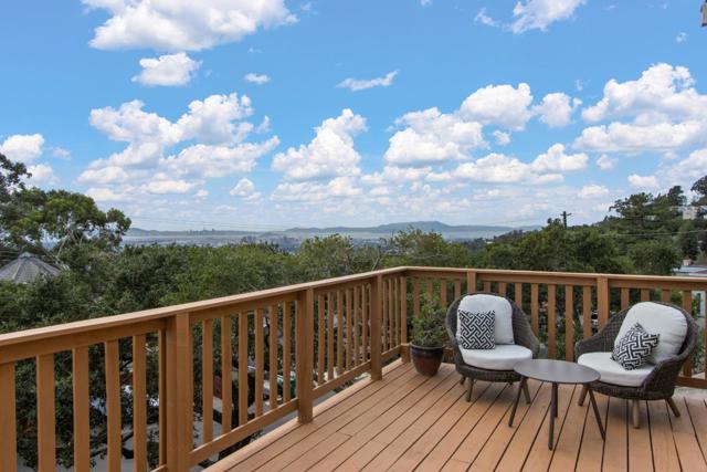 Come home to sweeping 180° Bay views, perfect for sipping wine at sunset on the expansive upper deck, where the beauty of the Bay takes center stage. Nestled on an approximately one-third acre hillside lot, this light filled retreat offers a serene setting with a true sense of escape. Warm hardwood floors span the main and upper levels, adding timeless character throughout. The remodeled kitchen features solid wood cabinetry in soft, refreshing teal tones and natural finishes, blending beauty with durability. Enjoy casual counter seating, a bonus pantry, and built in trash storage, all flowing seamlessly into the family room and out to the view deck. Wood-style porcelain tile in the kitchen and laundry offers both style and easy maintenance. Flexible living with two potential primary suites: the upper level showcases a beautifully remodeled bathroom, private view deck, and abundant natural light; the lower level offers a spacious retreat with potential for a kitchenette or office, plus a walk in closet and direct access to a private deck ideal for yoga, reading, or quiet mornings. The natural yard and patio create additional spaces to relax and unwind in this peaceful hillside setting. Truly an environment that must be experienced in person to fully appreciate.