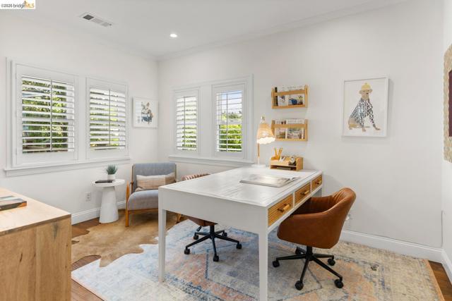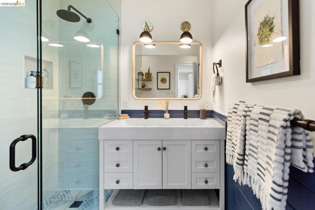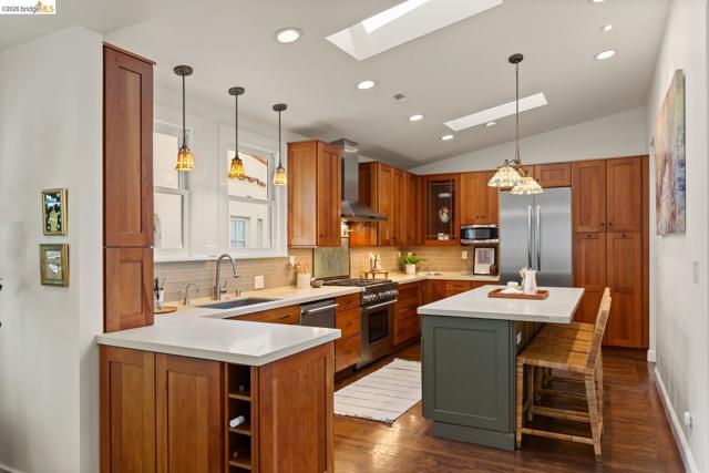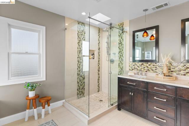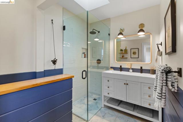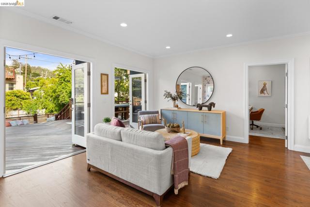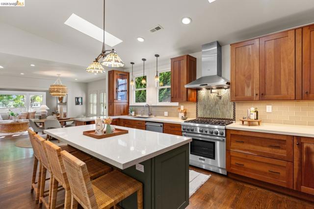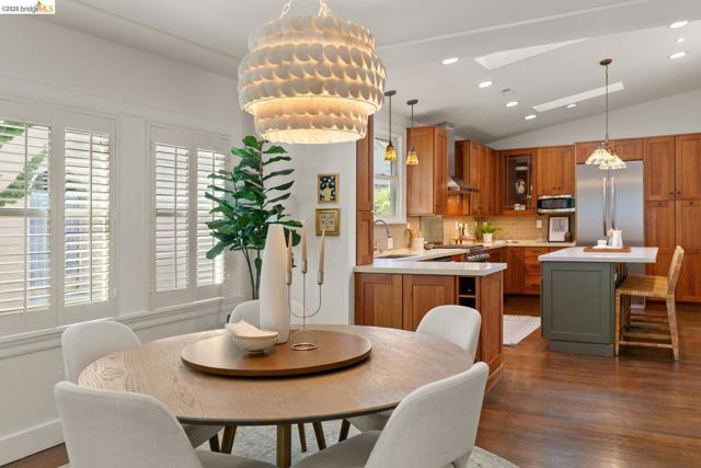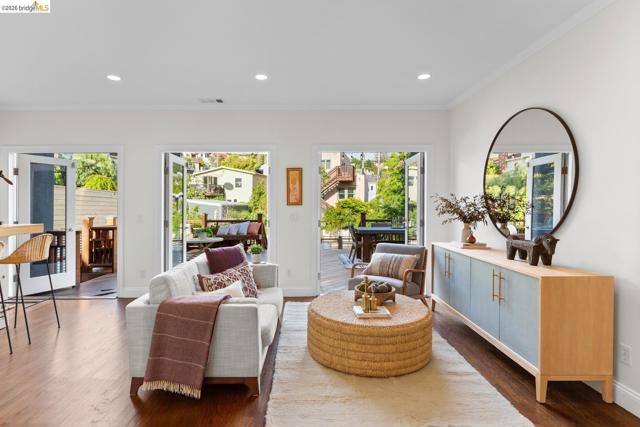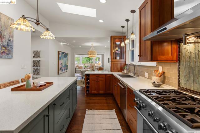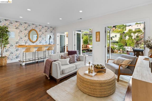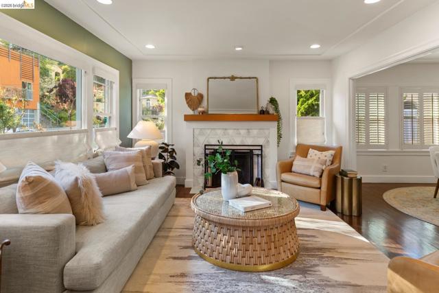 Elegant and extensively updated, this stunning and turn-key Rockridge home offers the perfect blend of luxury, comfort, and modern design. A seamless open floor plan connects the sophisticated living room with fireplace to a spacious dining area and a beautifully renovated chef’s kitchen featuring state-of-the-art appliances, stone countertops, custom cabinetry, vaulted ceilings with skylights, and an expansive island with breakfast bar. The main level includes two bright bedrooms, a stylish hall bath, and a serene primary suite overlooking the gardens, complete with a spa-inspired bath, soaking tub, separate shower, and generous walk-in closet. The lower level is designed for both relaxation and entertaining, with a large family room, built-in bar, and French doors opening to terraced decks and large level lawn areas for effortless indoor-outdoor living. An additional office or guest room, bedroom, and full bath provide flexibility for today’s lifestyle. Impeccably upgraded with new roof, electrical, plumbing, solar panels, EV charger, and outdoor heating and lighting. A garage and long driveway offer ample parking. Ideally located near Chabot Elementary, College Avenue shops, cafés, and easy commuter access - this is refined Rockridge living at its best.