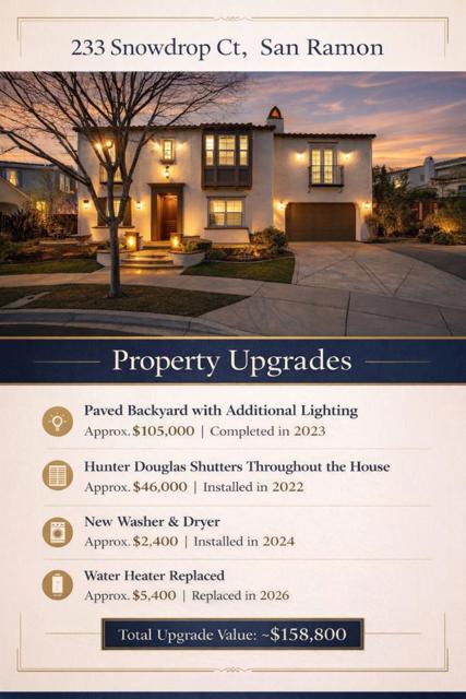 EAST facing! Beautifully upgraded 5-bedroom, 5.5-bathroom residence located in the highly sought-after Gale Ranch community of San Ramon. Designed for both comfort and elegance, this spacious home offers an exceptional layout ideal for modern family living. The home features a gourmet upgraded kitchen with premium finishes, ample cabinetry, and a large center island perfect for everyday living and entertaining. The open floor plan seamlessly connects the kitchen to bright and inviting living spaces filled with natural light. low-maintenance, fully paved backyard. Hunter Douglas shutters installed throughout the home. Enjoy movie nights or game days in the dedicated media room, providing the perfect space for entertainment and relaxation. Each bedroom offers generous space and privacy, with well-appointed bathrooms throughout the home. The home benefits from beautiful morning sunlight and excellent energy flow. The property is nestled in one of San Ramon's most desirable neighborhoods, known for its top-rated schools, scenic surroundings, parks, and family-friendly atmosphere. Gale Ranch offers a vibrant lifestyle with nearby trails, golf courses, shopping, dining, and easy access to major commuting routes, making it one of the best communities in the East Bay to raise a family.
