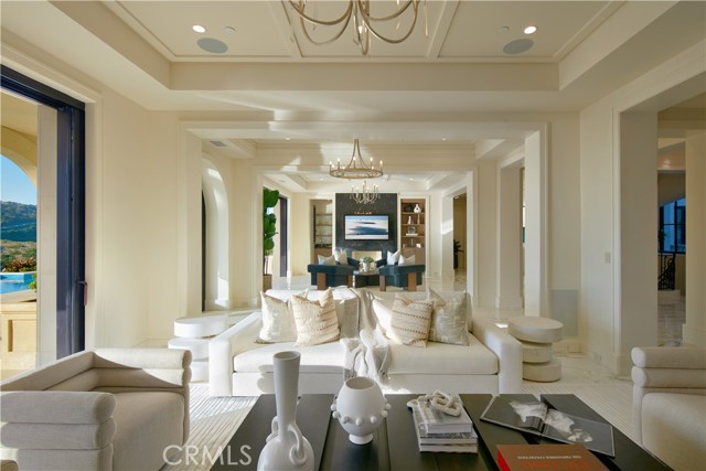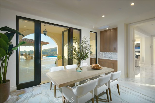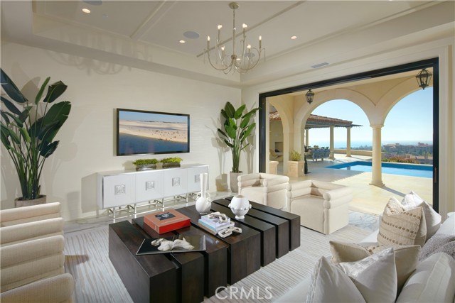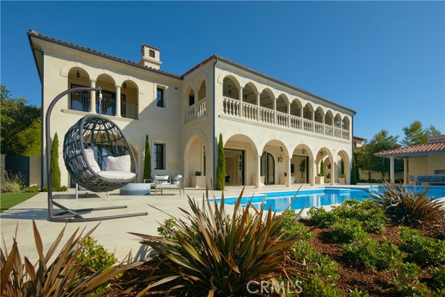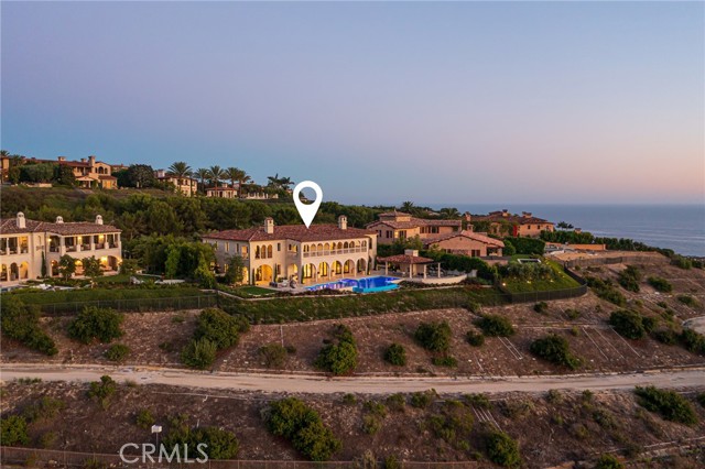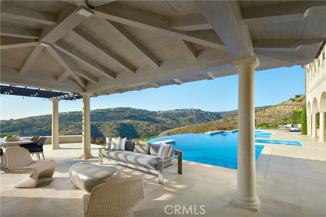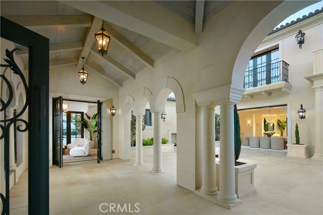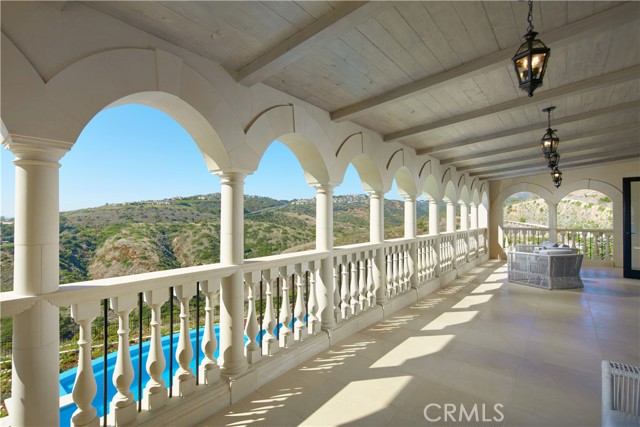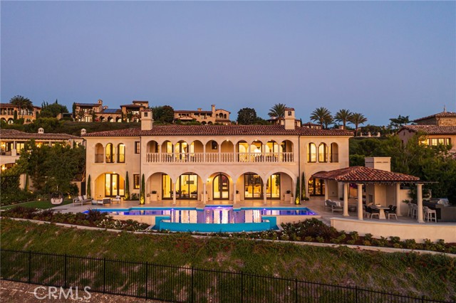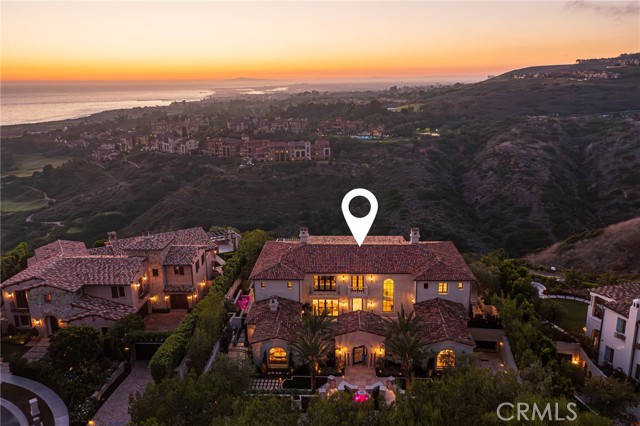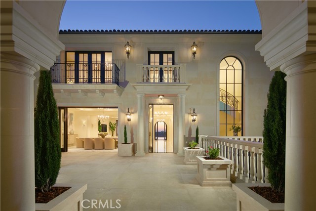 Crowning a coastal hill at the end of a private cul-de-sac behind double gates of the exclusive Estate Collection at Crystal Cove, this custom home is located on one of the most coveted streets in all of Newport Coast. Recalling the timeless prestige of a classic northern Italian villa, the grand residence is carefully positioned to capture breathtaking views. Impressive indoor and outdoor living areas frame panoramic vistas of the Pacific Ocean, Pelican Hill Golf Course, Newport Beach's harbor and channel, a verdant canyon, and romantic sunsets. First impressions are incomparable, with an oversized gated entry courtyard overlooking a lower-level courtyard and providing a private space for outdoor socializing, welcoming guests, and relaxing as the sea air refreshes. Served by a commercial-grade Garaventa Lift and highlighted by a stunning iron spiral staircase, the three-level residence embraces appx. 4,090 SF of balconies, decks, and courtyards, and appx. 11,765 SF of interiors which host seven en suite bedrooms and eight full and three-half baths. Enrichments include generously proportioned formal living and dining rooms, an office, wine cellar, 15-seat home theater, gym, maid's suite, guest house with private entrance, a secondary primary suite on the main level, and a subterranean garage spanning appx. 4,763 SF that can fit up to 15 cars. Calacatta marble flooring continues from living areas to a chef-inspired kitchen with top-of-the-line appliances, an oversized island, calacatta marble countertops, loggia, butler's pantry, and breakfast room. The primary suite opens to a covered ocean-view loggia and reveals an enormous walk-in closet, stone fireplace, espresso bar, and a luxurious five-star bath. Cantera limestone imported from Spain embellishes the exterior, while the interior offers Venetian plaster, Albertini windows and doors, book-matched Carrara marble, glass pocket doors to the outdoors, and custom alder cabinetry. Sparkling lights shine after dusk and lend enchantment to a massive vanishing-edge pool with glass tile, a fireplace-warmed cabana, loggias, large patios, and a built-in outdoor kitchen with a BBQ.