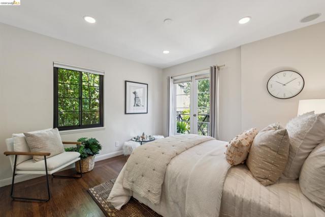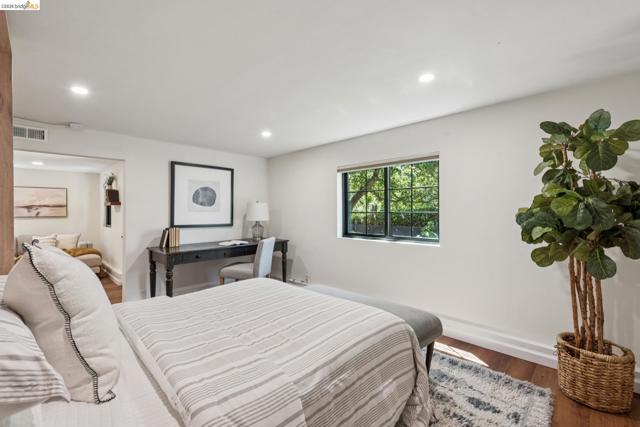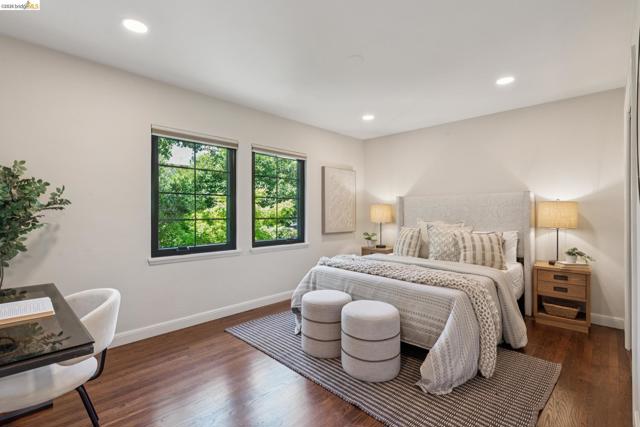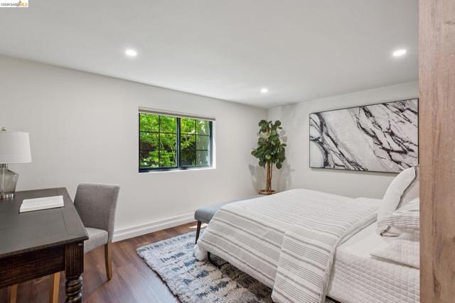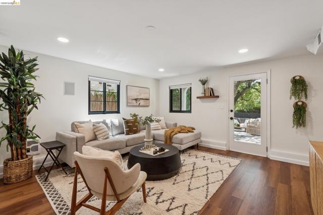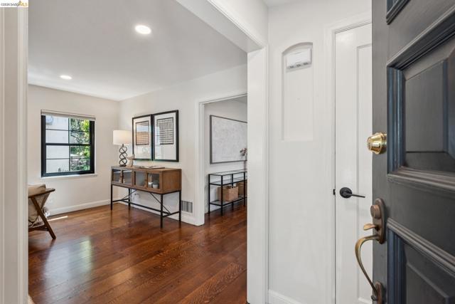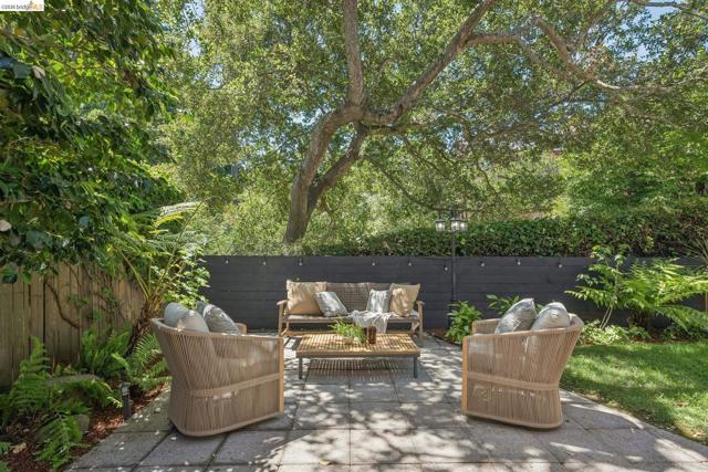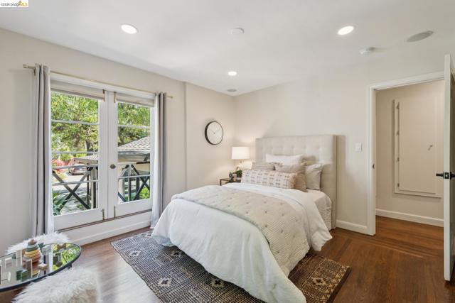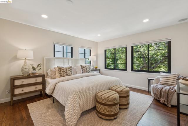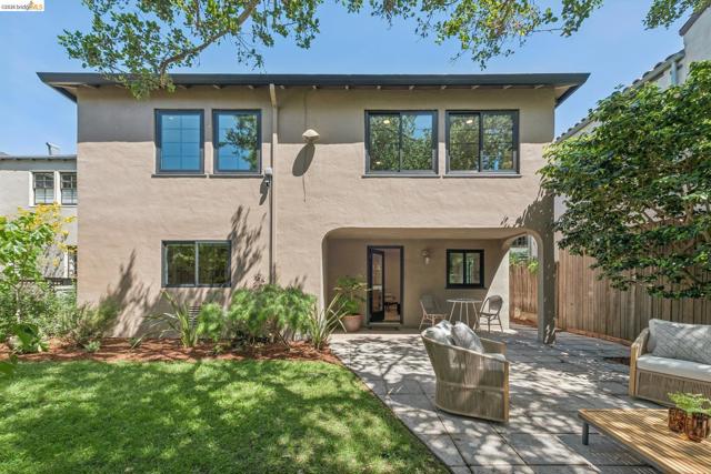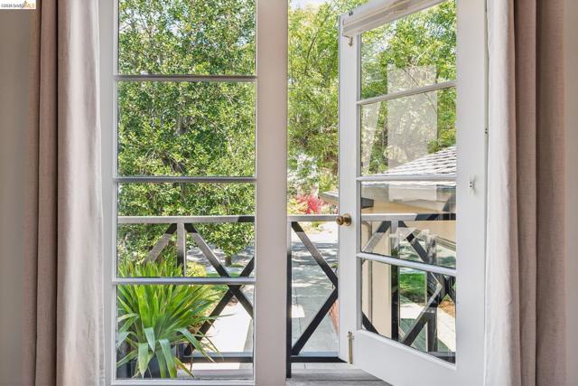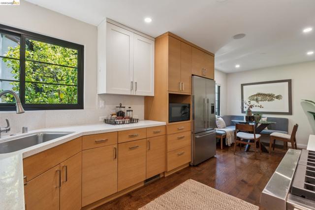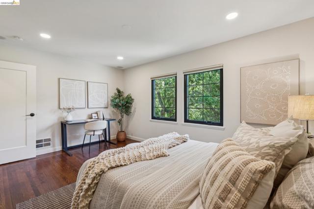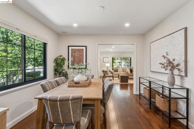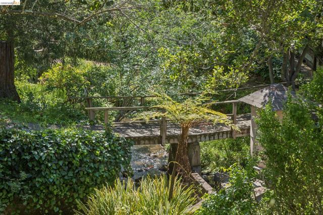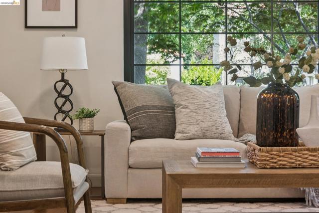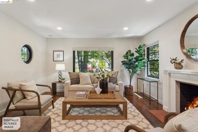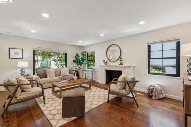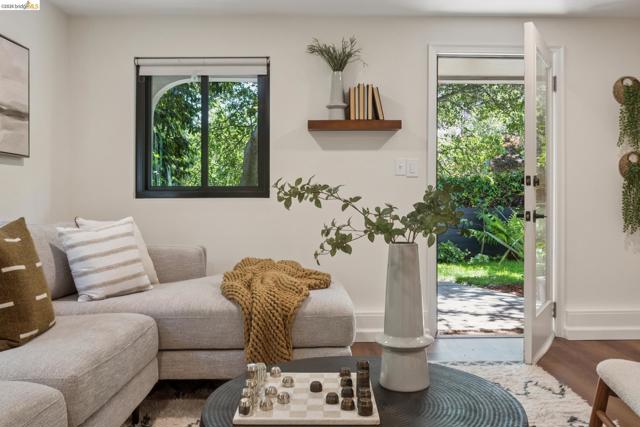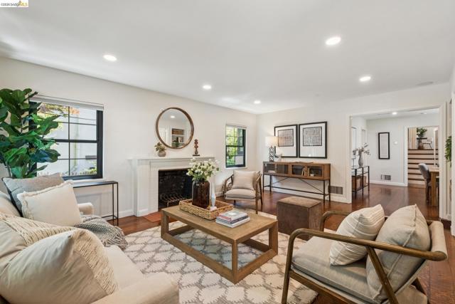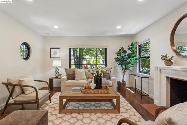 Built in 1941, this well-maintained Lower Rockridge home combines traditional architectural elements with modernized features. Quarter sawn oak floors imbue the home with warmth while upgraded Milgard windows add refinement. Featuring a flexible split level floor plan, the home offers 3+ bedrooms and 3 baths. The main level features a spacious living room with fireplace and built-ins, an inviting dining room & an updated eat-in kitchen with a Wolf range and quartz countertops. The upper-level includes a spacious primary suite with walk-in closet, a remodeled hallway bath, a bedroom with balcony and spacious bedroom overlooking the verdant rear yard. A family room, plus room with Murphy bed and remodeled bath on the lower level provides access to the rear yard and versatile space ideal for use as an additional guest room, home office and/or au pair. The backyard is a peaceful refuge with lush greenery, soothing sounds from Temescal Creek and a sense of privacy—ideal for relaxing or entertaining. Multiple upgrades include dual-pane Milgard windows, seismic retrofit, owned solar, air conditioning, sewer lateral and sidewalk compliance and gated side & rear yard. Blocks to College Ave dining, shops and BART. Walk Score 91!