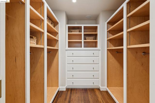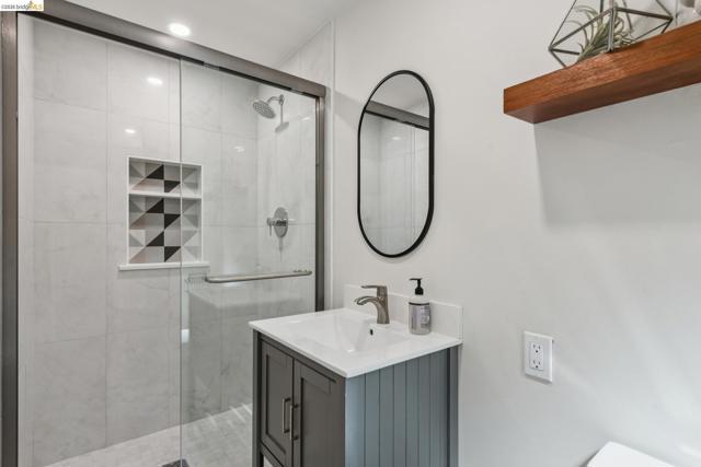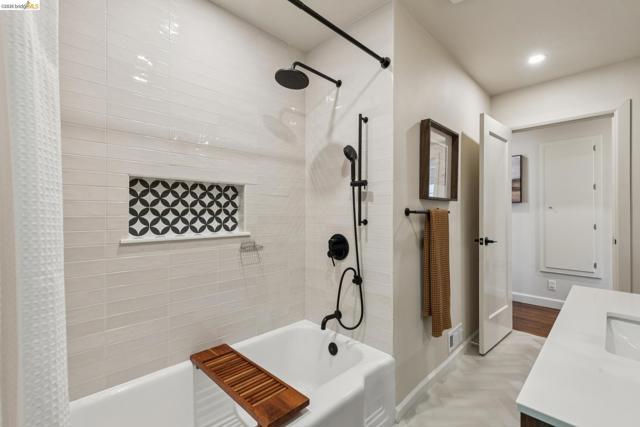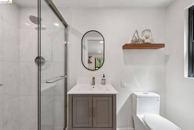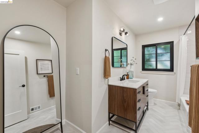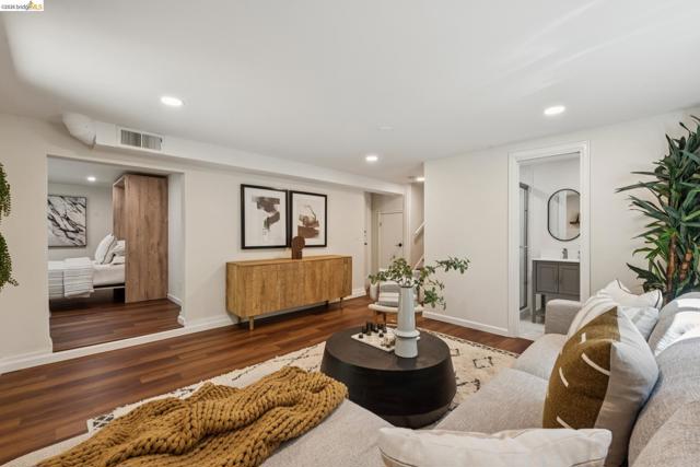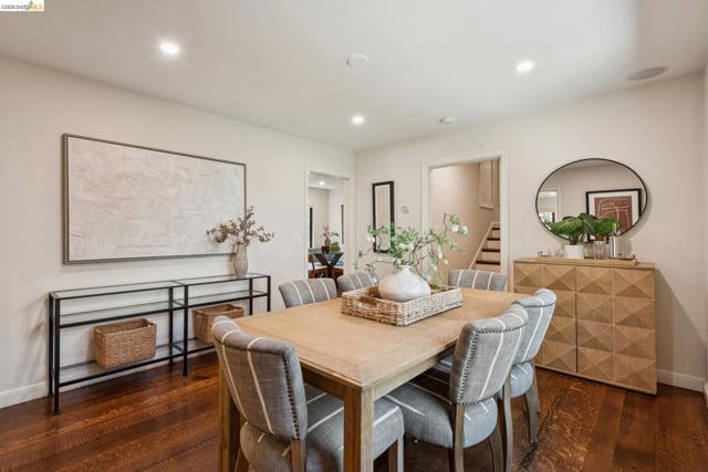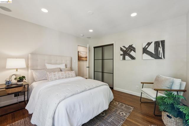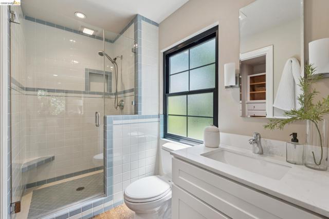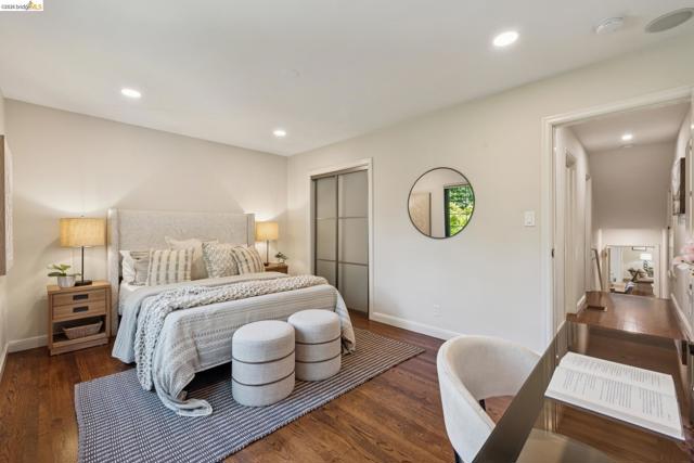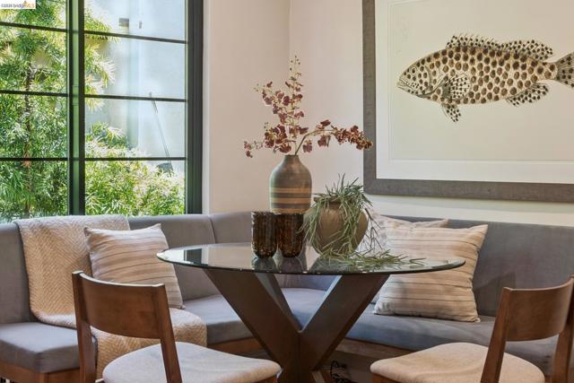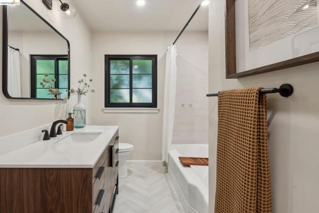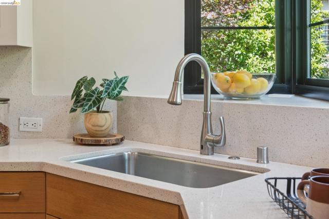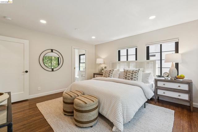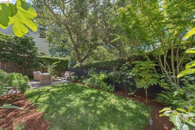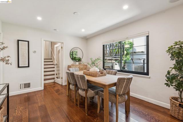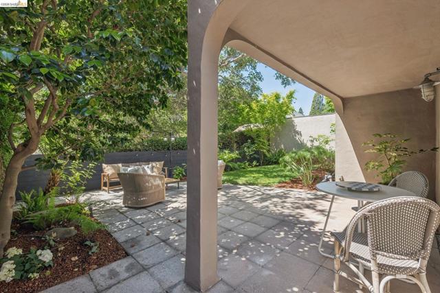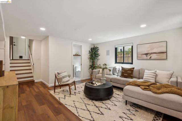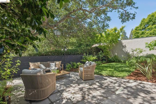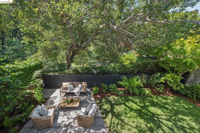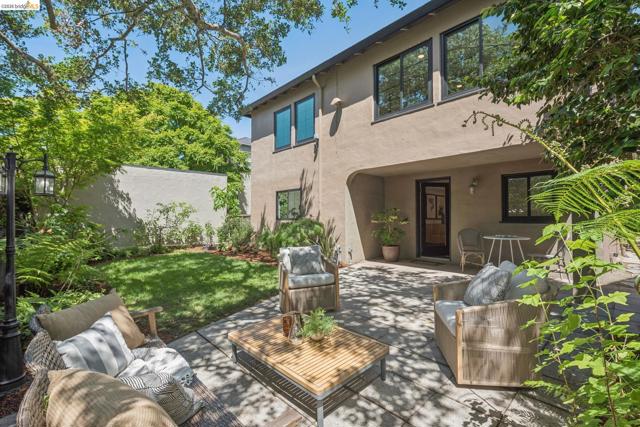 Built in 1941, this well-maintained Lower Rockridge home combines traditional architectural elements with modernized features. Quarter sawn oak floors imbue the home with warmth while upgraded Milgard windows add refinement. Featuring a flexible split level floor plan, the home offers 3+ bedrooms and 3 baths. The main level features a spacious living room with fireplace and built-ins, an inviting dining room & an updated eat-in kitchen with a Wolf range and quartz countertops. The upper-level includes a spacious primary suite with walk-in closet, a remodeled hallway bath, a bedroom with balcony and spacious bedroom overlooking the verdant rear yard. A family room, plus room with Murphy bed and remodeled bath on the lower level provides access to the rear yard and versatile space ideal for use as an additional guest room, home office and/or au pair. The backyard is a peaceful refuge with lush greenery, soothing sounds from Temescal Creek and a sense of privacy—ideal for relaxing or entertaining. Multiple upgrades include dual-pane Milgard windows, seismic retrofit, owned solar, air conditioning, sewer lateral and sidewalk compliance and gated side & rear yard. Blocks to College Ave dining, shops and BART. Walk Score 91!