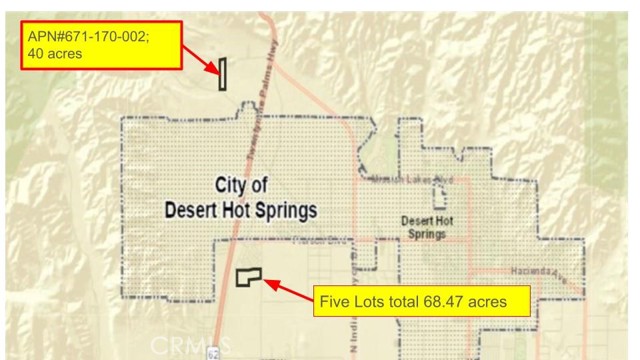 In total, these six parcels comprise 108.47 acres and are offered only at $885,000, this is a rare opportunity to acquire large-scale land at an attractive price. Conveniently located near California State Route 62 (62 Highway) and Pierson Blvd, the properties offer excellent accessibility and strong future growth potential. The offering includes five contiguous, flat, and regularly shaped parcels (APN# 667-220-028;033;034;035;036) totaling 68.47 acres, plus an additional 40-acre vacant lot (APN# 671-170-002) located on the west of 29 Palms Highway. Don't miss the prime investment opportunity in Desert Hot Springs, a rapidly growing city known for its natural mineral hot springs, scenic desert views, and rising demand for residential and resort-style developments.
