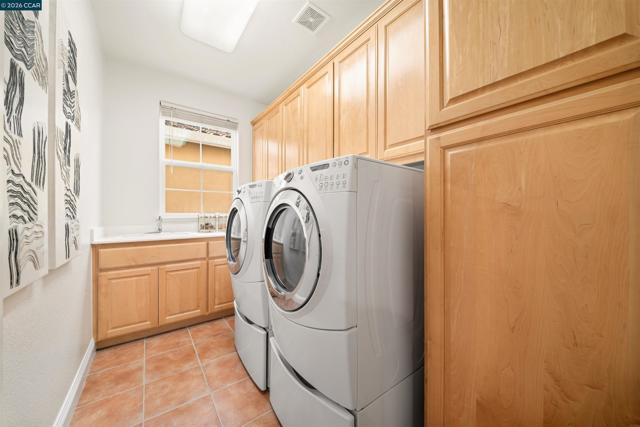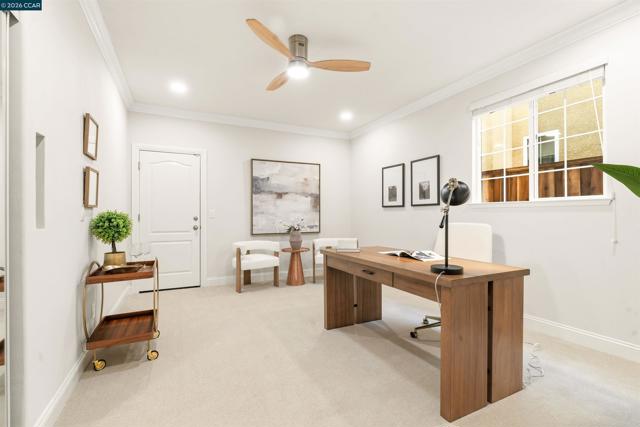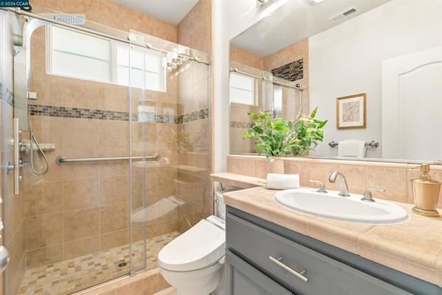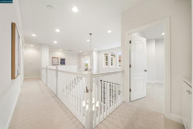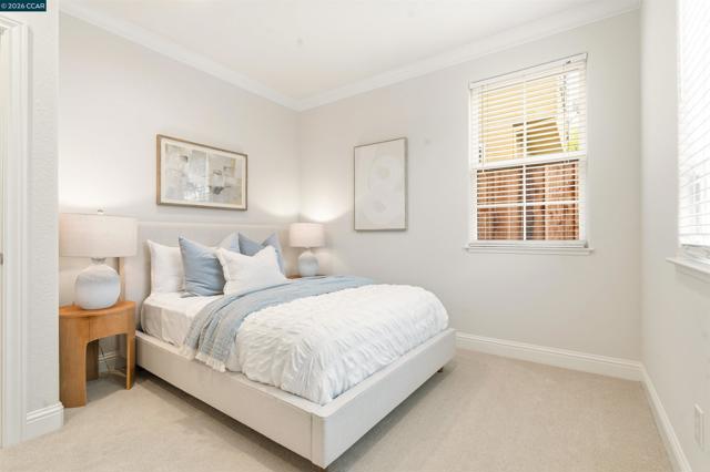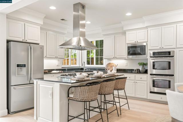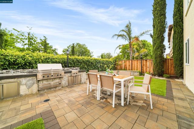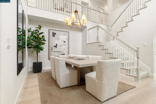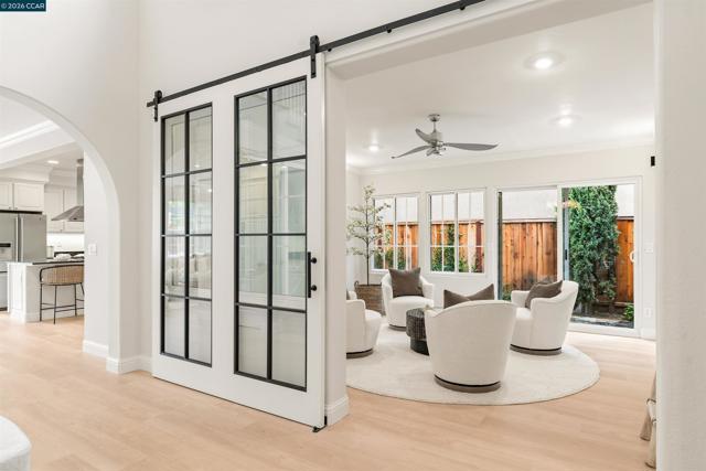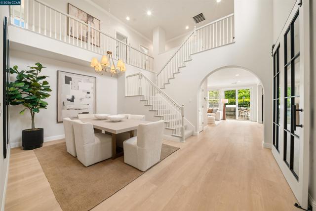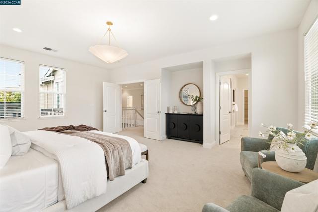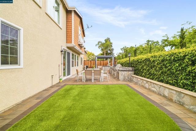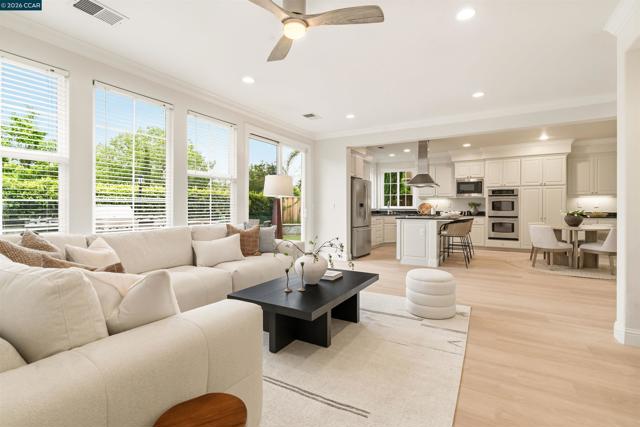 Welcome to this beautifully updated North-facing home in the highly sought-after Windemere Community of San Ramon, offering approximately 3,500 sq ft of thoughtfully designed living space on a 0.13-acre lot. Featuring 5 beds + office & 3 full baths, this home provides exceptional flexibility for modern living. From the charming front porch to the light-filled interiors, this home blends comfort and modern elegance throughout. Discover new flooring, plush new carpet, fresh interior paint, and stylishly updated light fixtures. Step into a bright and airy interior filled with natural light and soaring ceilings. The inviting living room features a cozy fireplace, creating a warm and welcoming atmosphere, while the formal dining room offers an elegant space perfect for gatherings and entertaining. The heart of the home is the spacious kitchen, featuring freshly painted cabinetry, a large center island with stovetop & sleek drop hood. Equipped with stainless steel appliances including built-in double ovens, built-in microwave, & refrigerator with ice maker. The kitchen opens seamlessly to the adjacent family room & an enclosed courtyard, now a versatile sunroom or extended dining space, complete with sliding farmhouse-style doors for added charm & flexibility. The main level offers a convenient bedroom & full bath, ideal for guests or multigenerational living. Additionally, the 3rd car garage has been thoughtfully converted into a bonus bedroom or private office, perfect for today’s work-from-home lifestyle. Upstairs, enjoy a dramatic walkway overlook & built-in hallway storage. The expansive primary suite is filled with natural light & offers a peaceful retreat, complemented by a luxurious bath with dual walk-in closets, a soaking tub with jets, stall shower, & dual sink vanity with abundant lighting. Three additional bedrooms & a sizable guest bath with dual sink vanities complete the upper level. Step outside to a low-maintenance backyard designed for entertaining. Highlights include a built-in outdoor kitchen with a premium Viking appliance package, featuring a grill, warming drawer, griddle, dual sinks, & built-in refrigerator, alongside a paved patio & a stylish pergola with privacy curtains for year-round enjoyment. Additional features include electrical solar and water softener system for enhanced everyday comfort. Conveniently located near top schools, shops, restaurants, parks, trails, & freeway access.