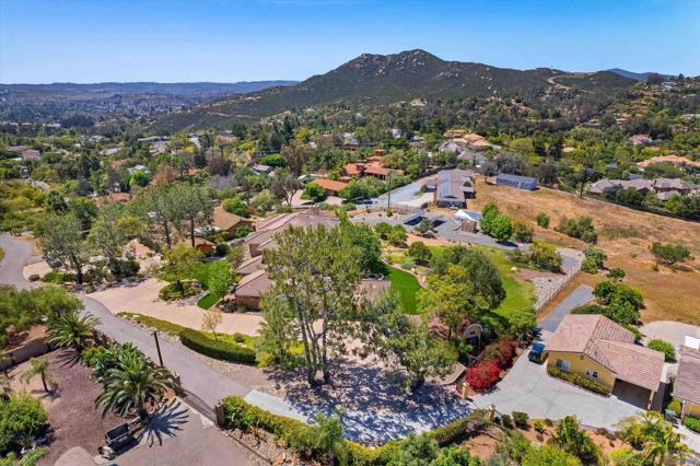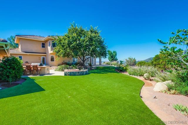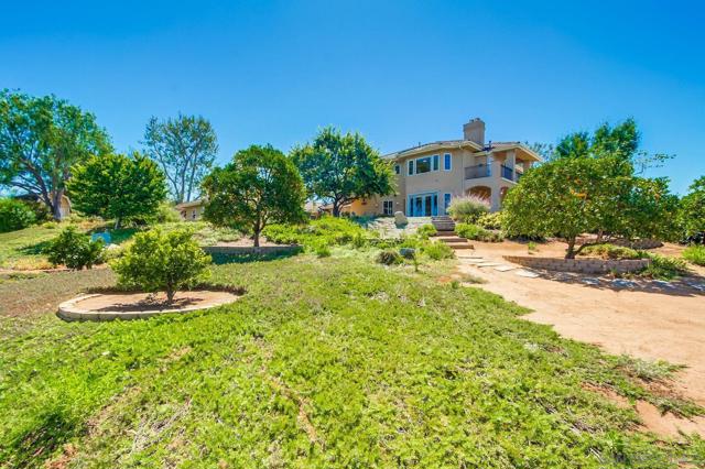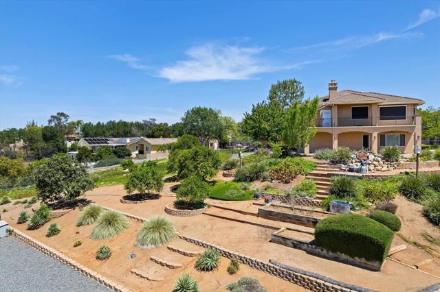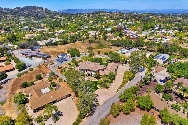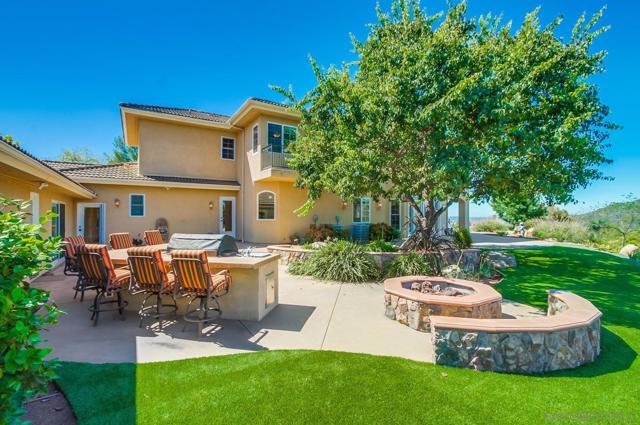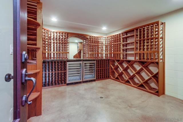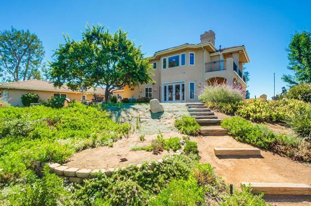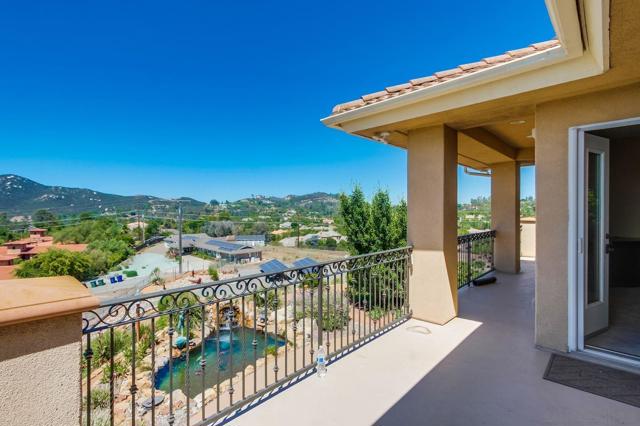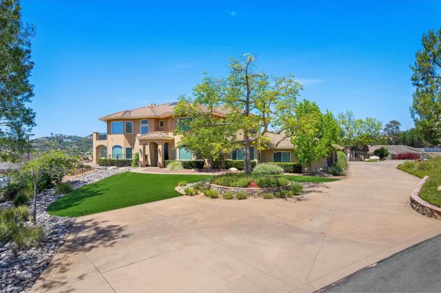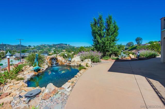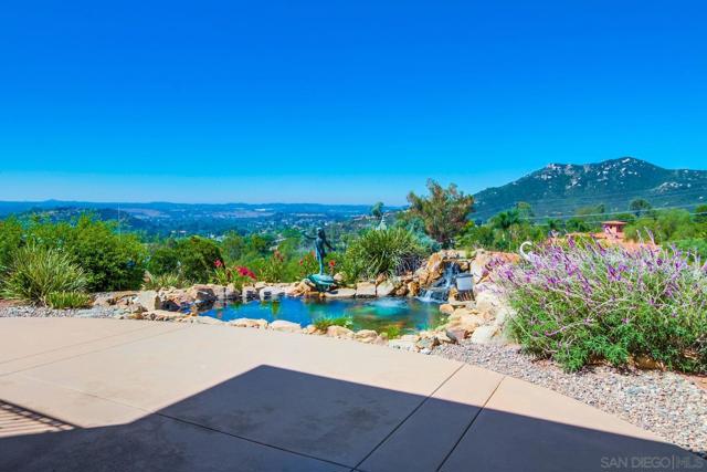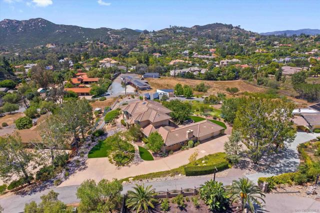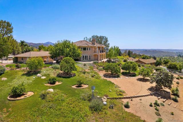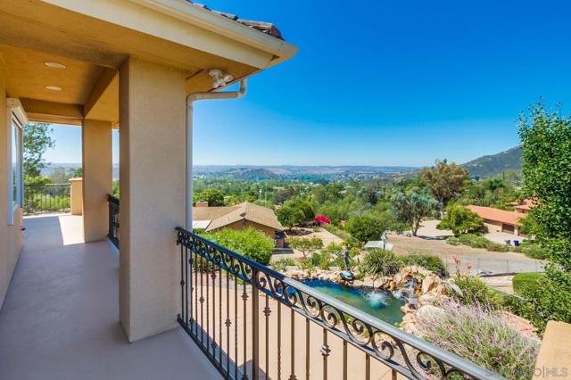 Constructed in 2004, this Mediterranean estate sits on 1.37 elevated acres in Poway with panoramic hill and valley views from virtually every room. The 5,595 sq ft residence includes a fully independent one-bedroom guest flat, a three-car garage, owned solar panels with Enphase battery backup, and grounds that encompass an ornamental koi pond, citrus orchard, terraced gardens, outdoor kitchen and gas fire pit. The level of craftsmanship, systems infrastructure, and thoughtful design throughout is exceptional. The chef's kitchen centers on a massive blue-green granite island with Miele appliances throughout, including built-in column refrigerator and freezer, a hand-carved range hood above an LP gas cooktop, and an artist-painted tile backsplash mural. The formal dining room wraps on three sides with curved windows framing unobstructed hill and valley views. A sweeping curved wrought iron staircase anchors the limestone entry foyer. Upstairs, the master suite includes a sitting room with fireplace and wet bar, a wraparound private terrace, an imported Rosso marble bath with soaking tub positioned before a bank of hill-view windows, a travertine walk-in shower, and a walk-in closet. Secondary bedrooms each have private baths and walk-in closets. A stone LP gas fire pit and citrus grove complete the outdoor program. A broad motor court accommodates eight or more vehicles. The wine cellar features 400-plus bottle redwood racking, dual built-in wine refrigerators, and a secondary storage room accessed through a speak-easy door.